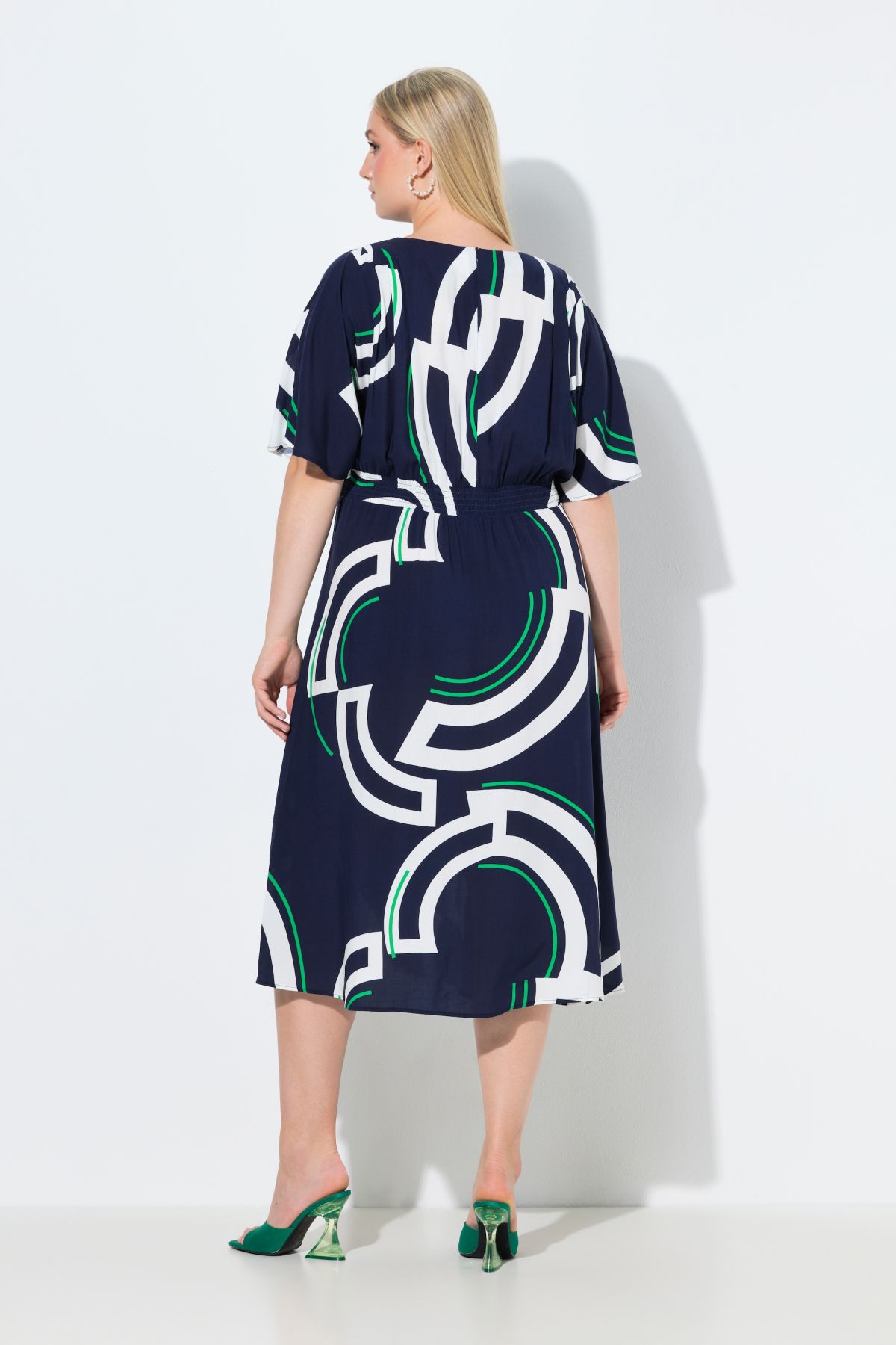 Midi dress, A-line with a comfortable hem width, made from high-quality sporty viscose with a graphic circular pattern. Highlight: decorative pleats above the waist. Boat neck with zipper in the back, wide, set-in half sleeves, long side slits – even more comfort.