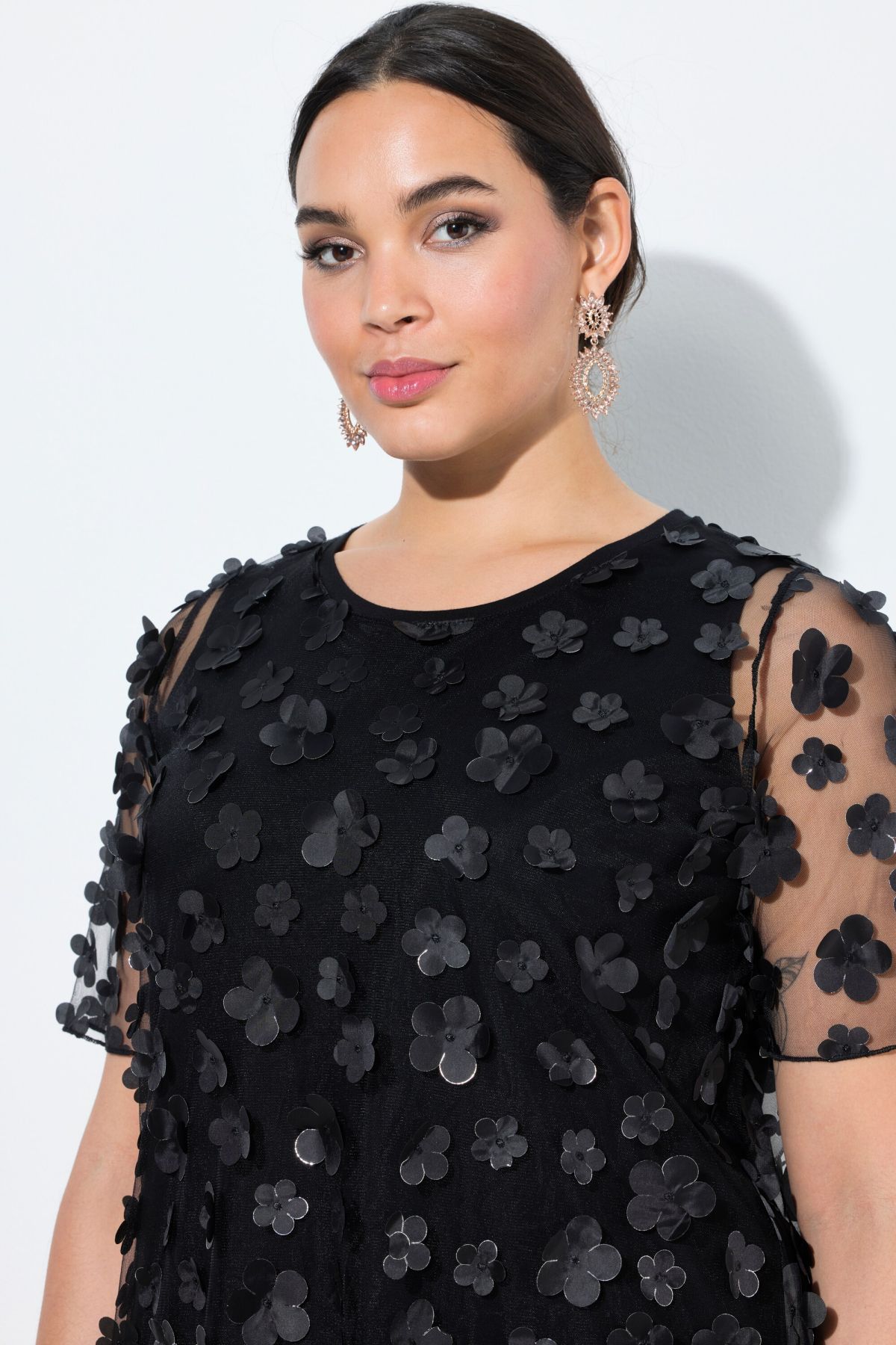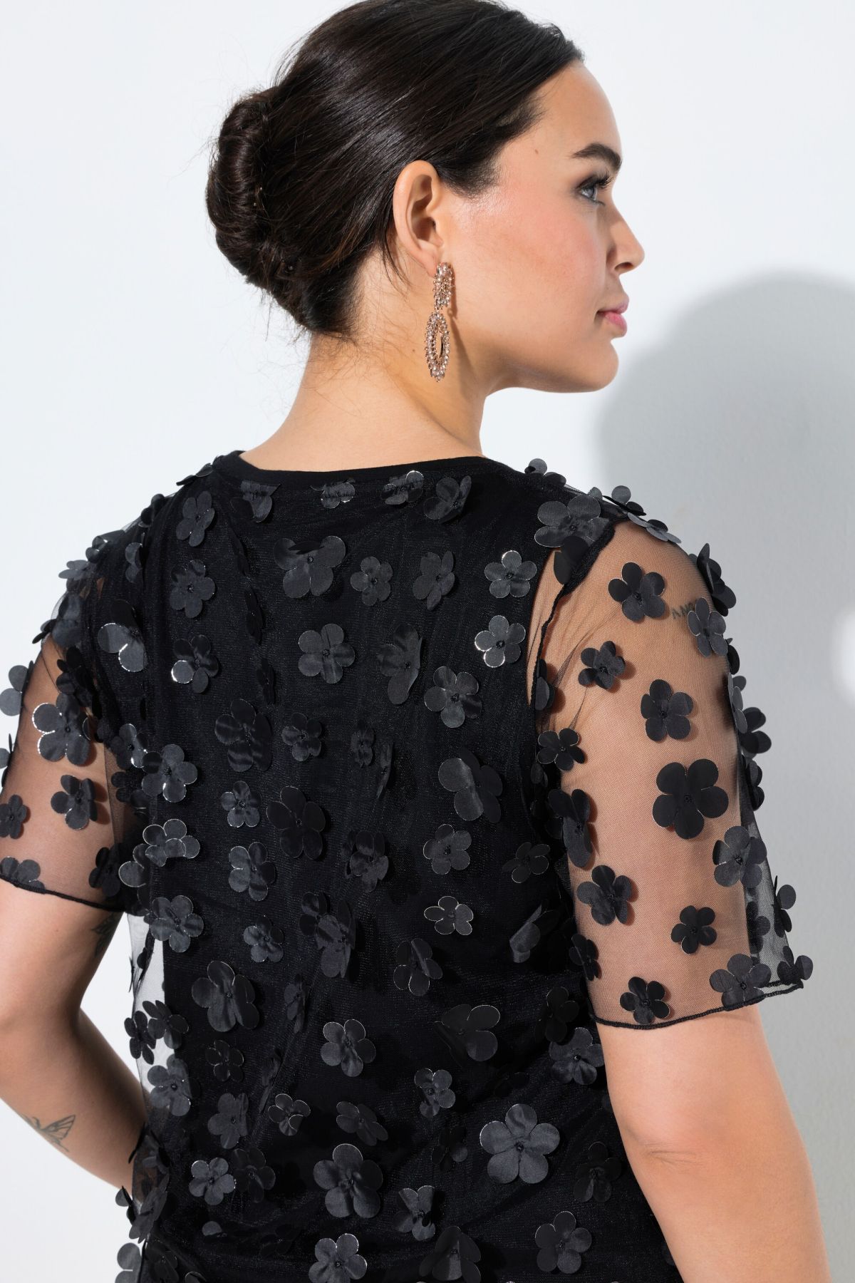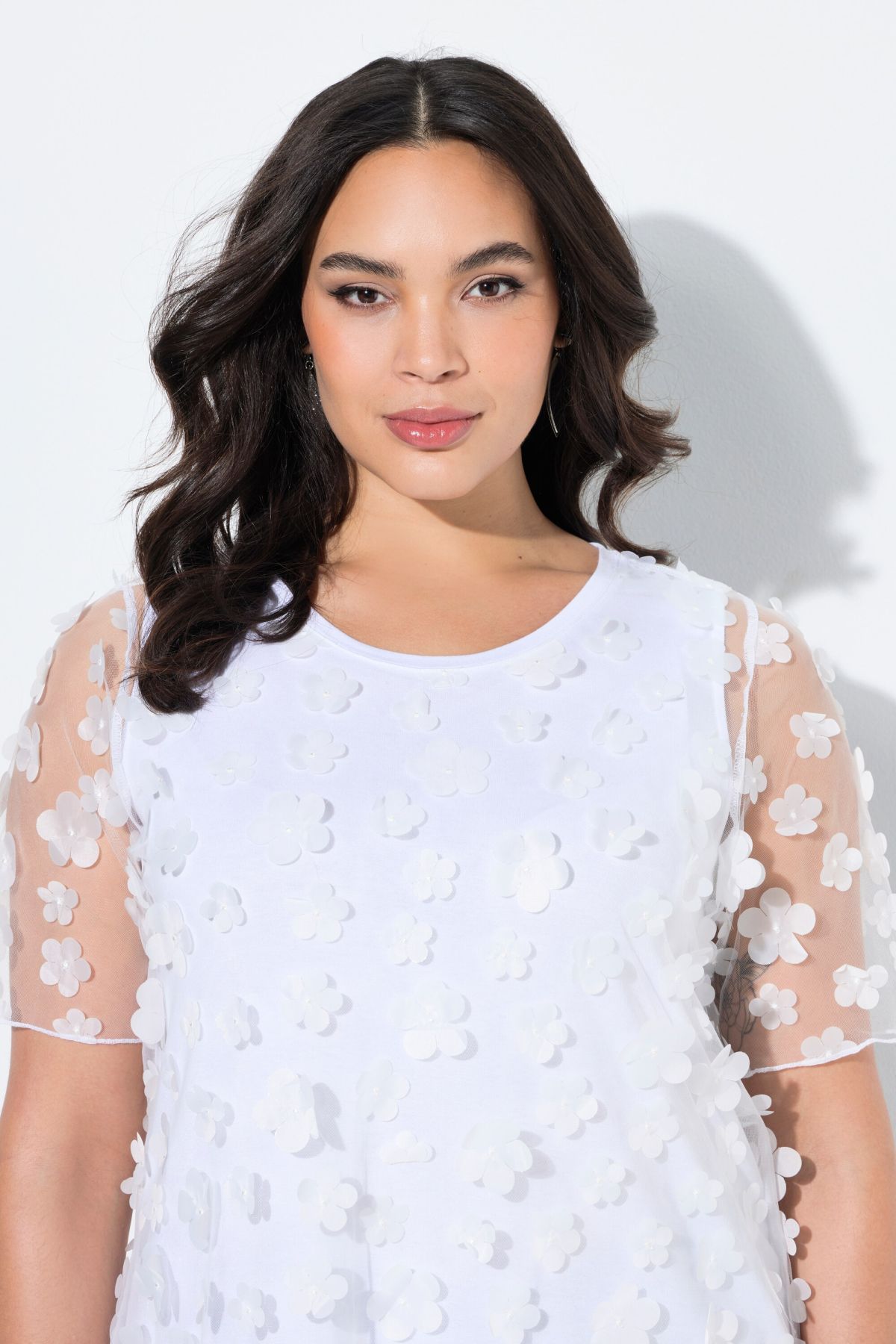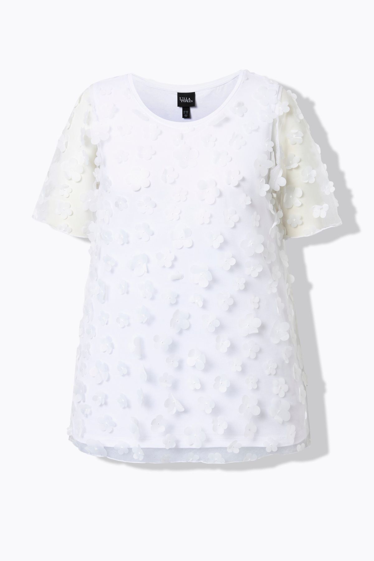 T-shirt, classic fit. Transparent mesh with 3D flowers. Round neck, short sleeves. Opaque jersey top worn underneath.