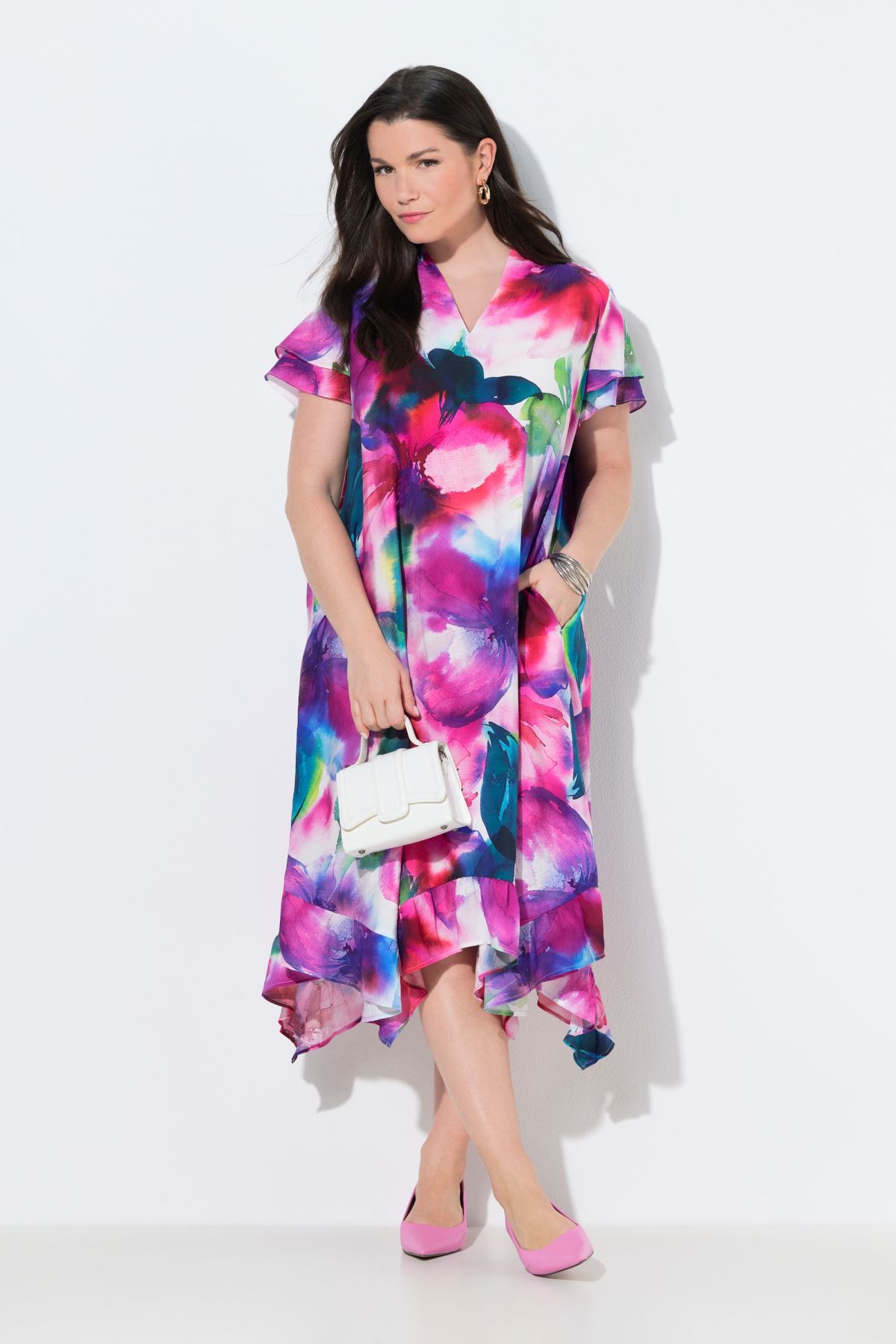 Midi dress, A-line with a comfortable hem width, in viscose with a watercolor floral design. Highlight: asymmetrical hem with a flounce. Stand-up collar with V-neck, side seam pockets. Double-layered, artfully gathered, short sleeves. Premium fashion for you! Selection by Ulla Popken stands for quality and wearable elegance. Selection by Ulla Popken transforms classics into modern highlights from high-quality materials with elaborate prints and details – perfect for every day and special occasions!