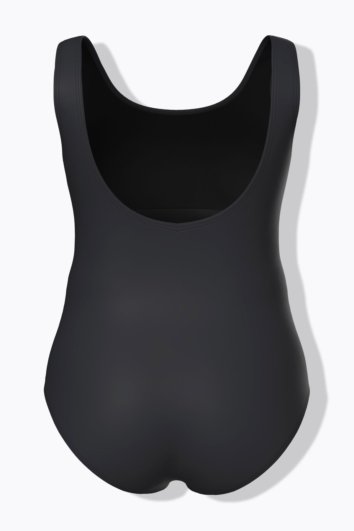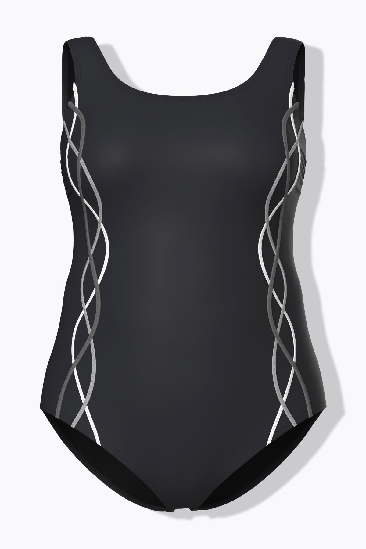 Swimsuit without soft cups. With curved decorative piping, round neckline, supportive underbust band and front lining.