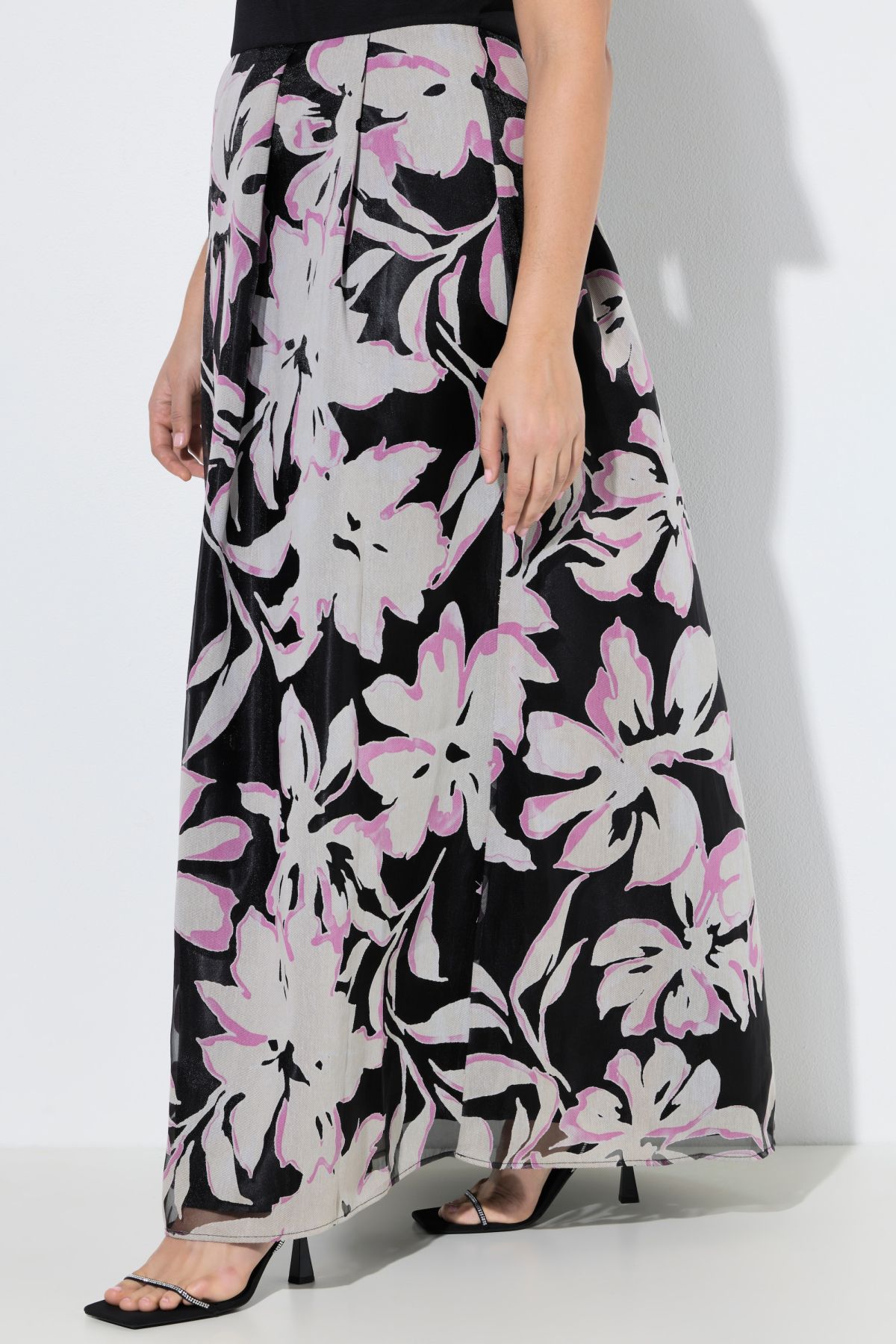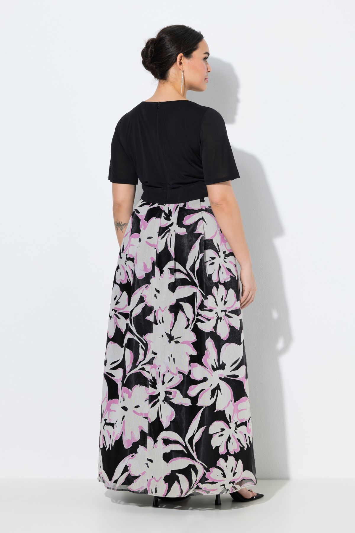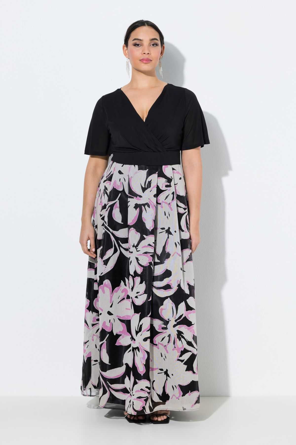 Maxi dress, fitted top with flared skirt. Solid-color V-neck top with half sleeves, long pleated skirt in floral burnout fabric. Opaque lining.