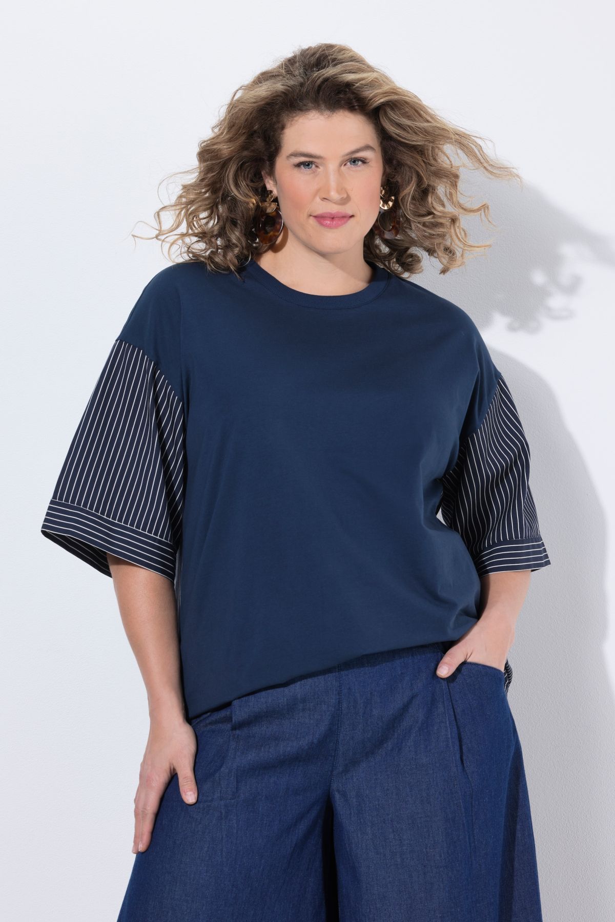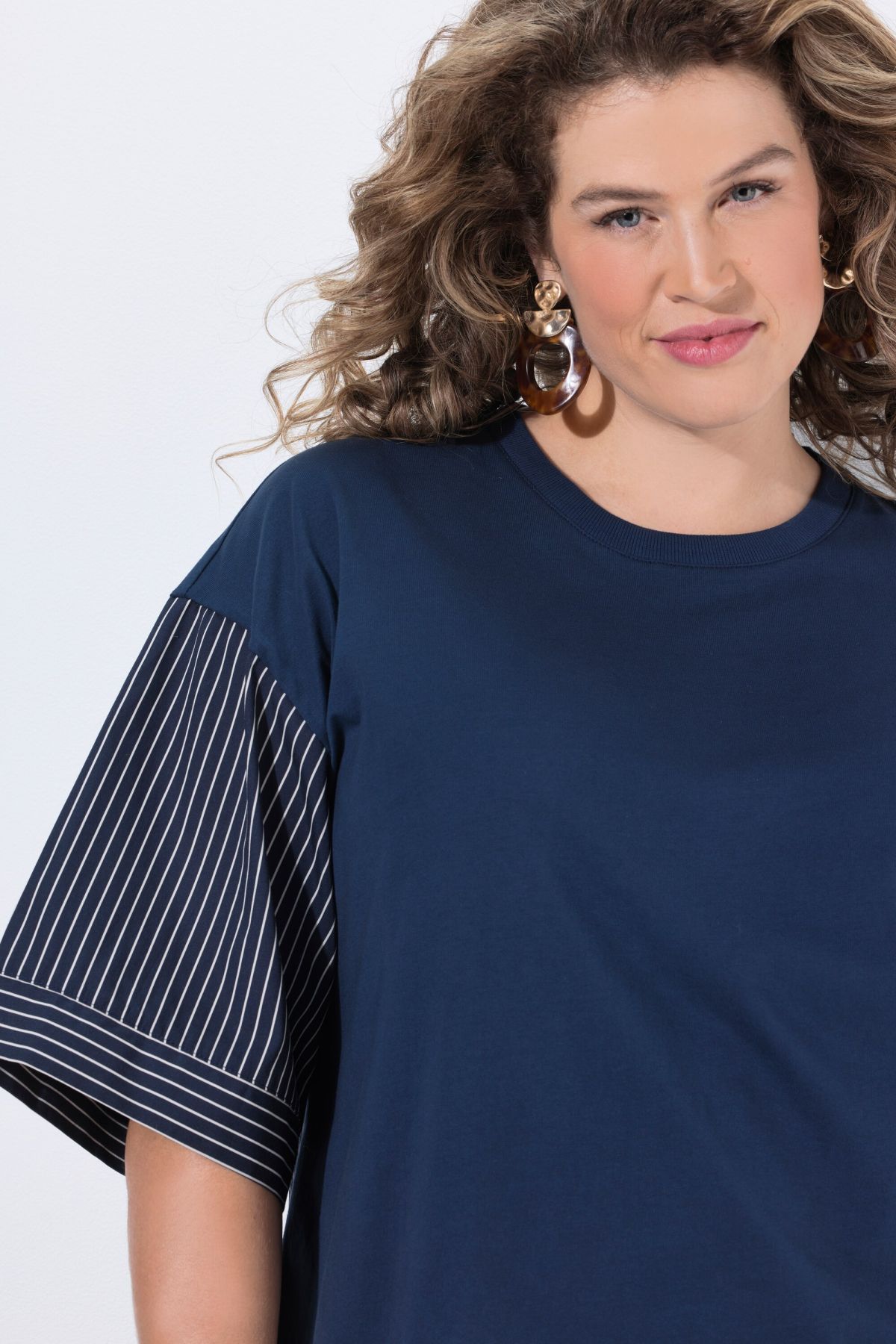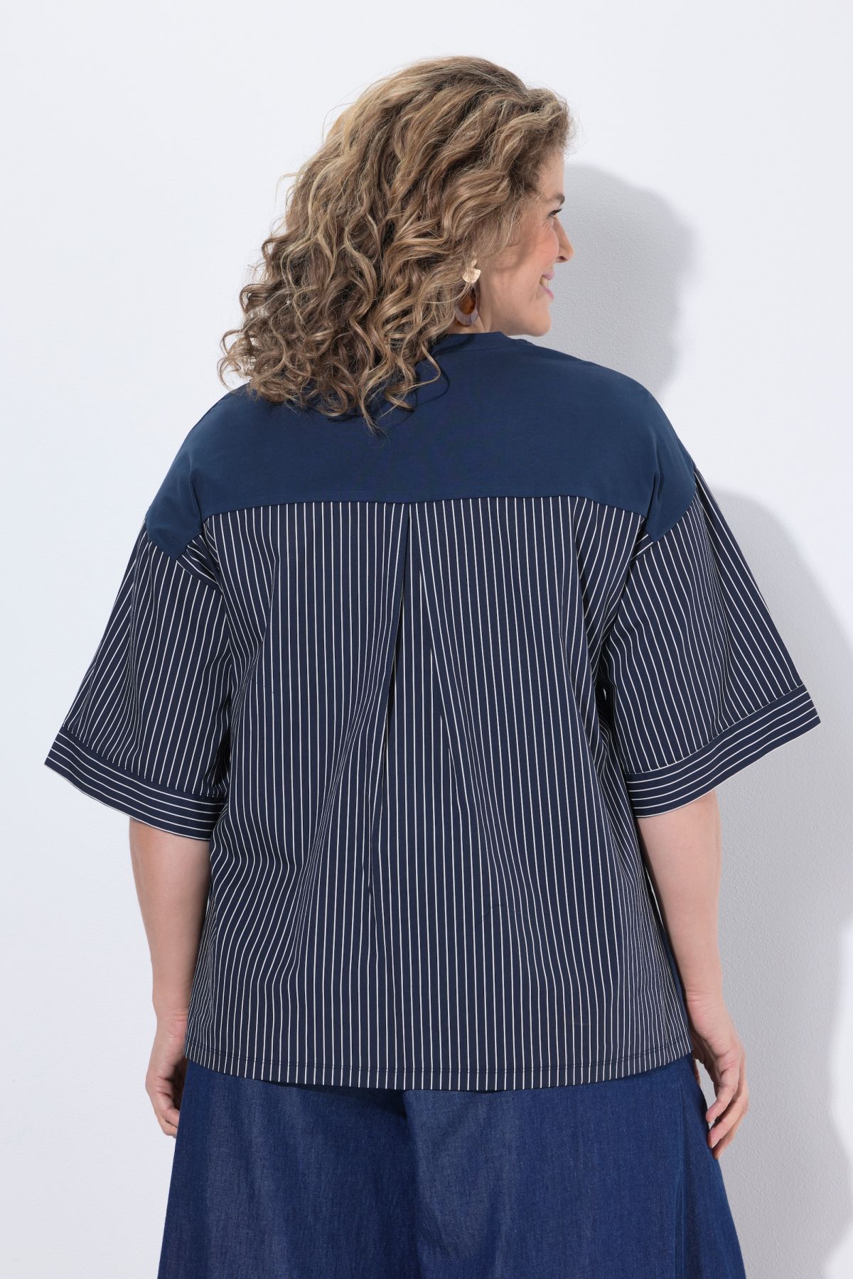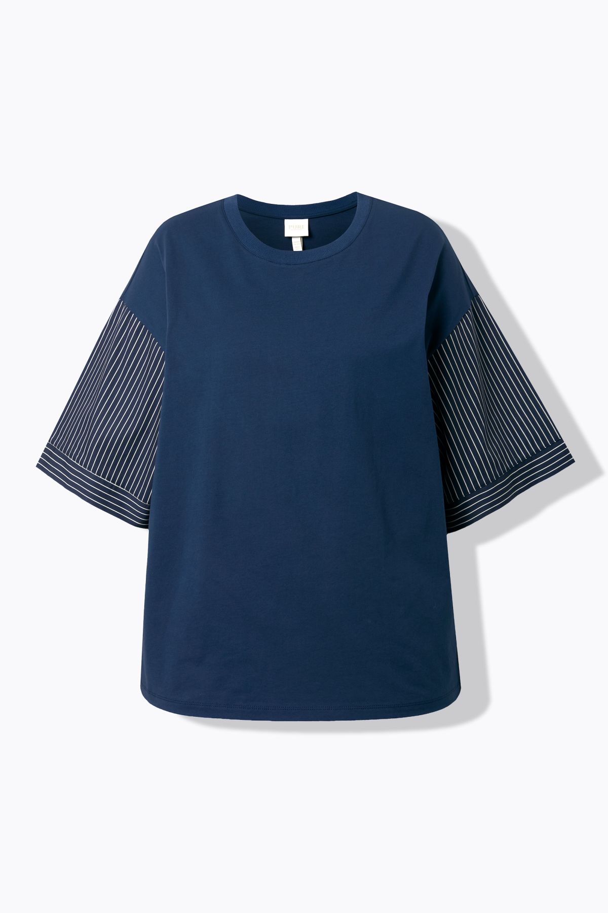 Organic cotton shirt in a modern blend of jersey and striped woven fabric. Relaxed oversized fit with a round neck and dropped shoulders. Straight three-quarter sleeves. Organic; certified by ECOCERT Greenlife Licence no. 152026.