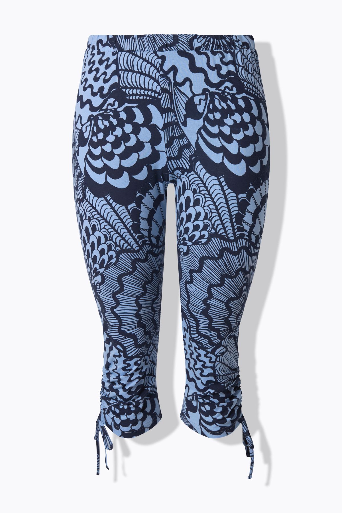 Jersey capri pants made with organic cotton and a shell pattern. Gathered with a tie at the side hem. Slim and comfortably stretchy leggings fit with an elasticated waistband. Organic; certified by ECOCERT Greenlife Licence no. 152026.
