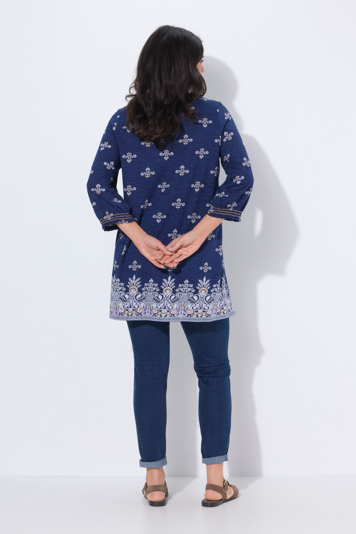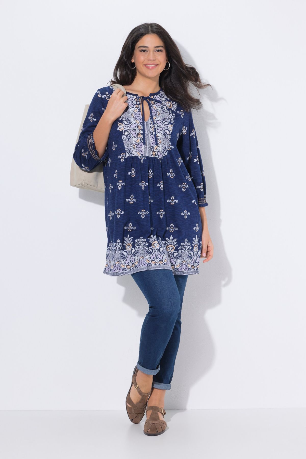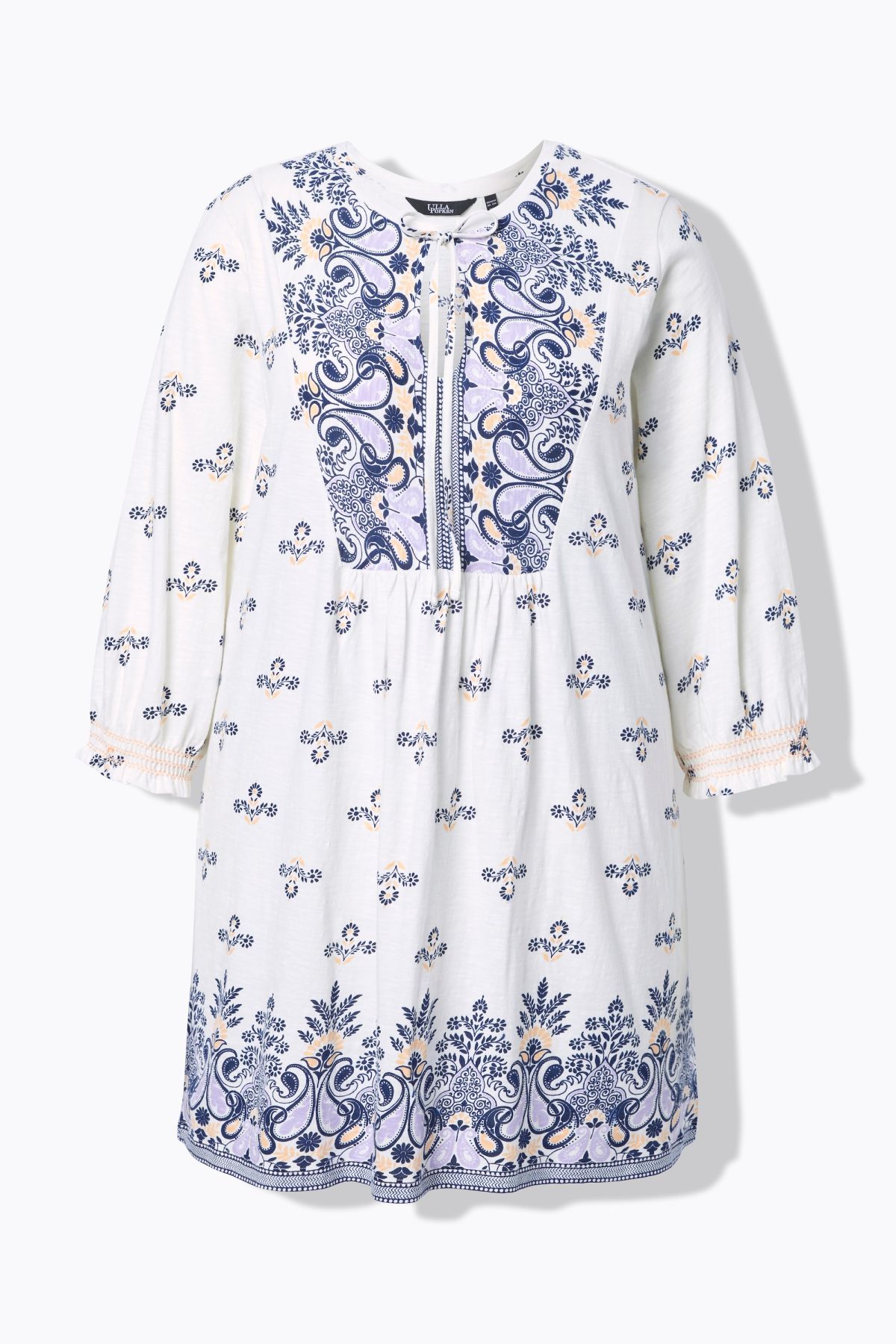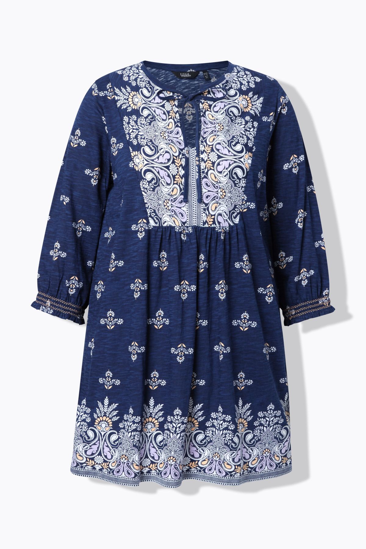 Shirt-tunic, A-line with a comfortable hem width, featuring a small pattern and hem trim. Tunic neckline with patterned insert and tie belt, 3/4 sleeves with elasticated smocked cuffs.