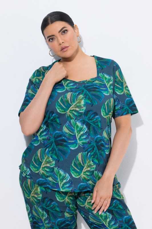 Long shirt, A-line, with leaf pattern. Square neckline, short sleeves.