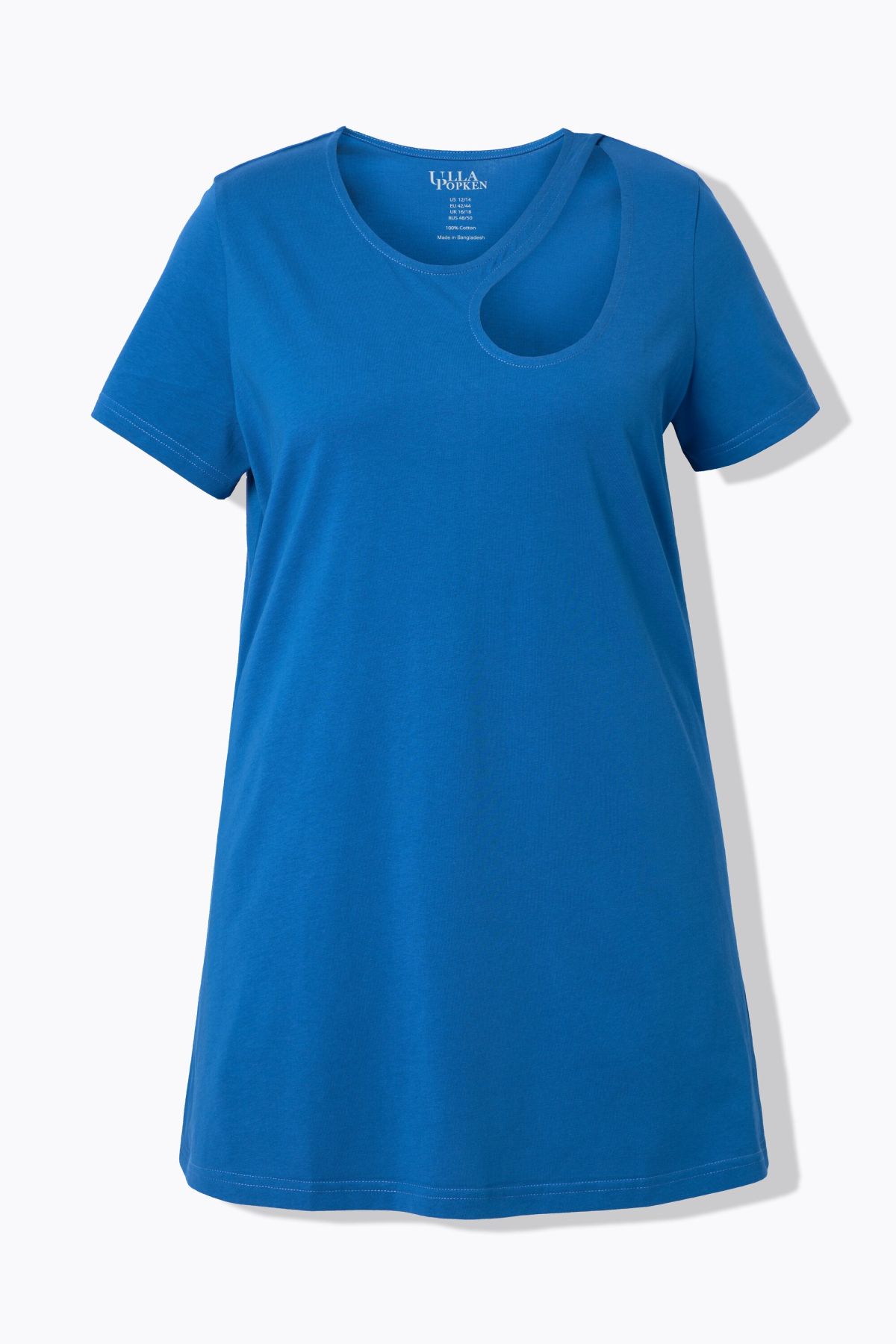 Long shirt, A-line. Round neck with curved cut-out, half sleeves.