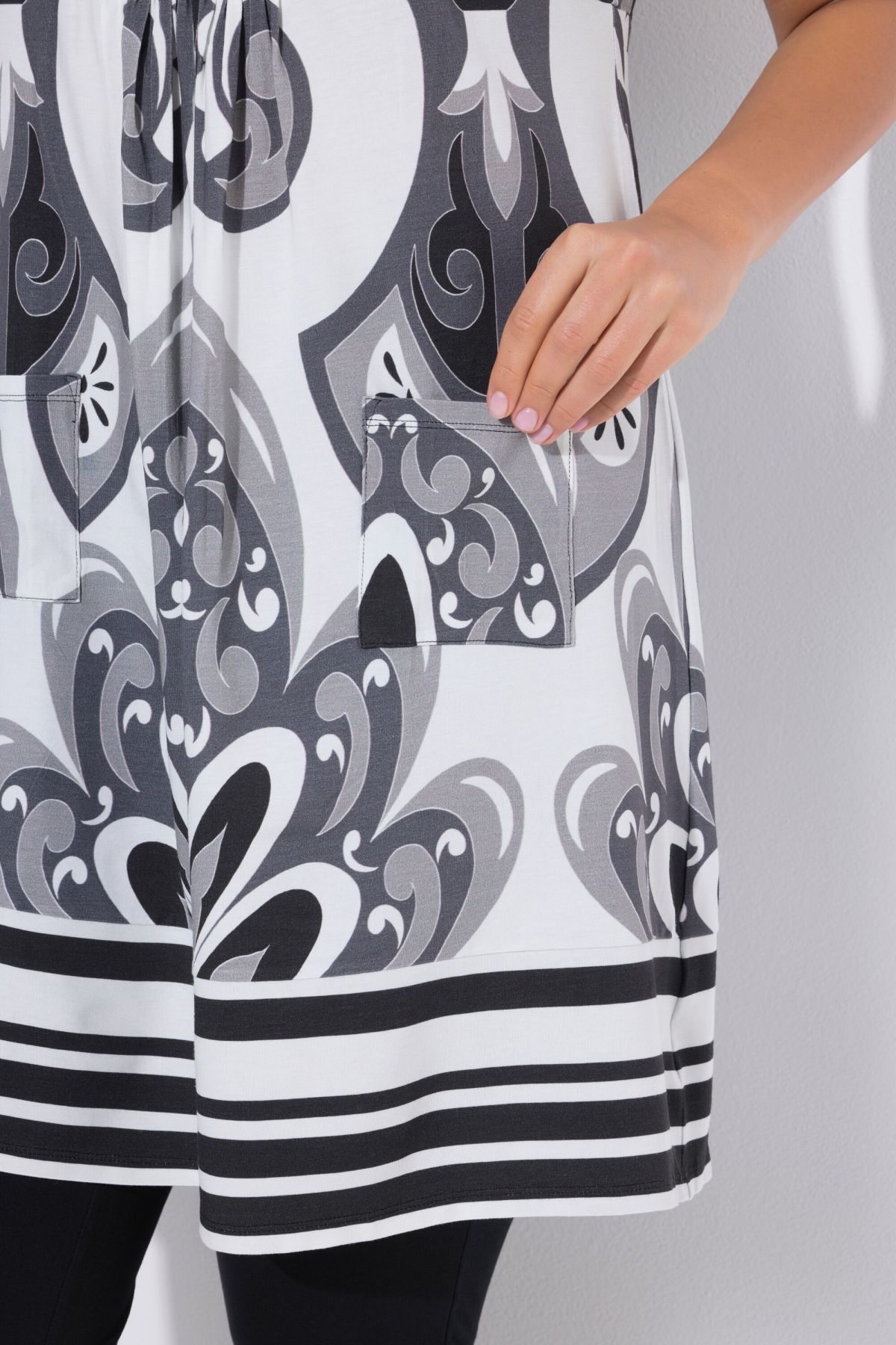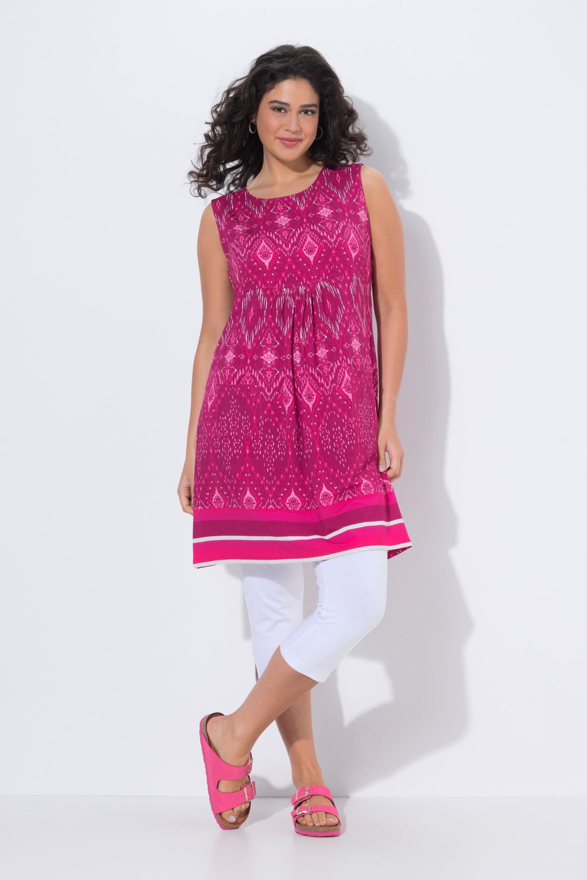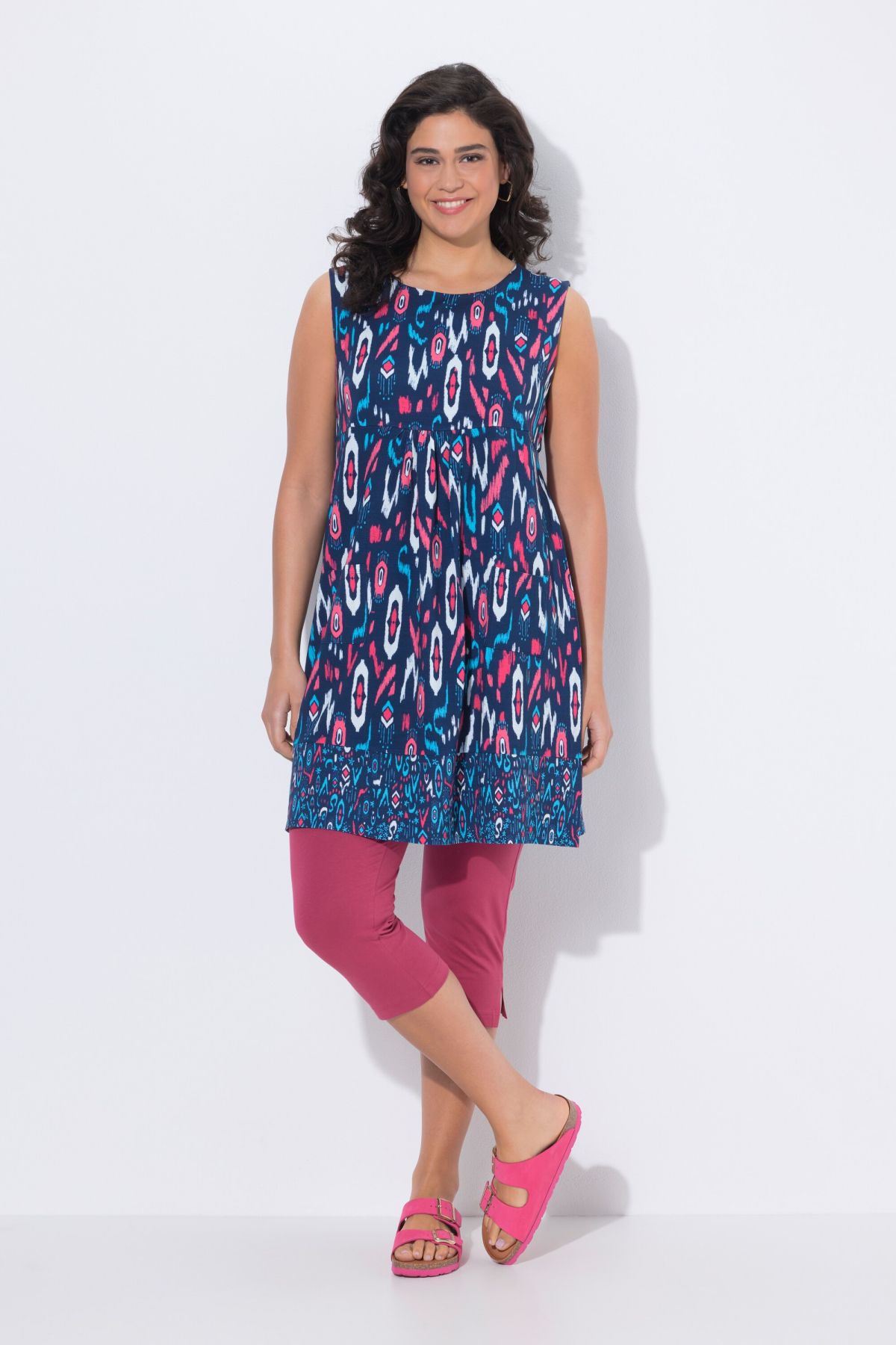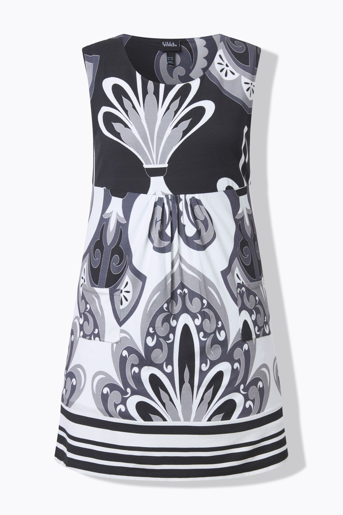 Jersey dress, sleeveless A-line, with border print at the hem. Round neckline, gathered horizontal seam at the front, 2 patch pockets.