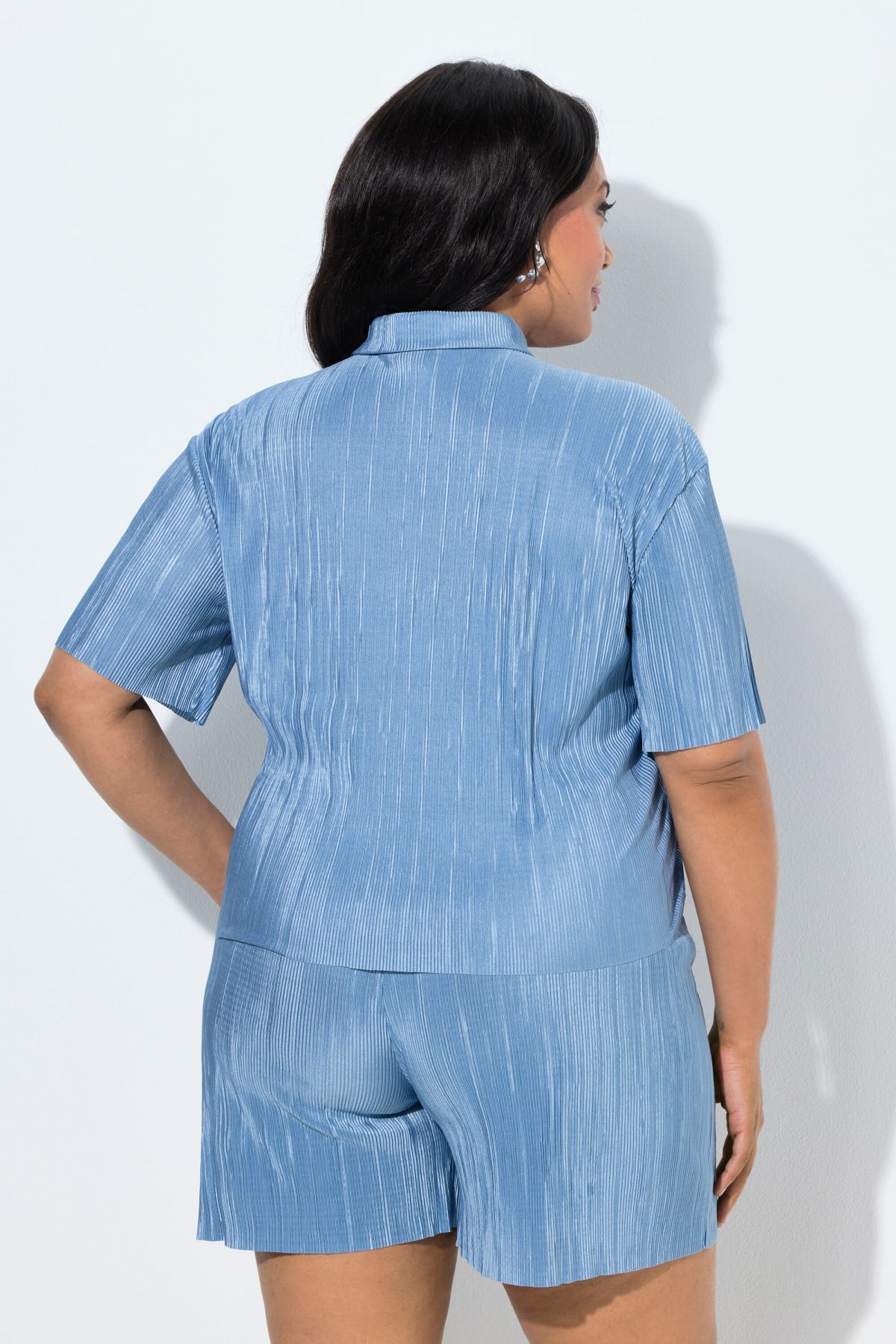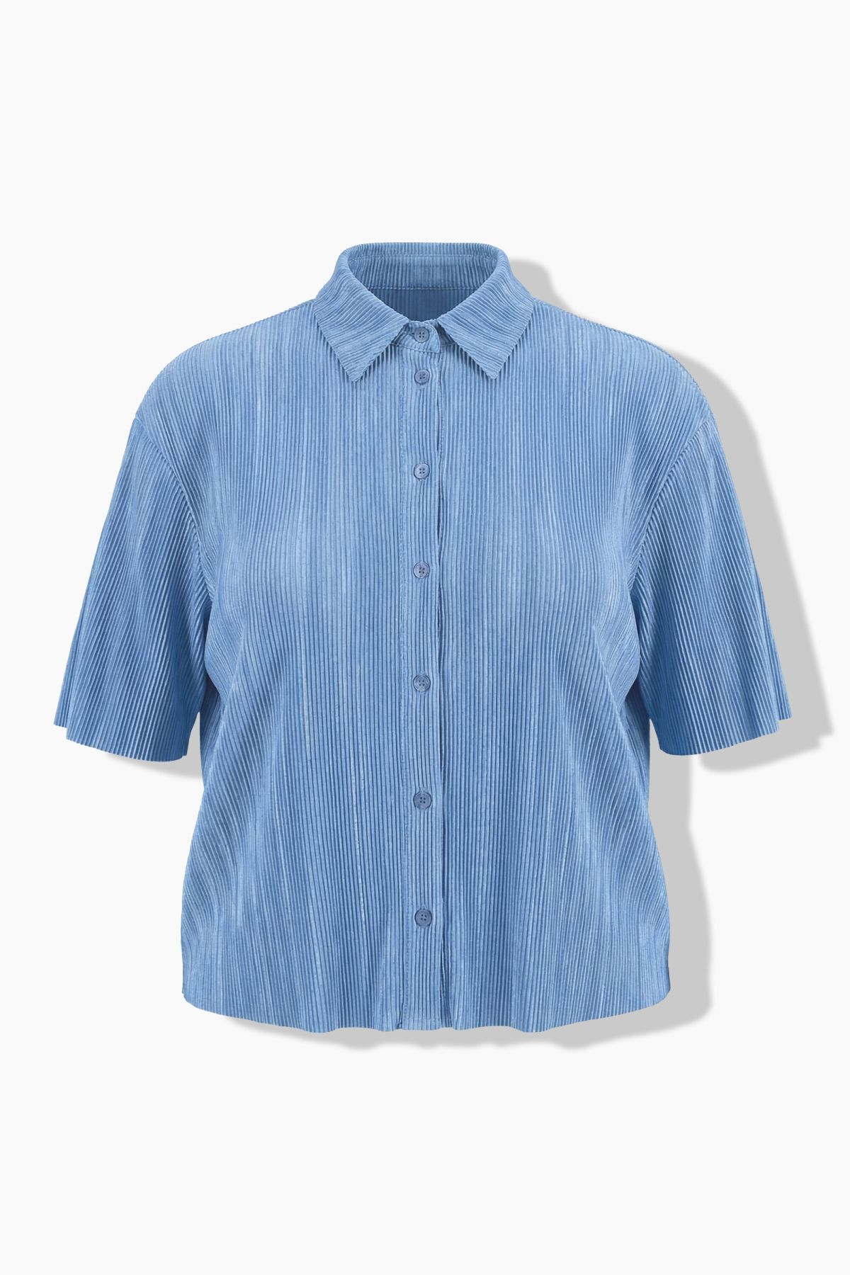 Pleated blouse, fashionably cropped fit. Shirt collar, dropped shoulders, half sleeves.