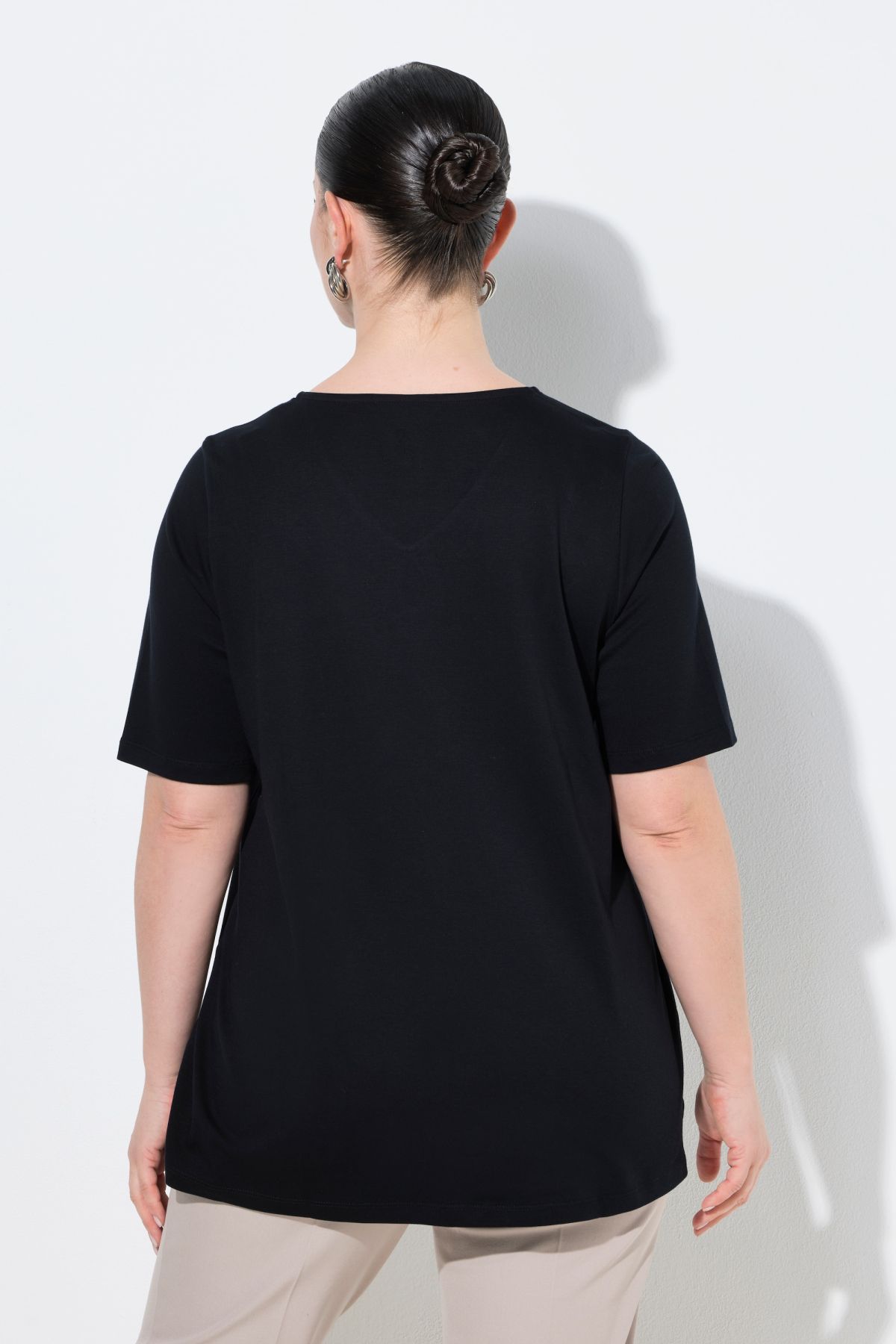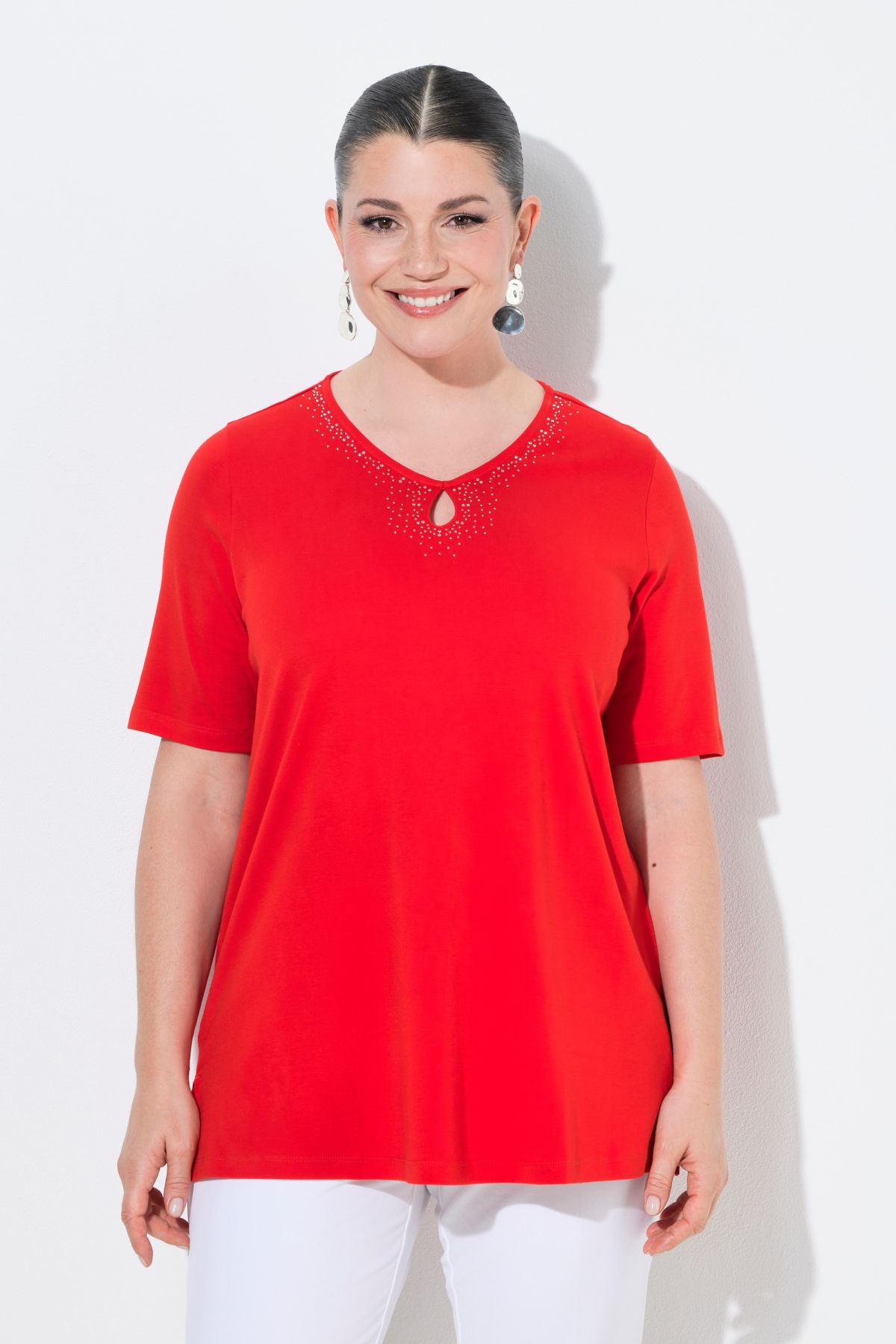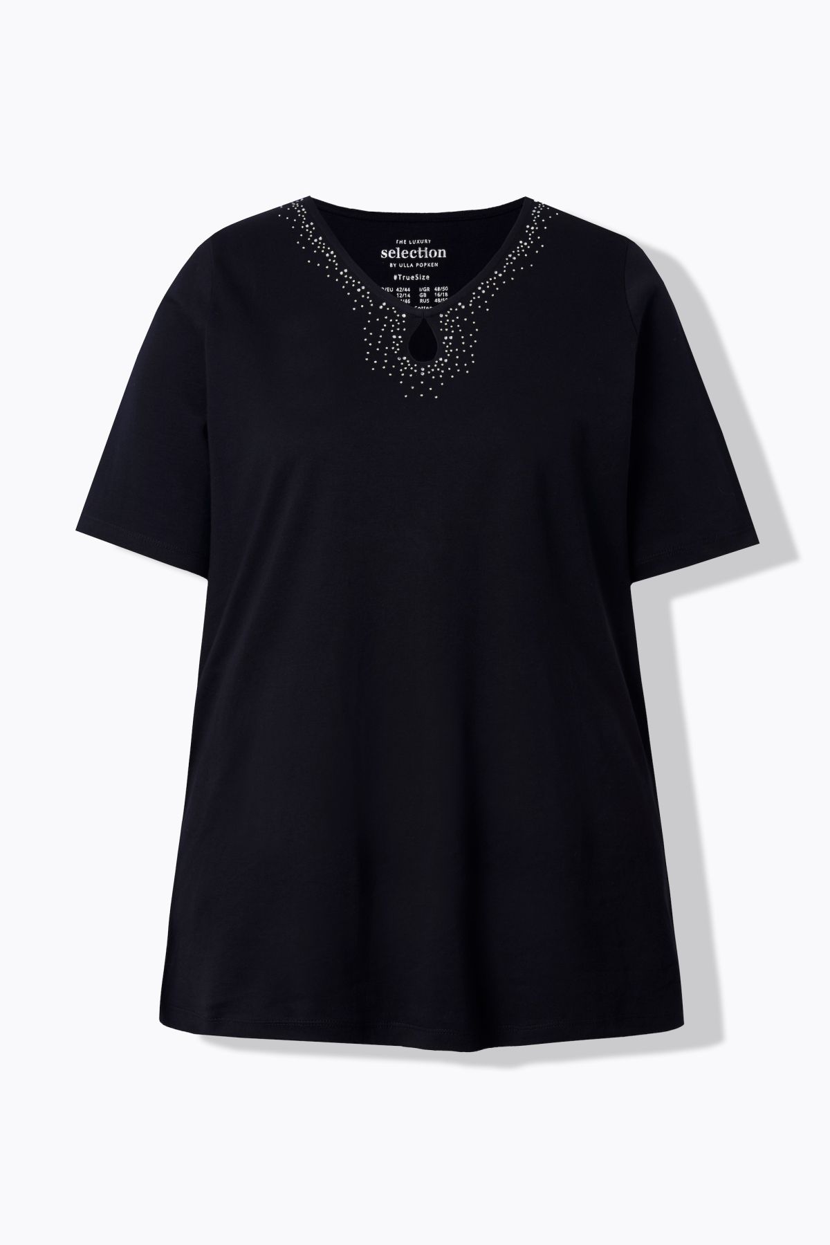 Pima cotton shirt, A-line with a comfortable hem width, made from high-quality, soft cotton jersey. Highlight: rhinestones at the rounded V-neck with keyhole detail. Short sleeves, hem with side slits – for even greater comfort. Pima cotton is also known as the silk of South America due to its fantastic properties. This sophisticated cotton variety is characterized by particularly long and fine fibers. This makes it exceptionally soft and durable and gives it a silky sheen – ideal for people with sensitive skin. Premium fashion for you! Selection by Ulla Popken stands for quality and wearable elegance. Selection by Ulla Popken transforms classics into modern highlights made from high-quality materials with elaborate prints and details – perfect for everyday wear and special occasions!