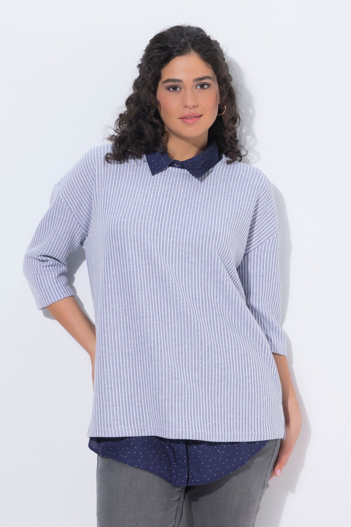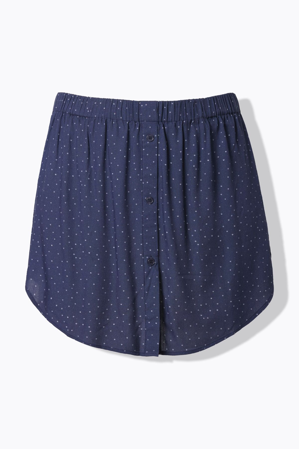 Blouse extender, A-line, with small polka dots. Elasticated waistband, button placket, rounded hem with side slits.