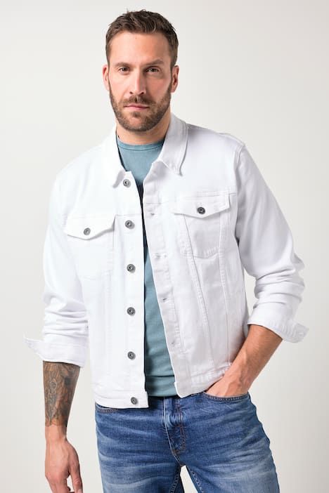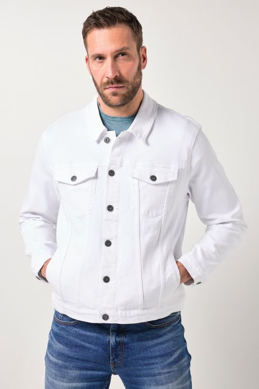 JP1880 denim jacket made from comfortably stretchy cotton denim. Men's jacket with button placket and flap chest pockets, 2 side pockets. Hem and cuffs are adjustable with buttons. Optimal fit, especially in larger sizes. JP1880 - for real men only!