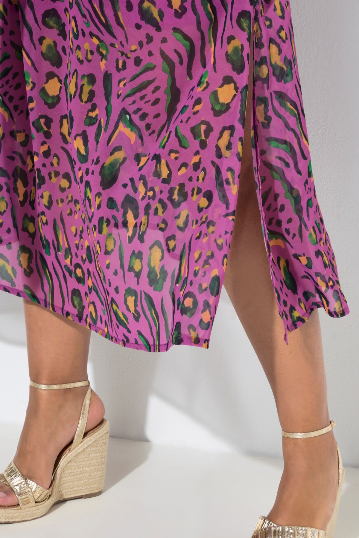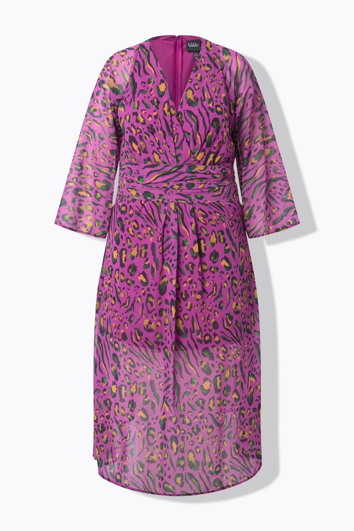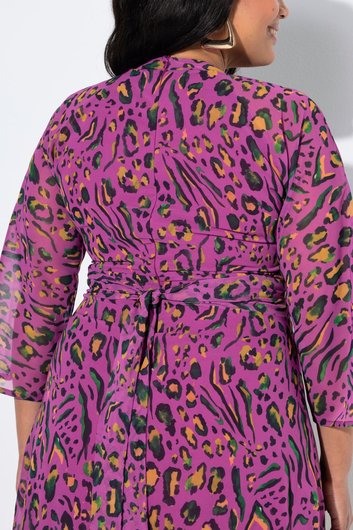 Удобно трико с атрактивен леопардов принт, V-образно деколте, удобна кройка, декоративна лента на талията, дълги ръкави тип „тромпет“, дължина приблизително 132 см.