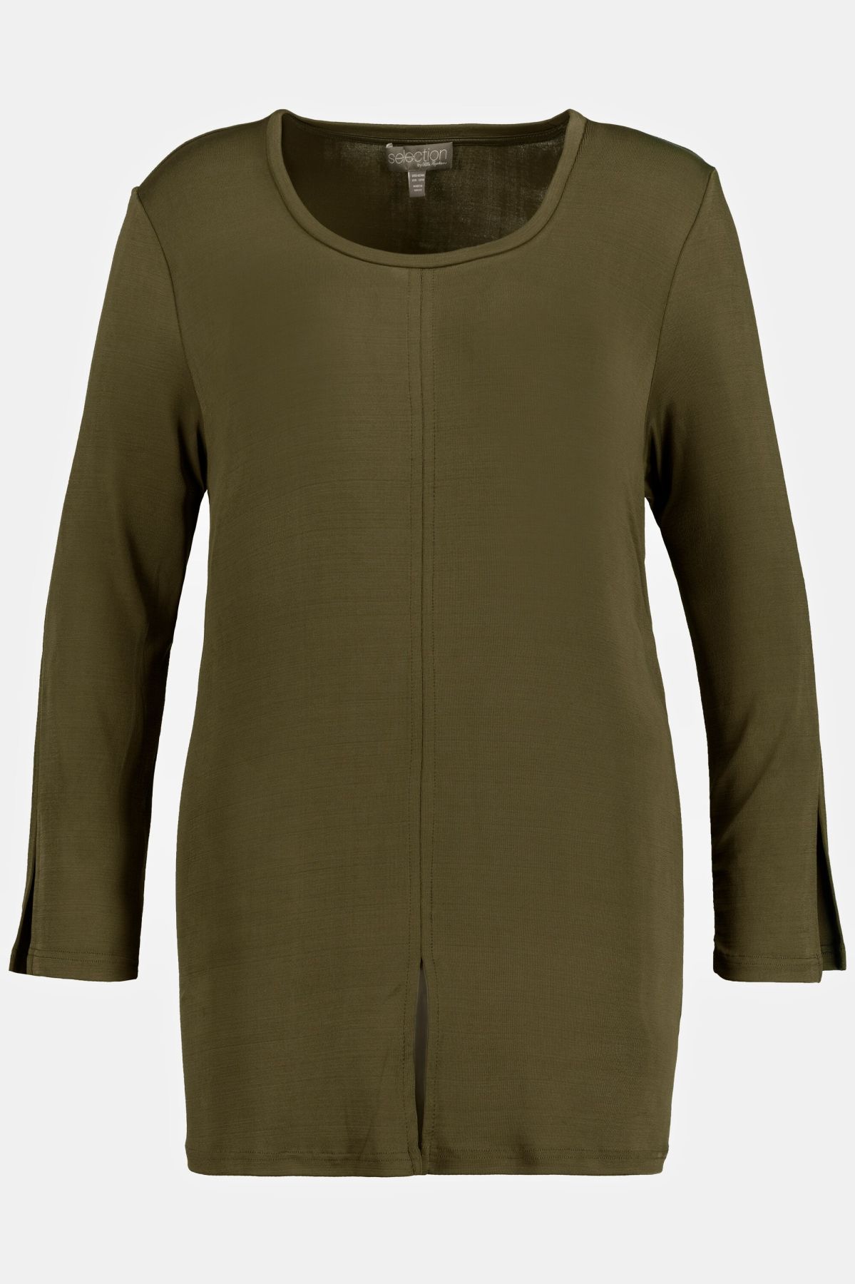 Vent Details Slinky Stretch Knit Top - lightweight cool slinky stretch knit with horizontal textured ribs and casual style. Round neck, long vented hem sleeves, center front seam detail, and front vented hem. A-line fit.