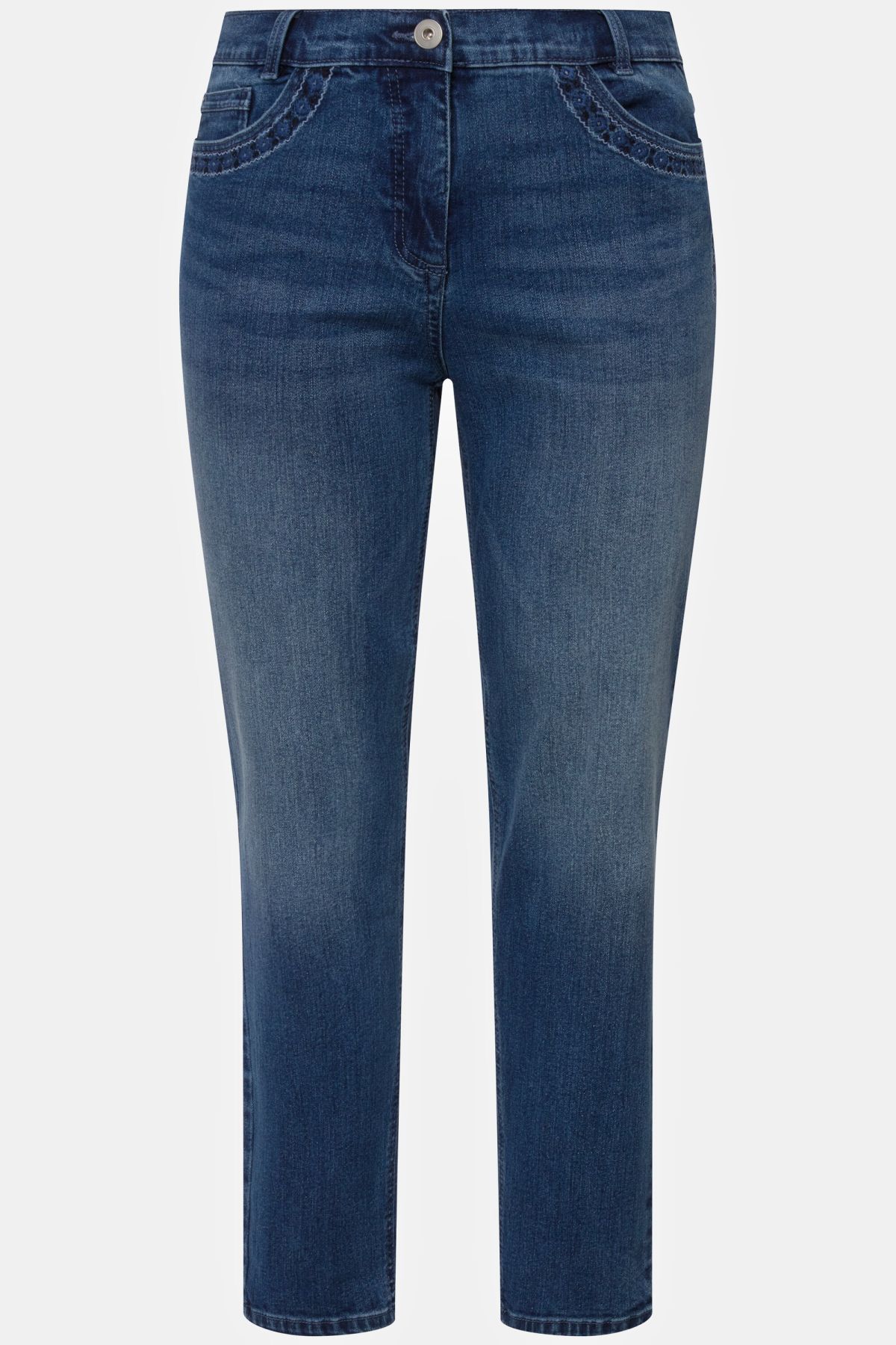 Embroidered Pocket Slim Leg Stretch Jeans - floral embroidery on the front and back pockets makes this style a flattering addition to your denim collection. Classic 5-pockets design, fixed contour waist, belt loops, front button-and-zipper closure, and slim leg.