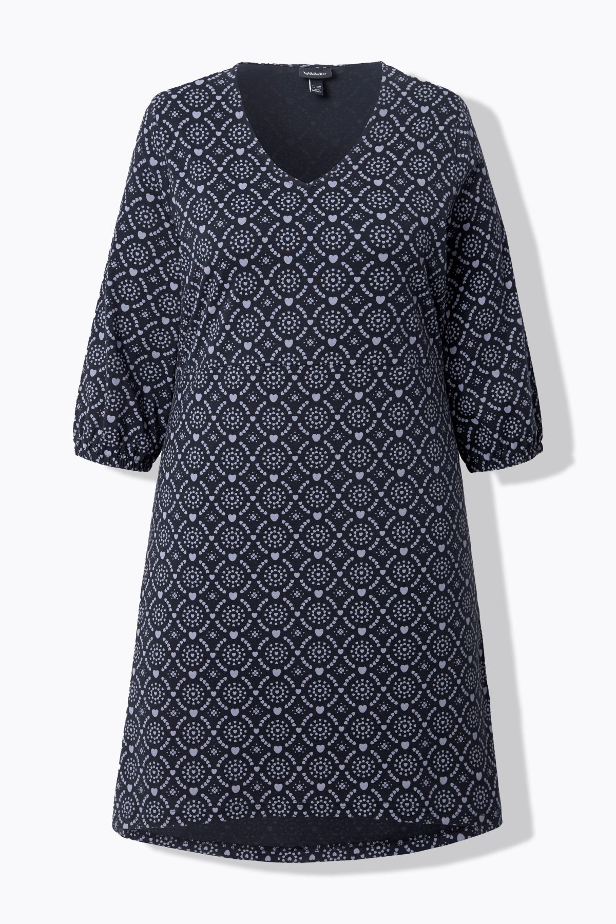 модерен, графичен принт, V-образно деколте, удобна А-линия с извит кръст на талията, 3/4 ръкави с еластични маншети, чист памук, дължина прибл.