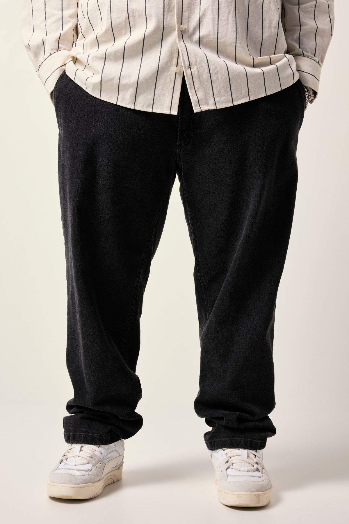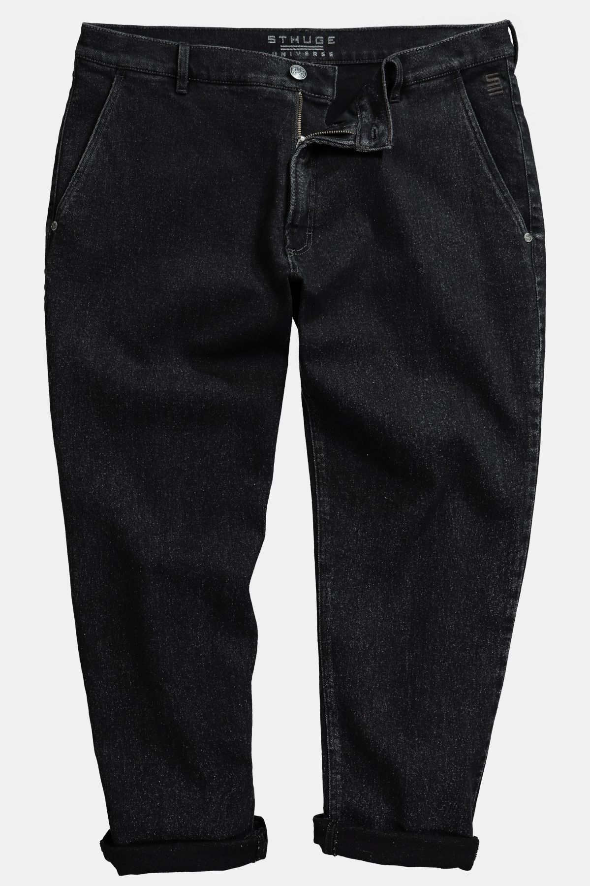 STHUGE denim chinos, black denim, tapered baggy fit, up to size 72