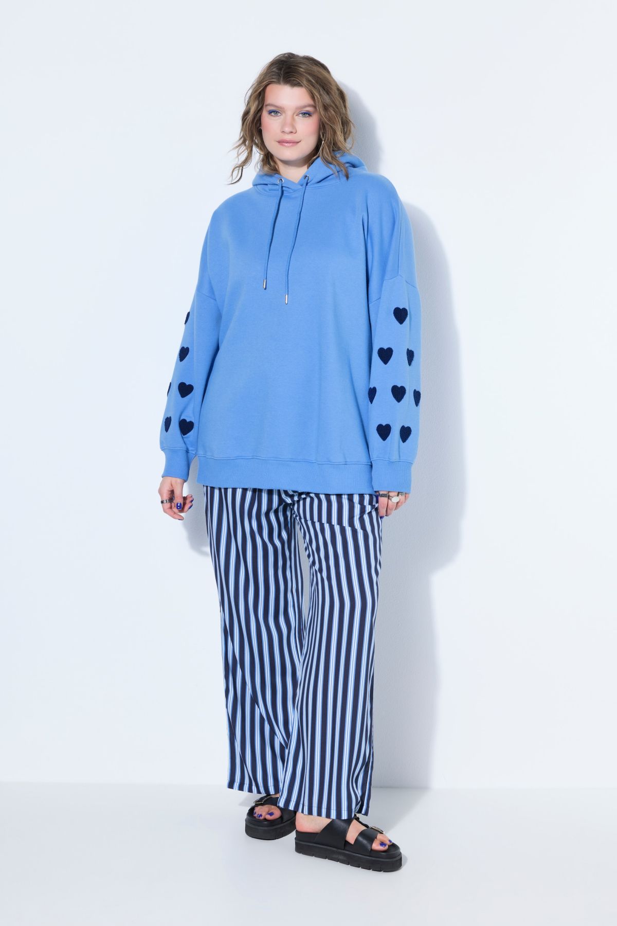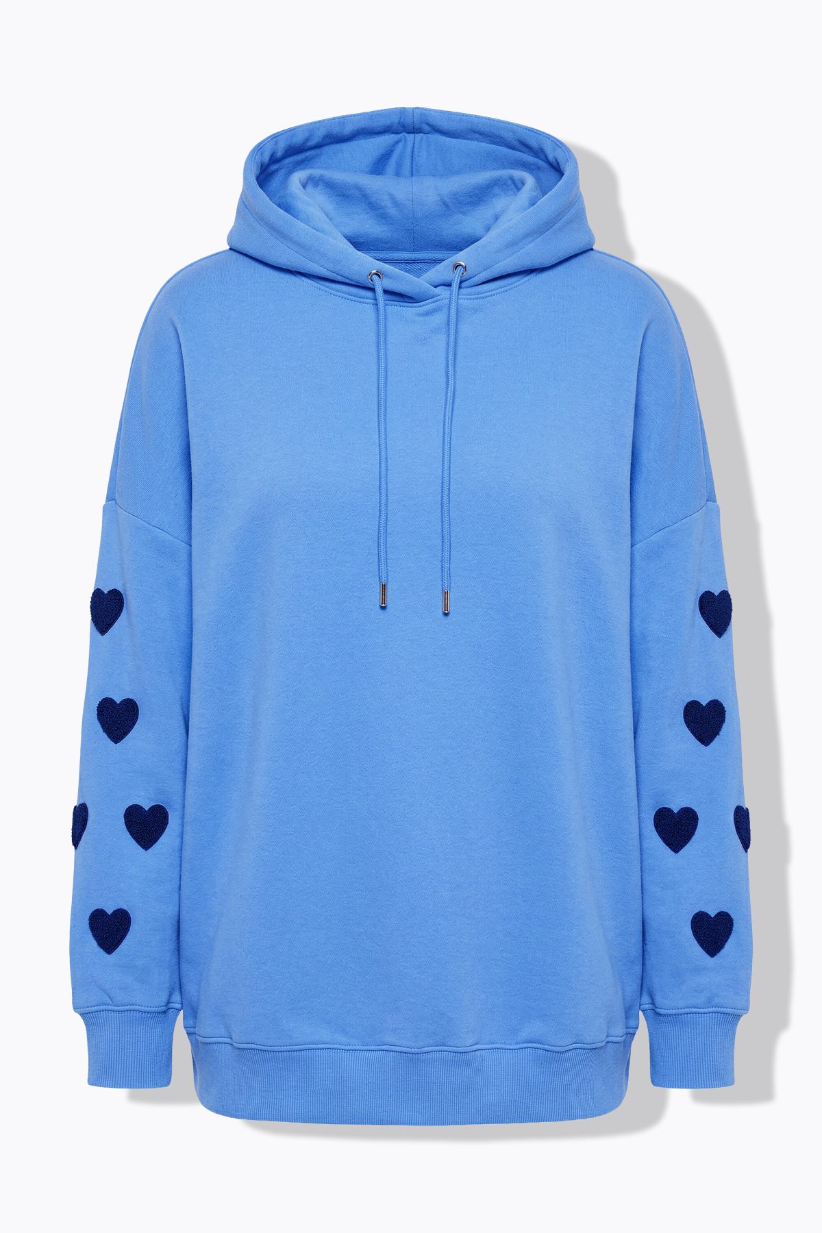 Hoodie, extra oversize shape, made of soft sweat - sleeves with hearts embroidery made of 3D terry cloth. Hood with tie band, dropped shoulders, long sleeves. Ribbed cuffs.