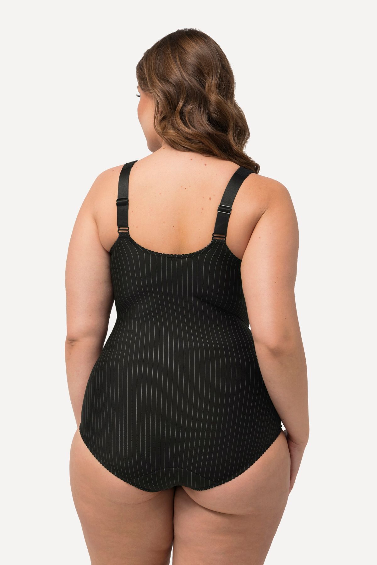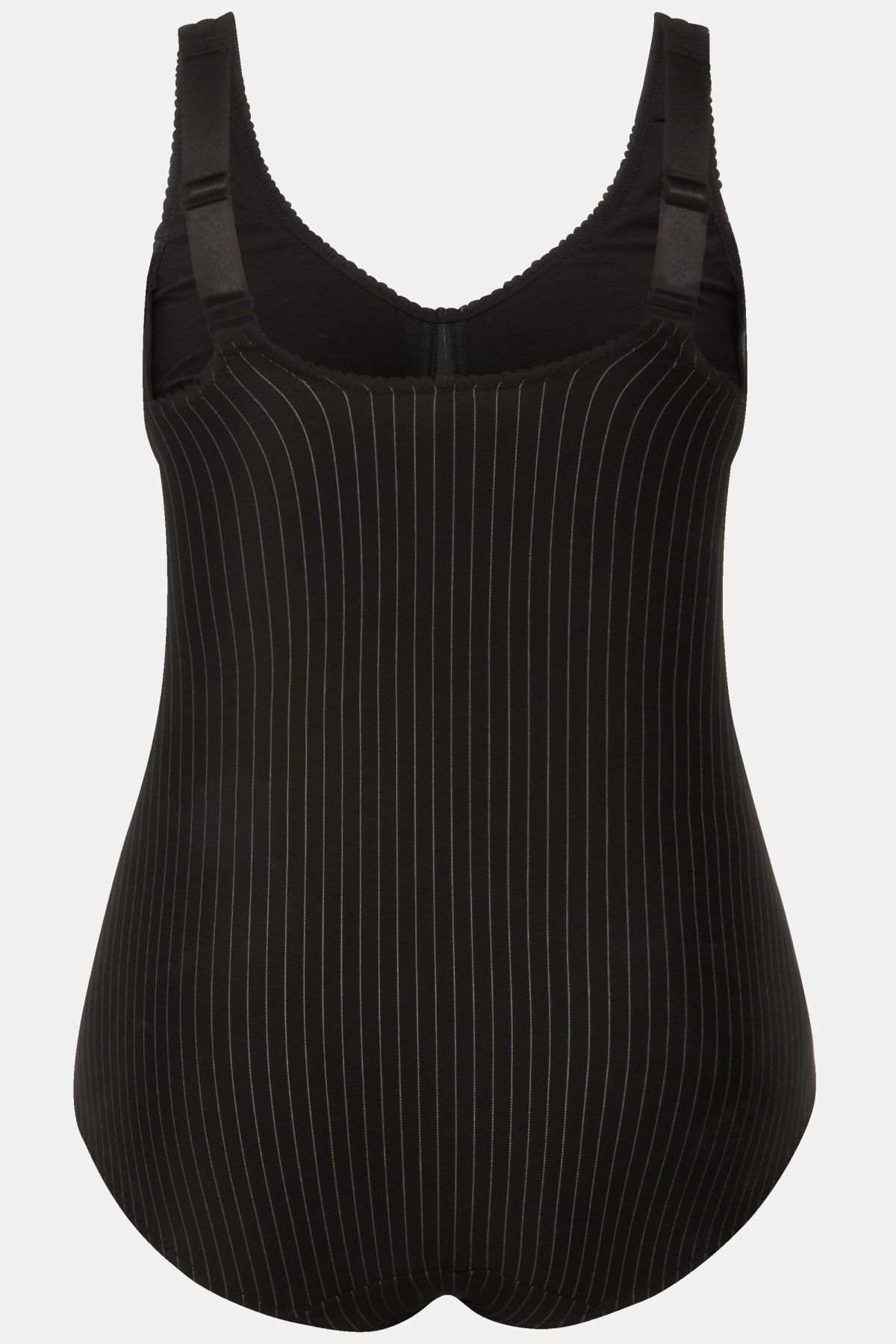 Body-forming body with elegant pinstripes and integrated bust - can also be worn without a bra. Between the cups with a sparkling pendant and edges with decorative mouse teeth. Pleasantly wide straps. For a smoother silhouette.