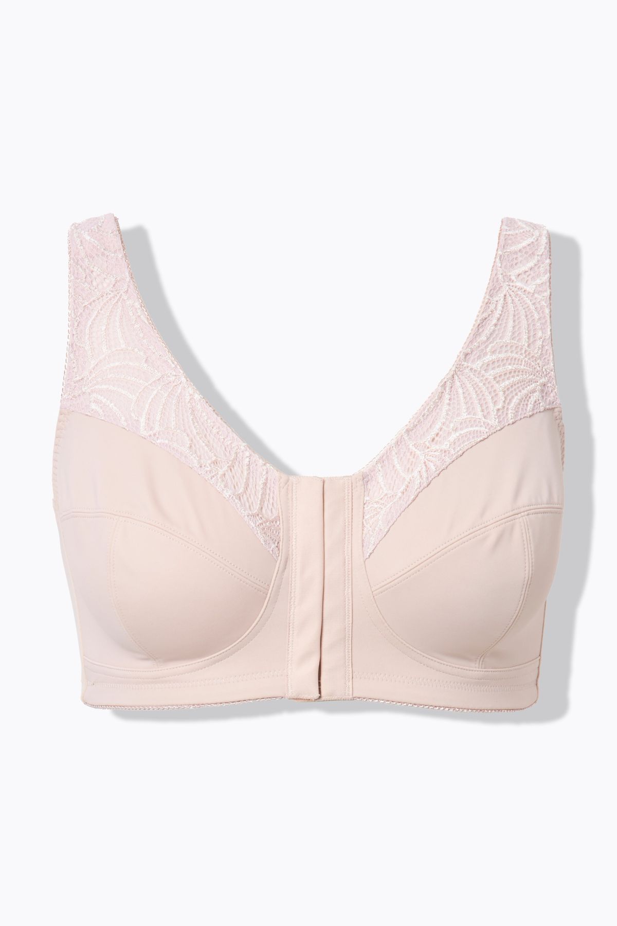 Pastel Front Closure Wirefree Support Bra# our super supportive wirefree Kelly style now with easy-to-open center front hook-and-eye closures. Lace accents on the cups and center back. Wide comfortable straps.