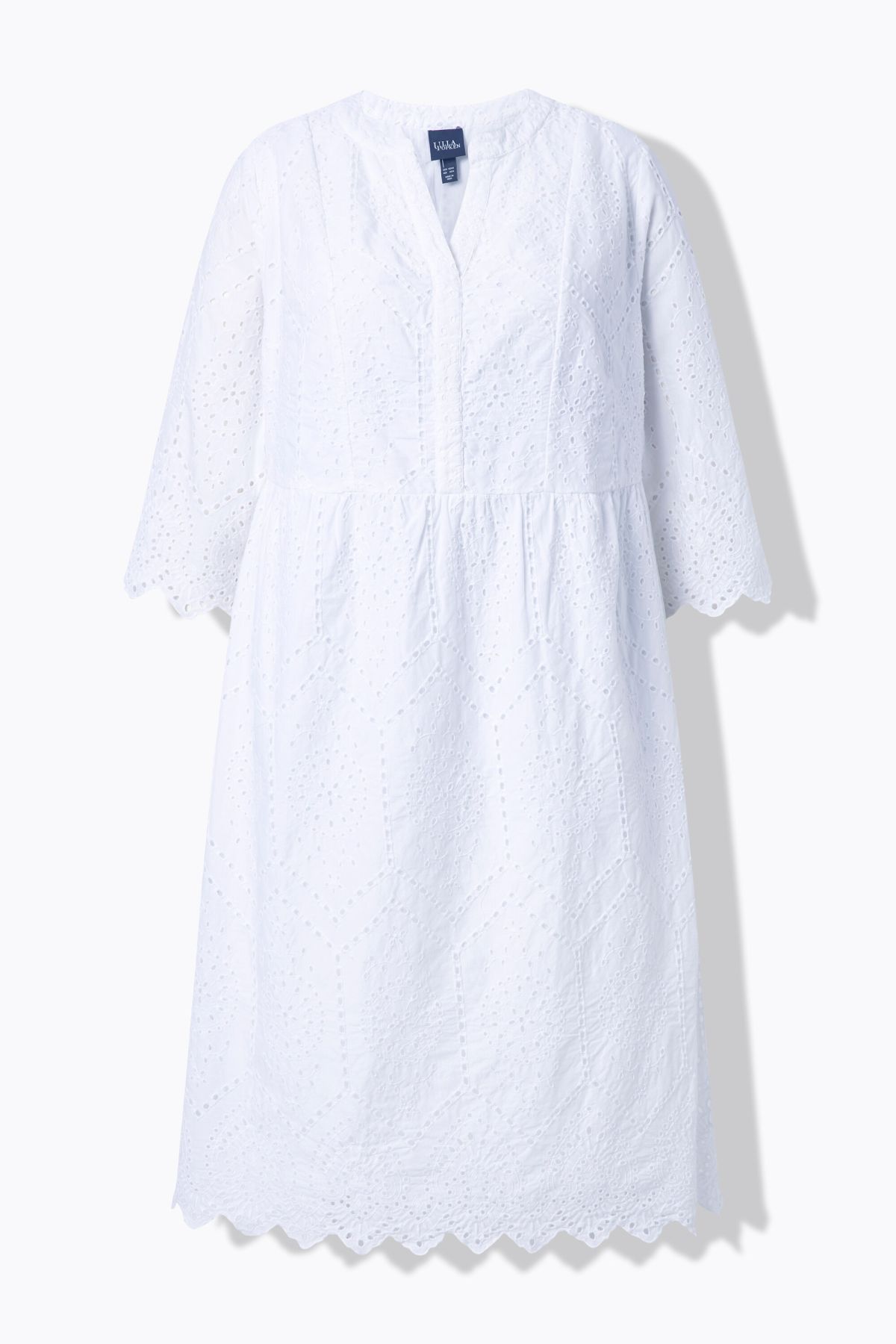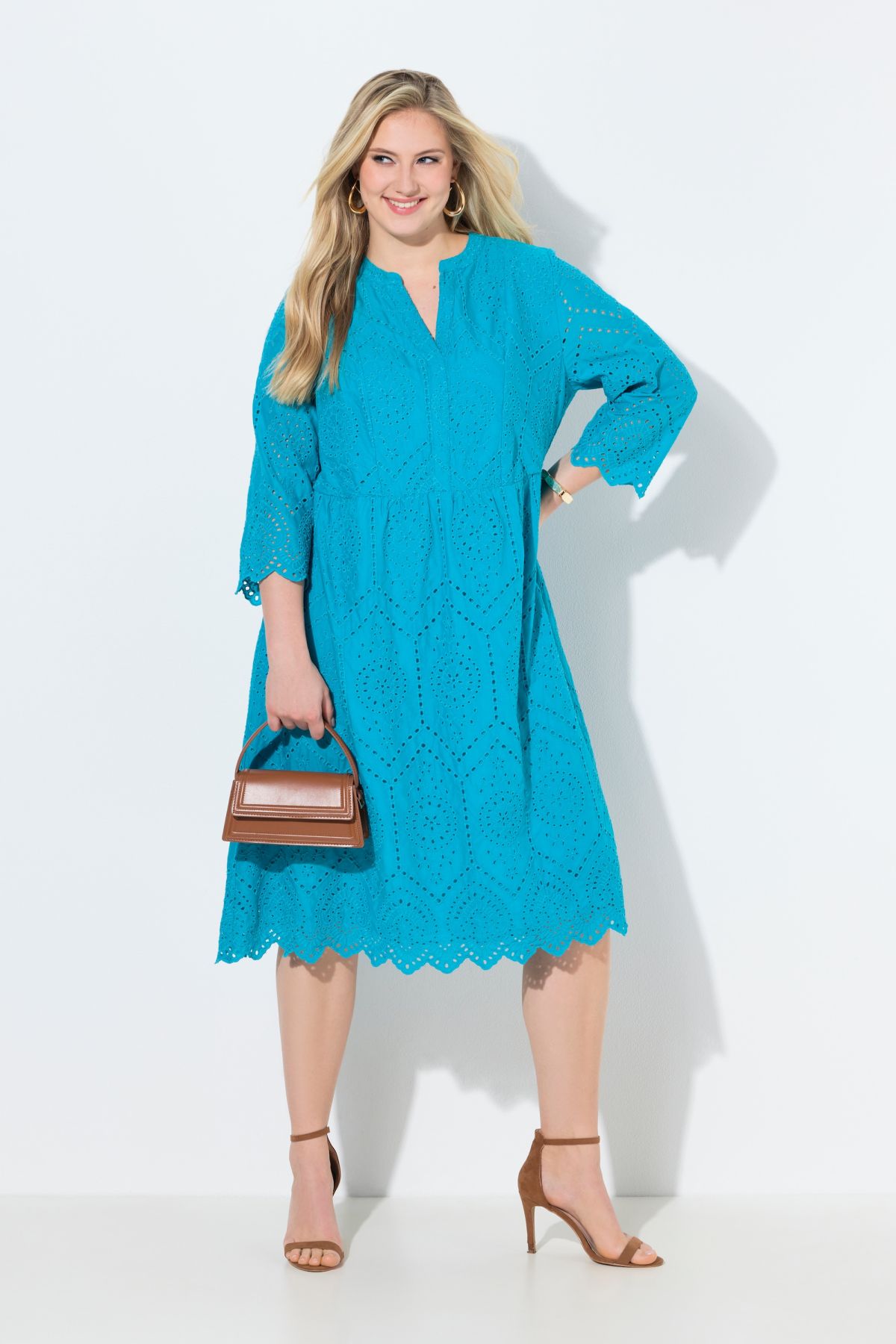 Lace Midi Dress - Delicate scalloped edges and a fine openwork lace elevate this a-line dress. Split neckline, 3/4 sleeve, a-line cut with flared hem, opaque jersey slip.