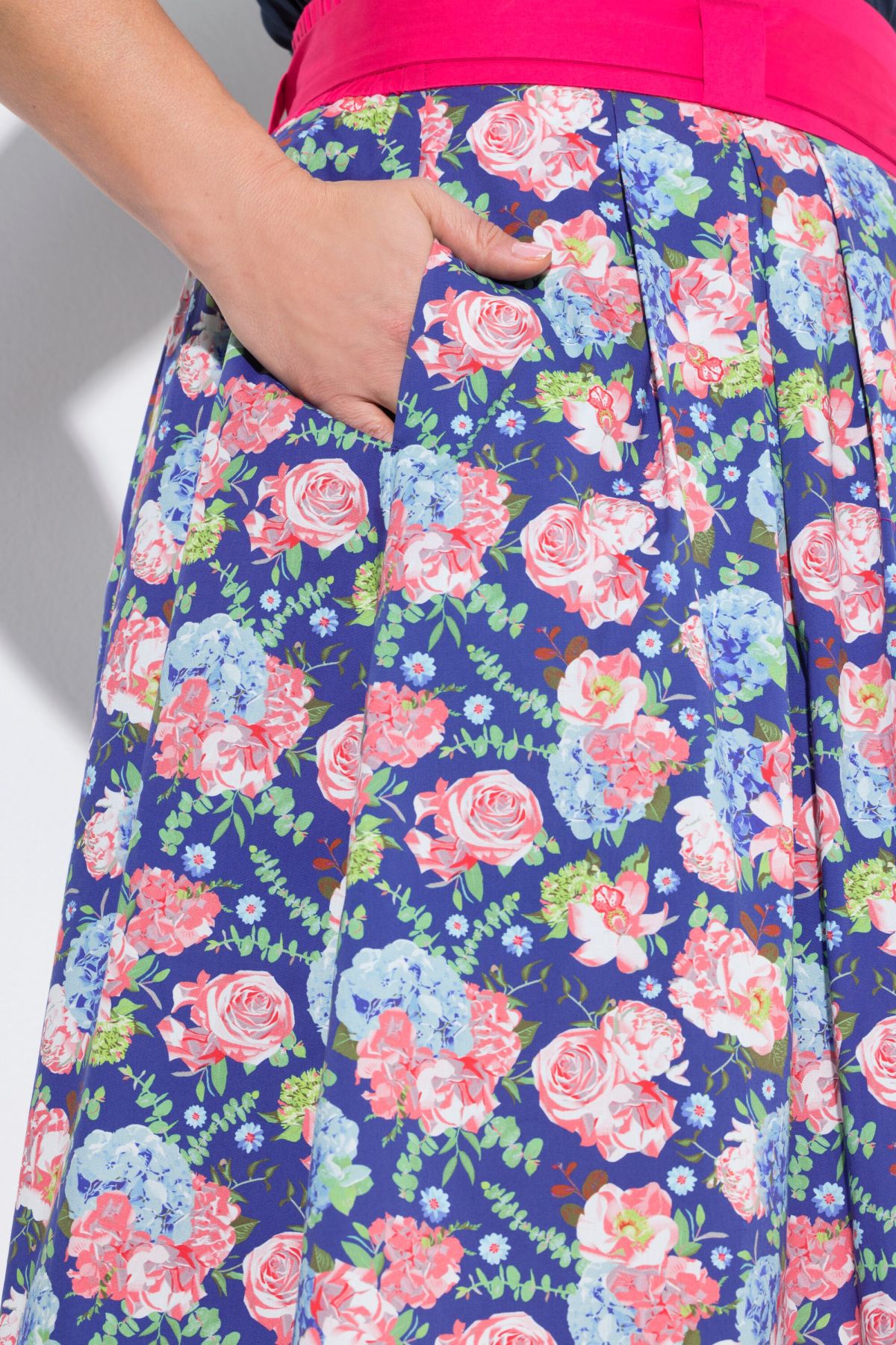 Флорален принт в кънтри стил, удобен А-силует, частично еластична талия с цветна връзка, странични джобове, естествен памук с еластан, дължина, регулирана по размер, приблизително 70-74 см.