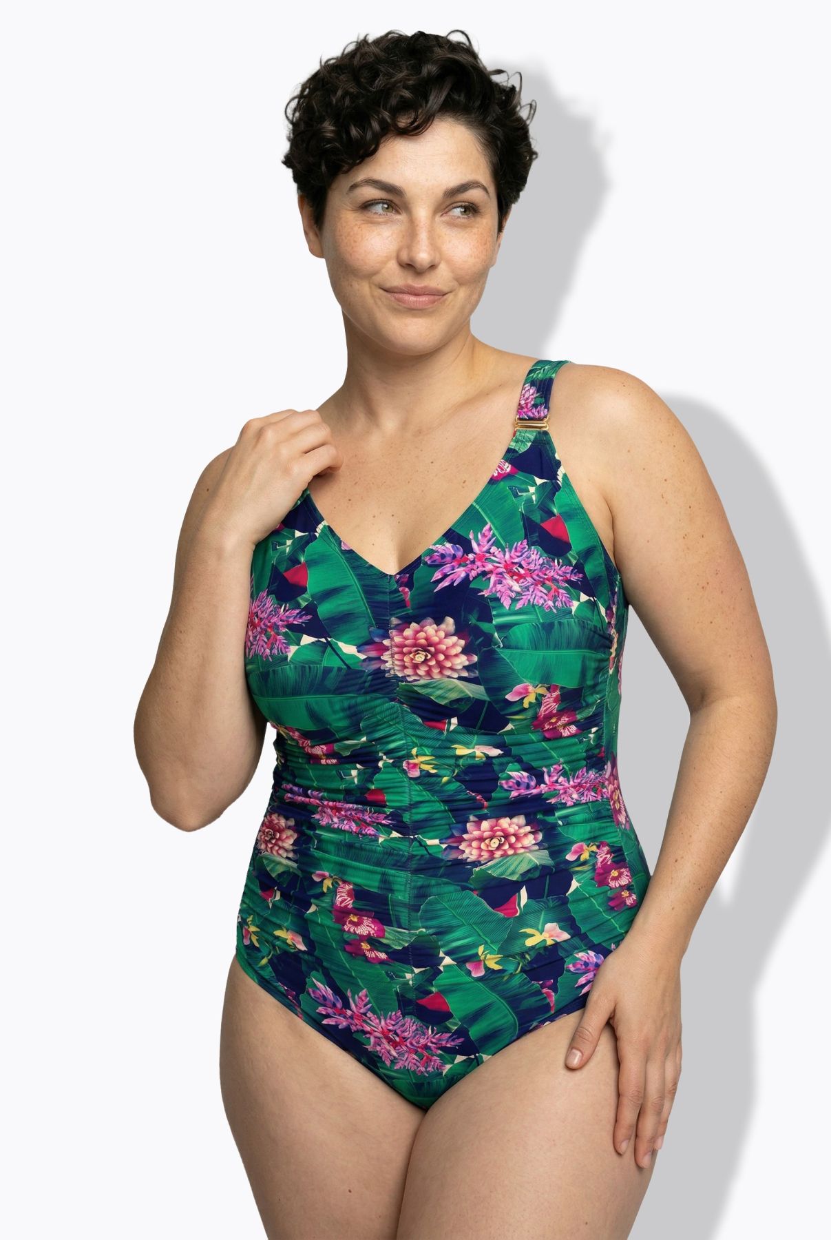 Tropical Floral Print Swimsuit - With vertical ruching for a smoothing effect.