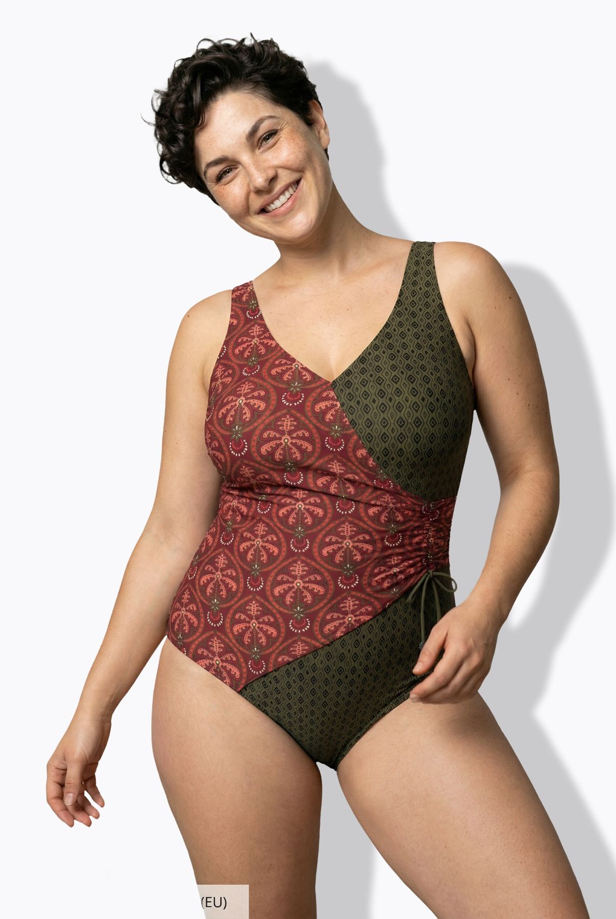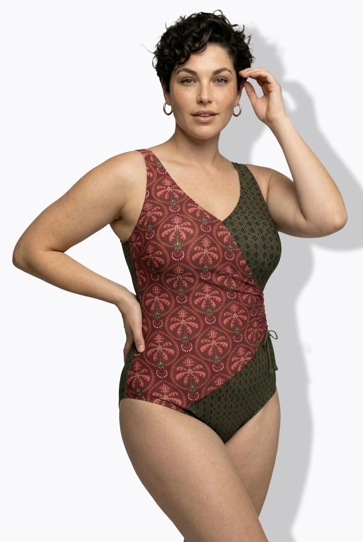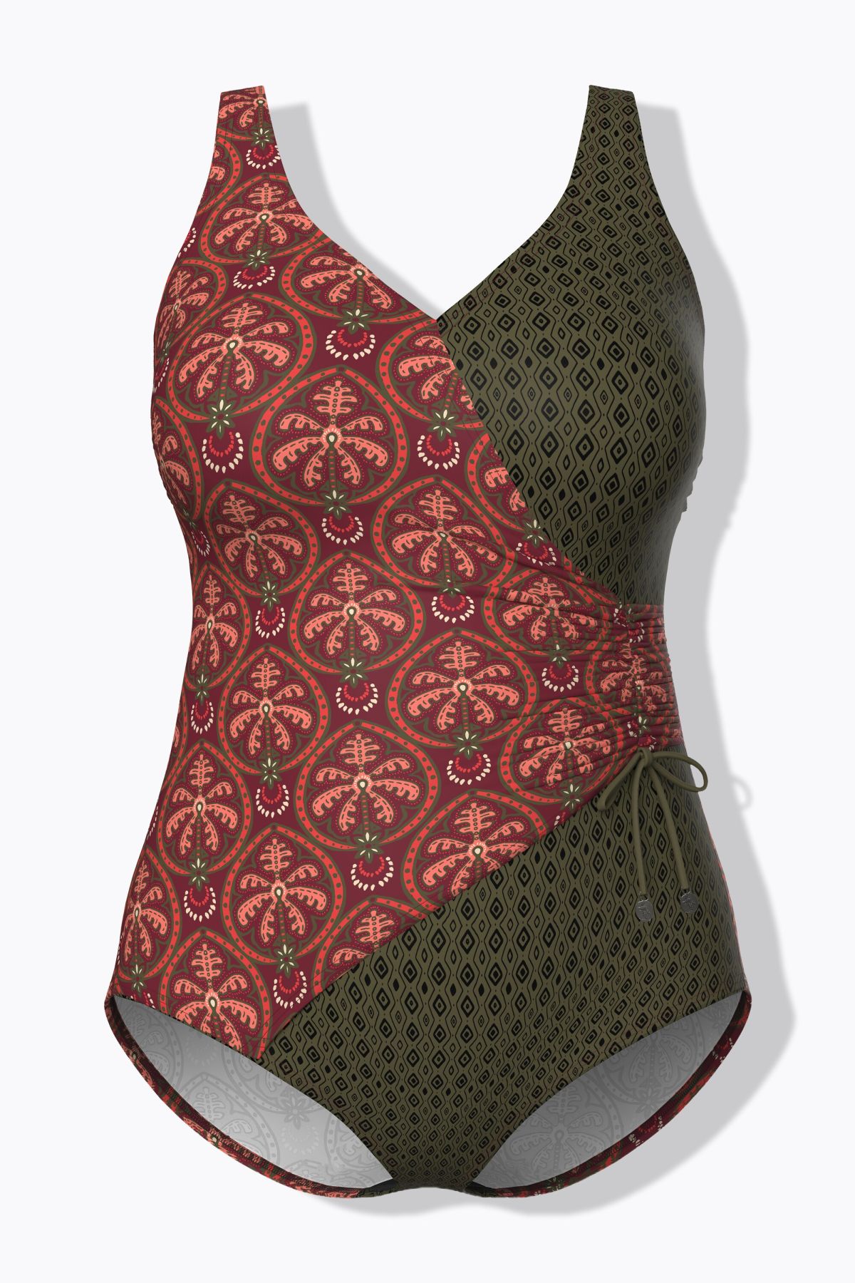 Mixed Boho Print Wrap-Look Swimsuit - An unforgettable style featuring two complementary prints and wrap-look paneling.