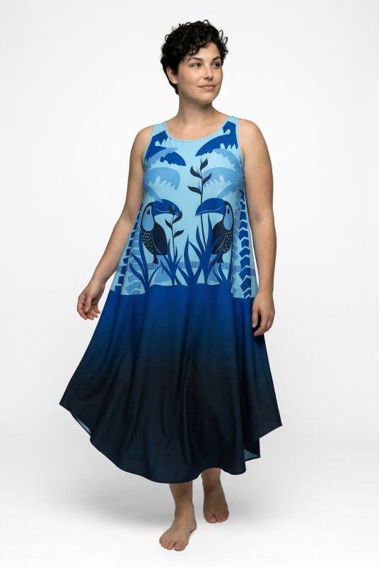 Toucan Print Sleeveless Dress - Beachy style with a trendy pointed hemline.