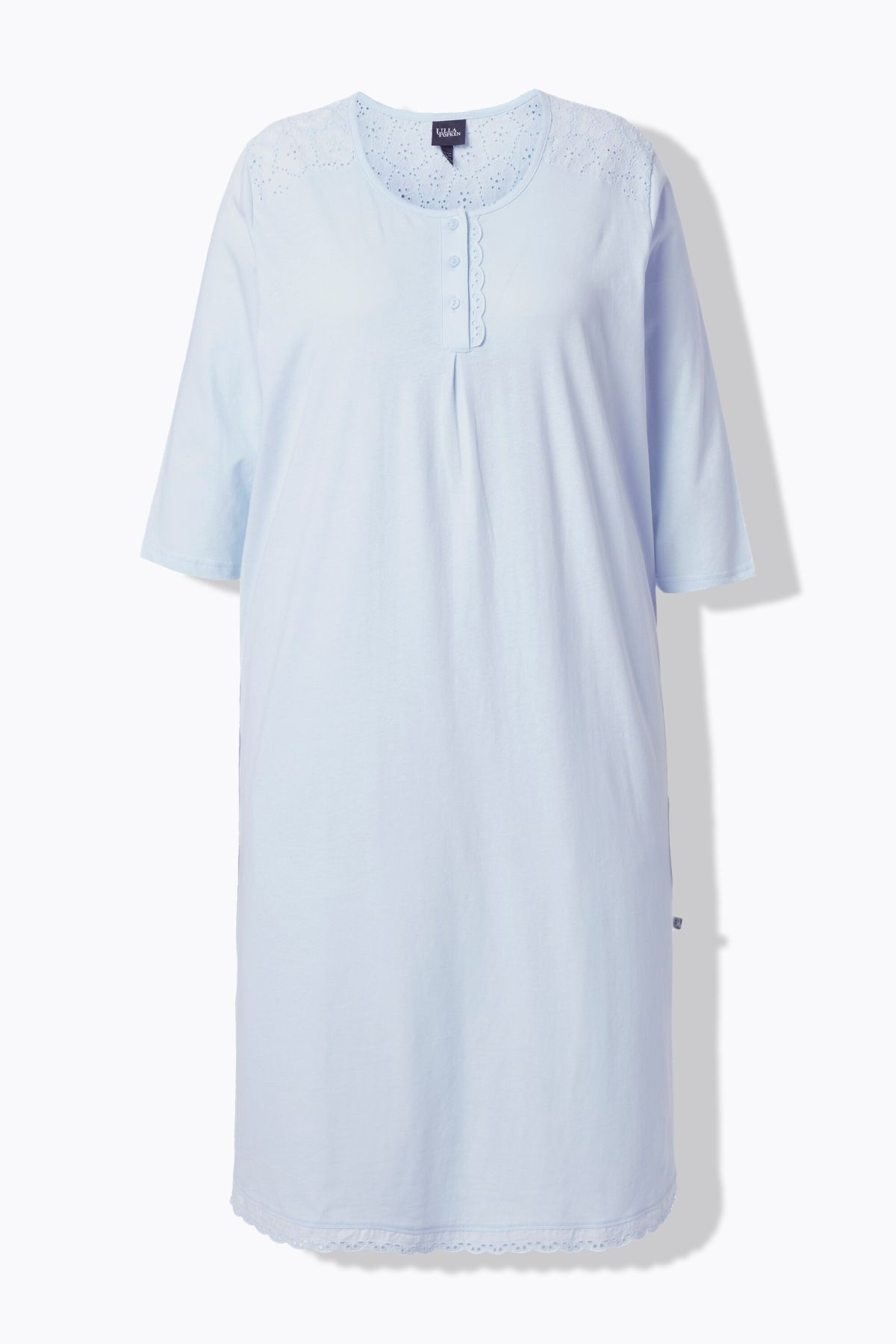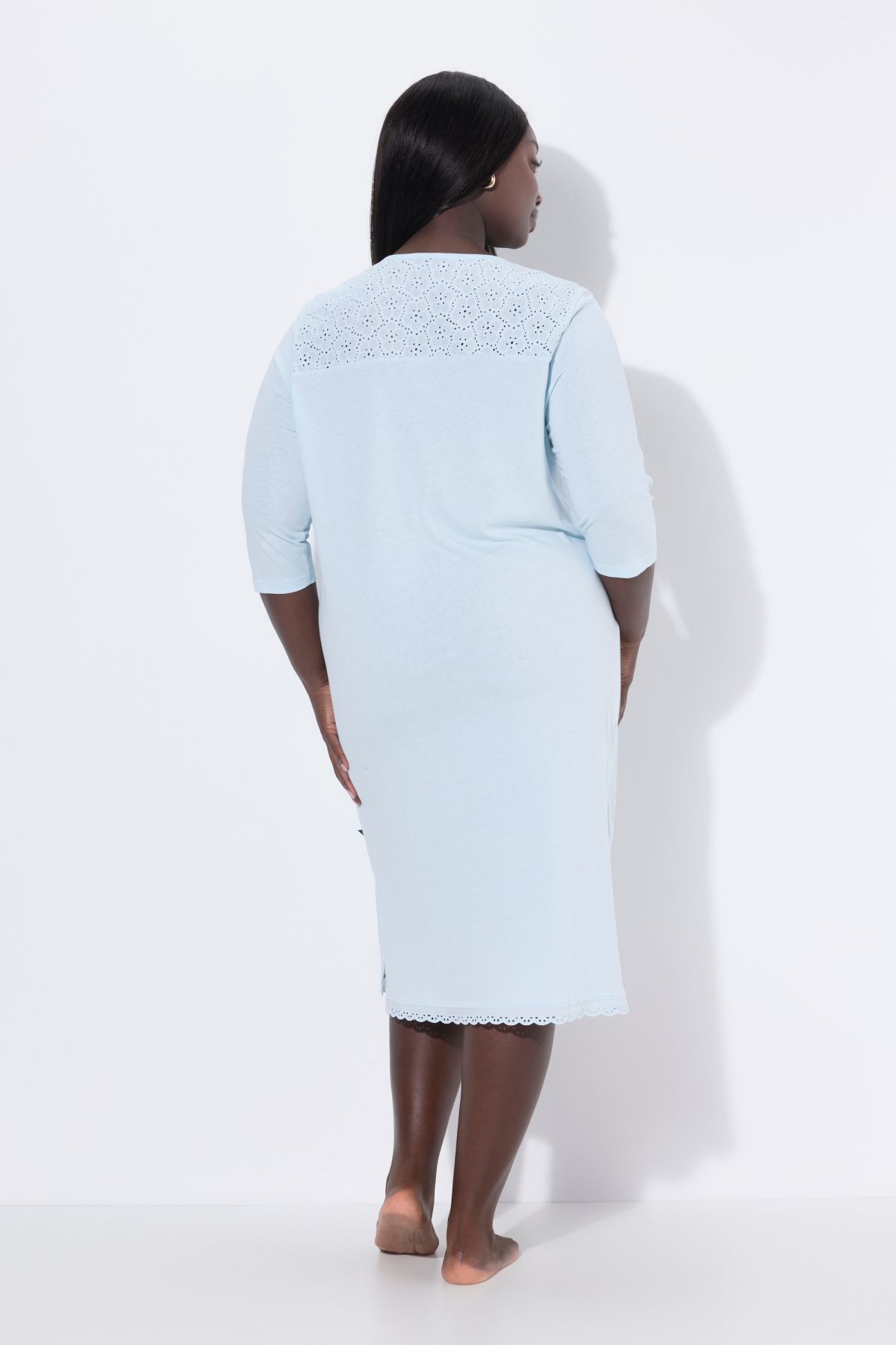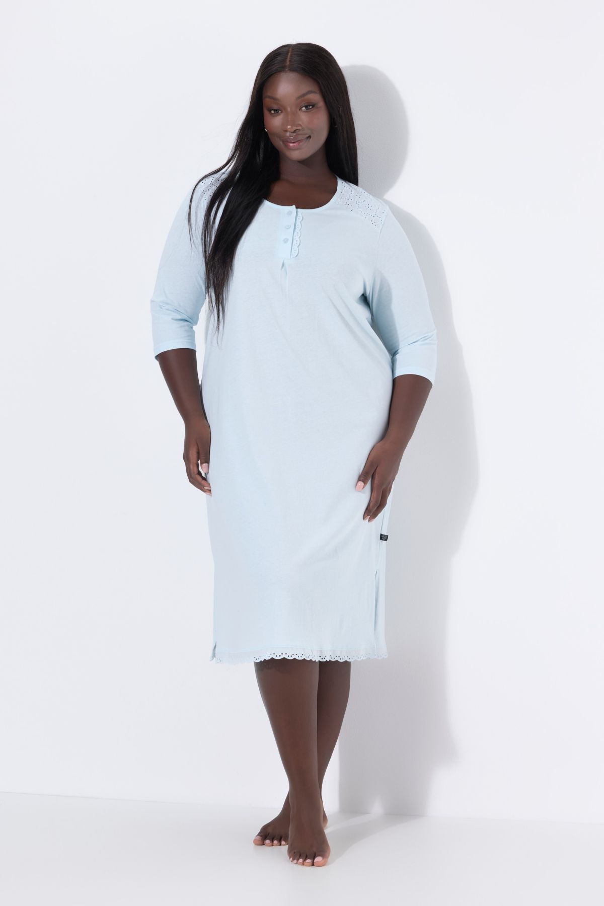 Нощница с бродерия на деколтето с деликатни акценти. Мека, комфортна и женствена. С 3/4 ръкави, странични цепки на подгъва .