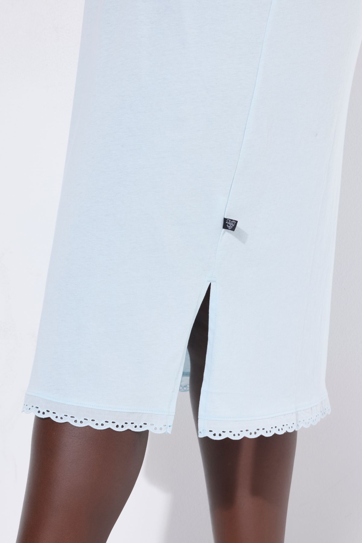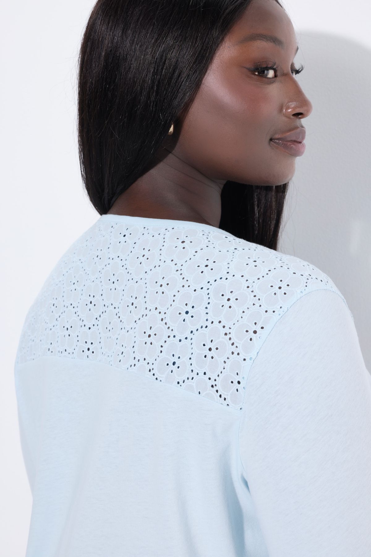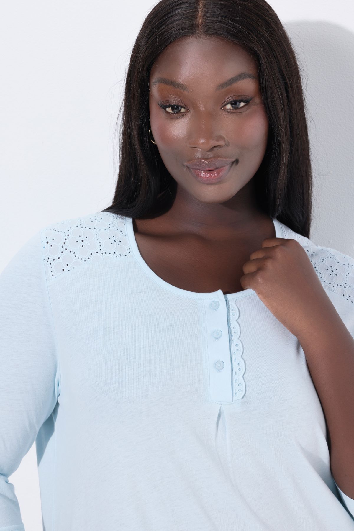 Нощница с бродерия на деколтето с деликатни акценти. Мека, комфортна и женствена. С 3/4 ръкави, странични цепки на подгъва .