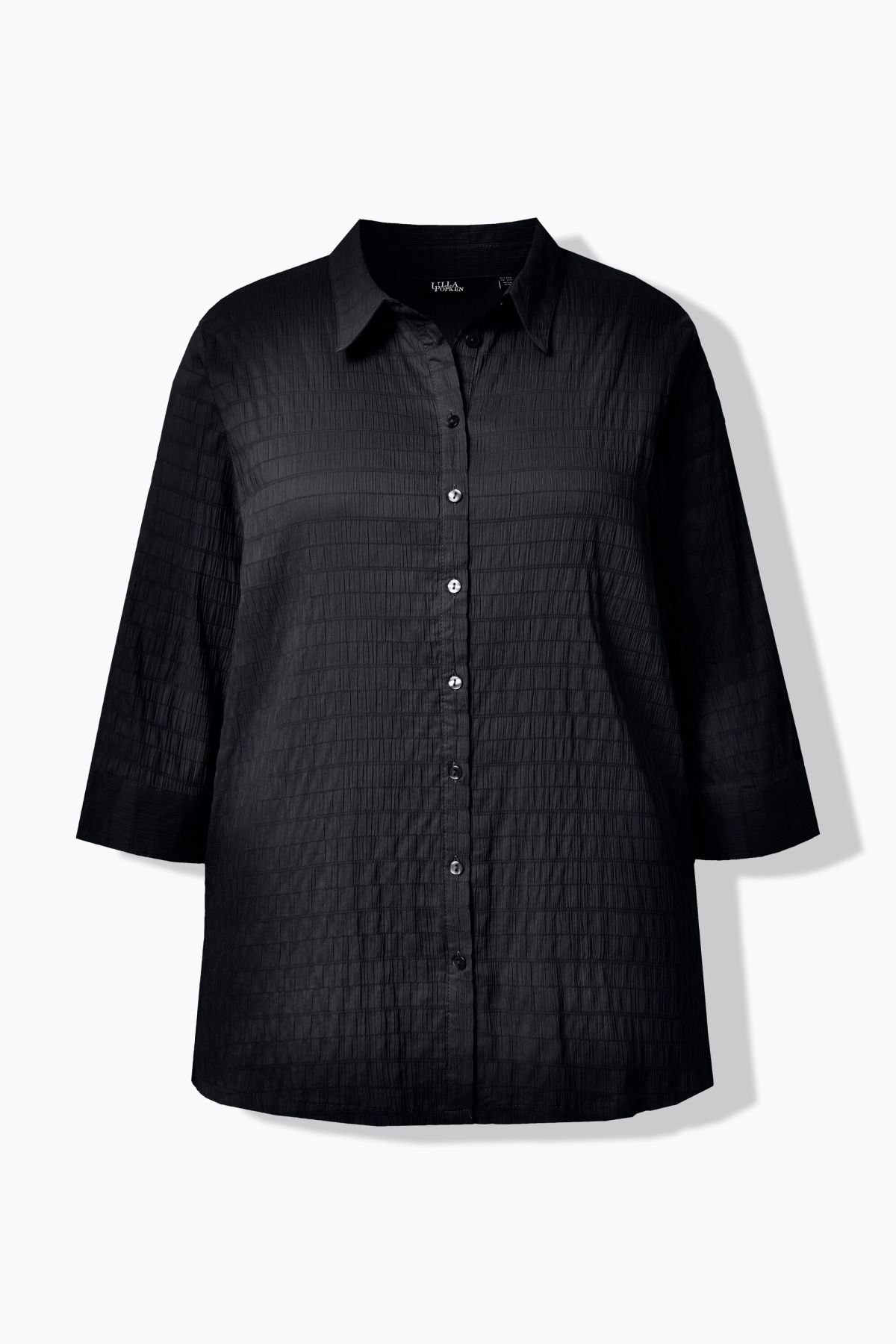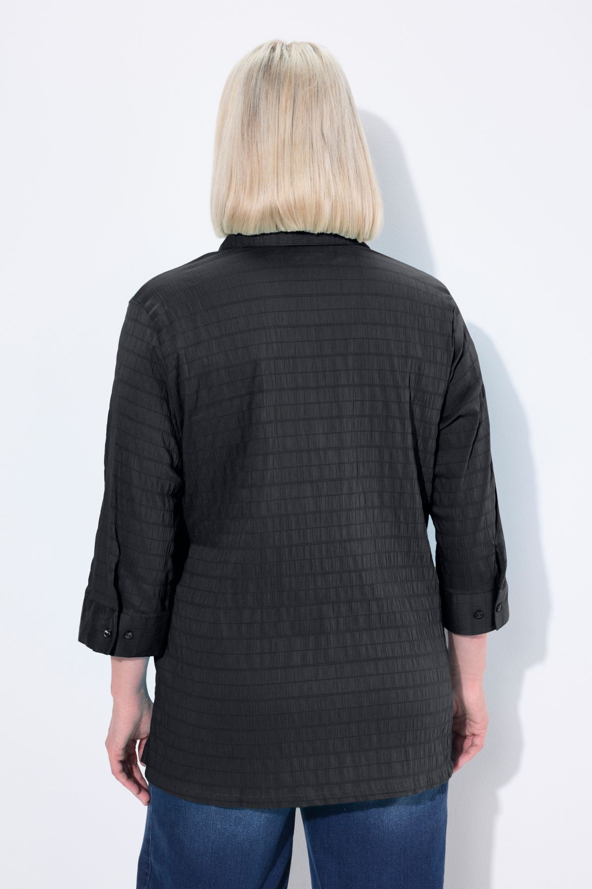 Риза с яка и релефни мотиви. С копчета, 3/4 ръкави с маншет и странични цепки.