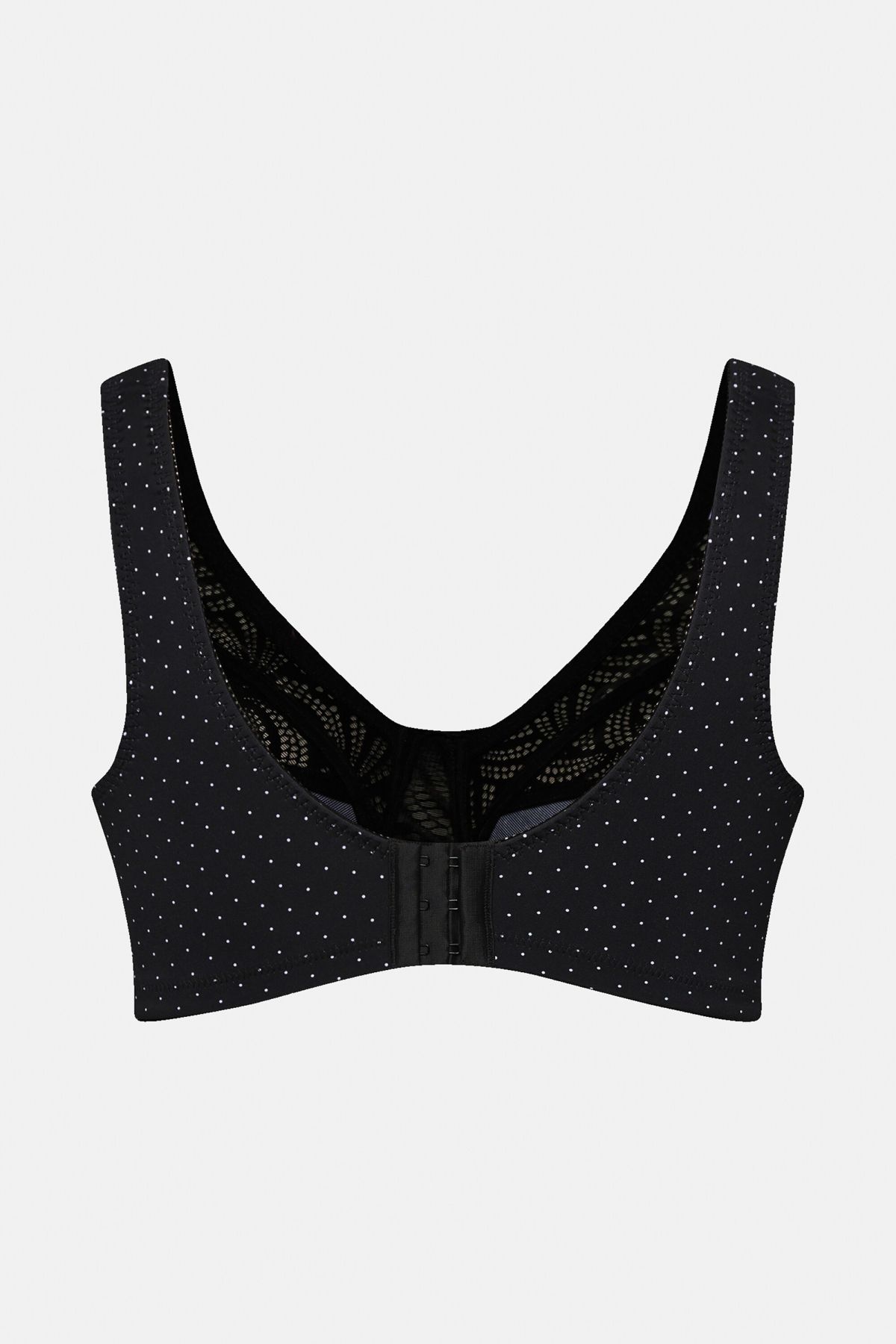 Сутиен с игриви точки и прозрачна дантела. С елегантна визия и комфортни широки презрамки и комфортна кройка. Със задно закопчаване с метални кукички.