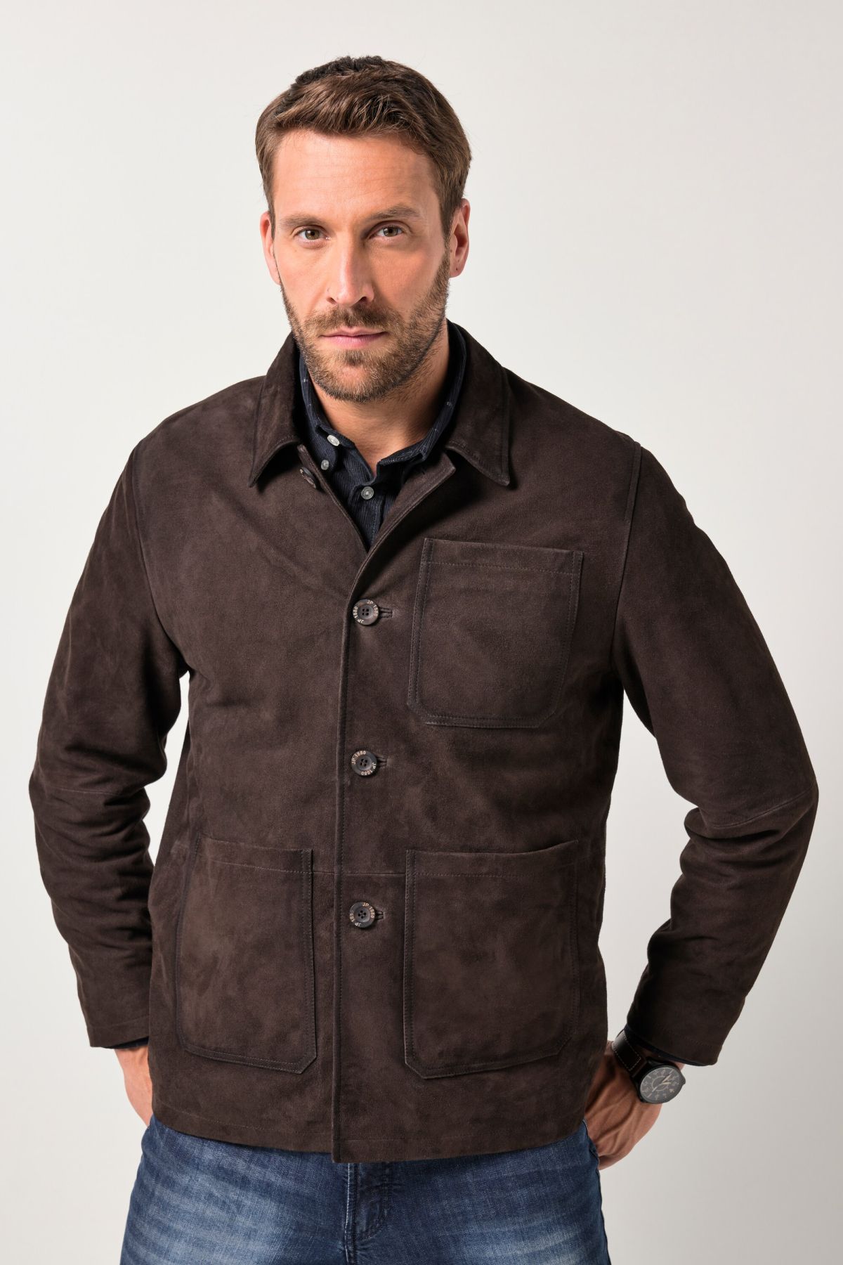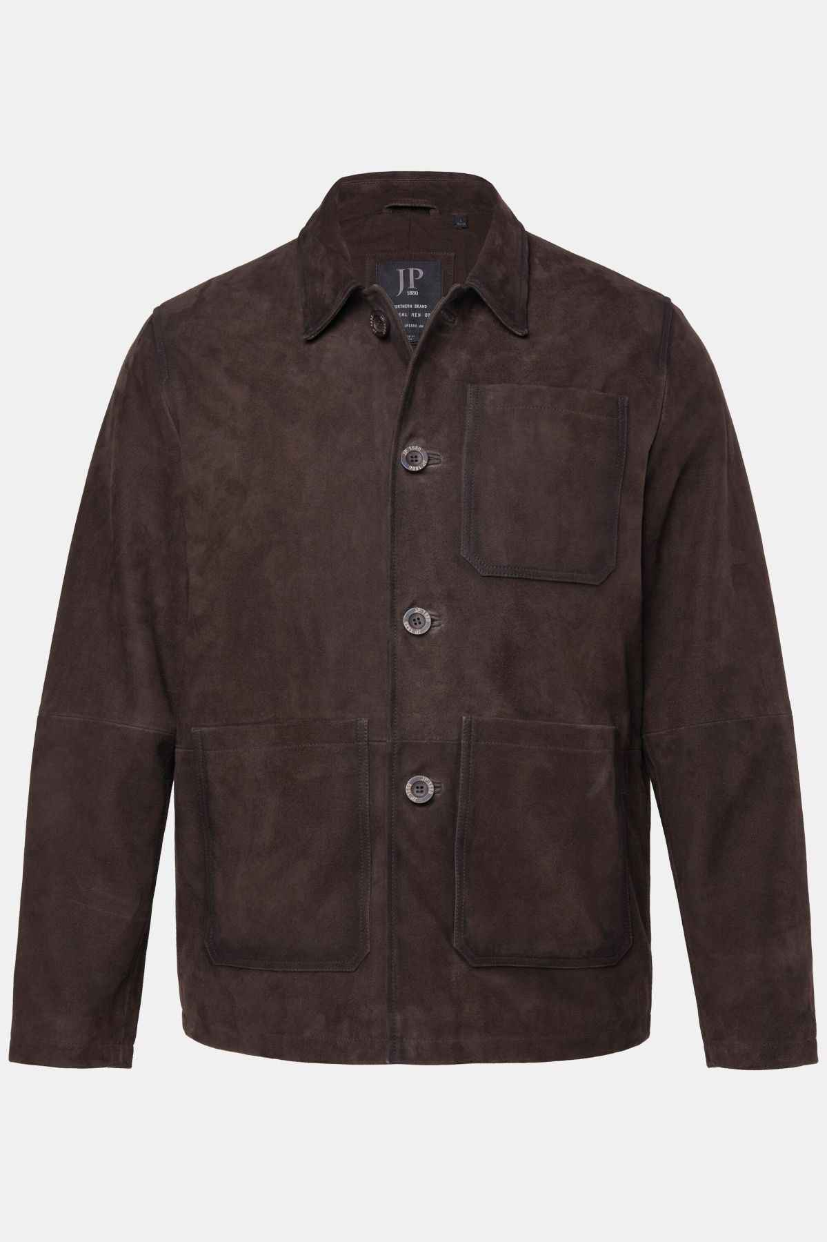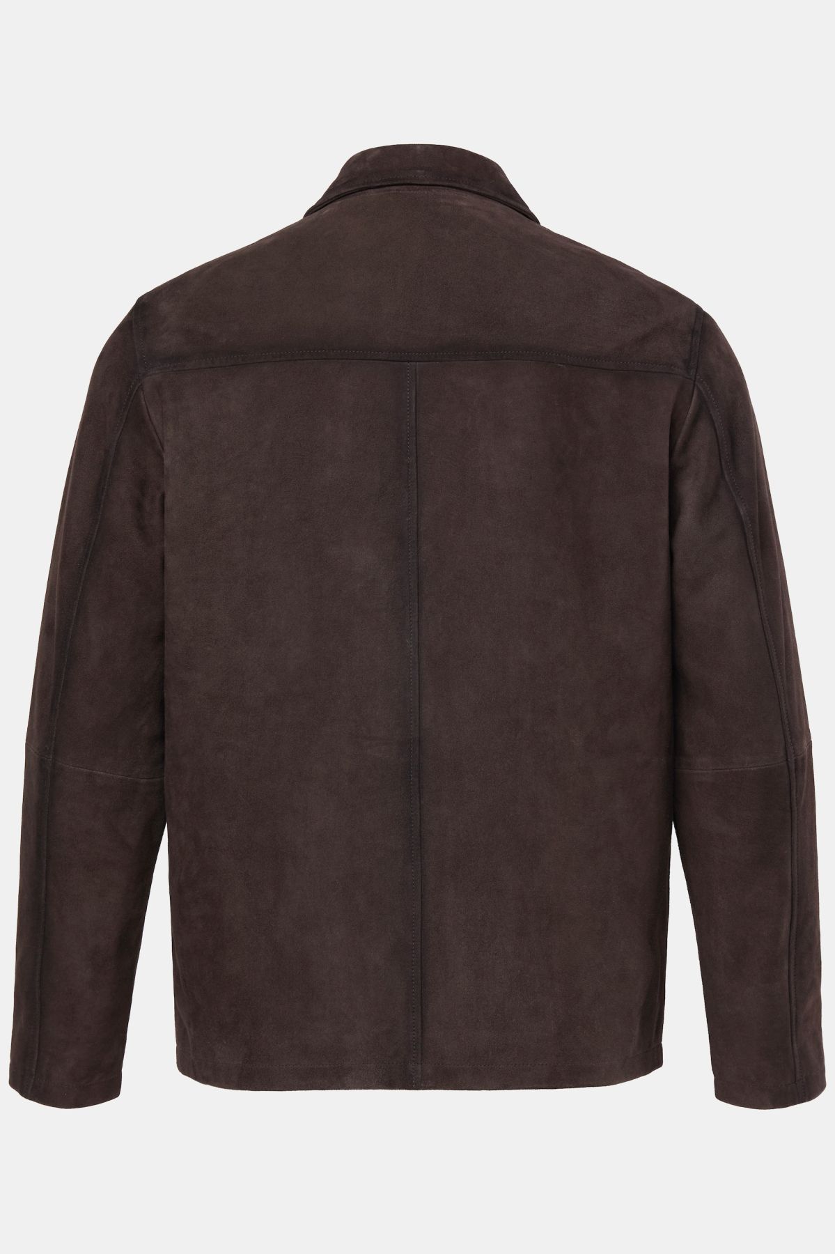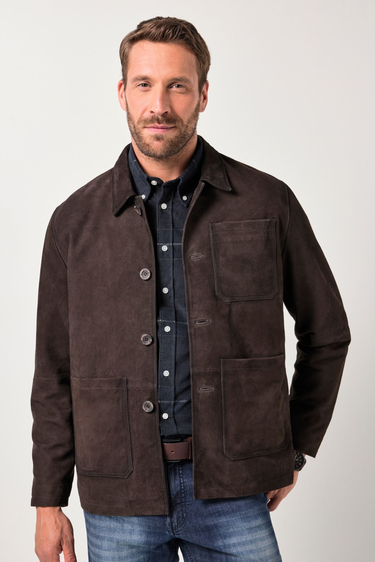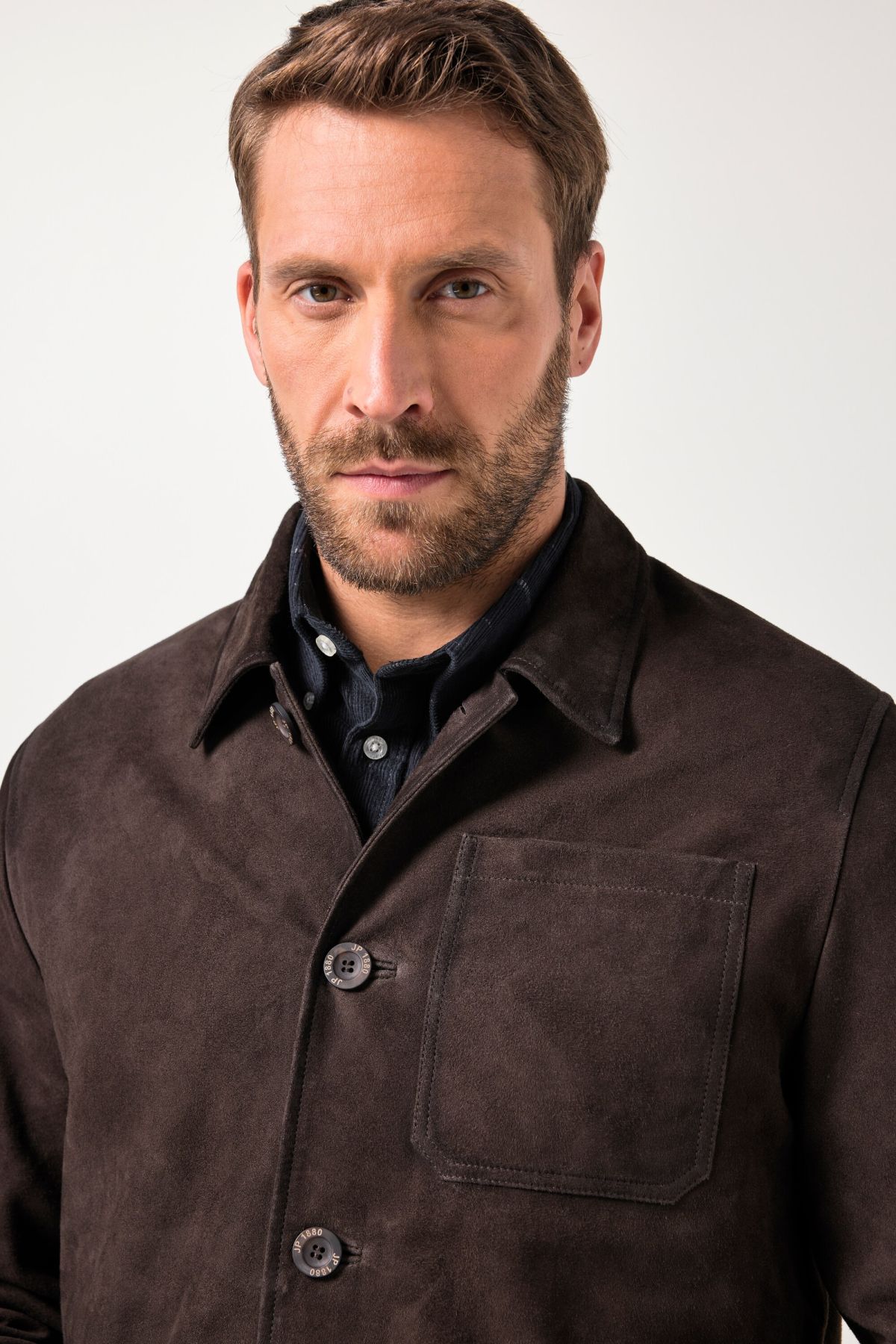 Яке от естествена кожа с велурен завършек. С дизайн на риза с яка, копчета отпред и джобове на гърдите. С дълги ръкави.