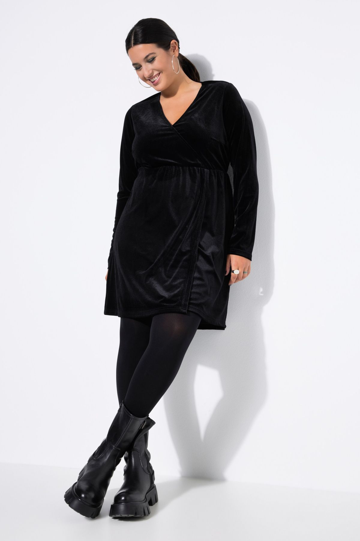 Рокля с А - линия на силуета изработена от елегантна кадифена материя с визия тип прегърни ме. С V - образно деколте, дълги ръкави и двойна пола отпред.