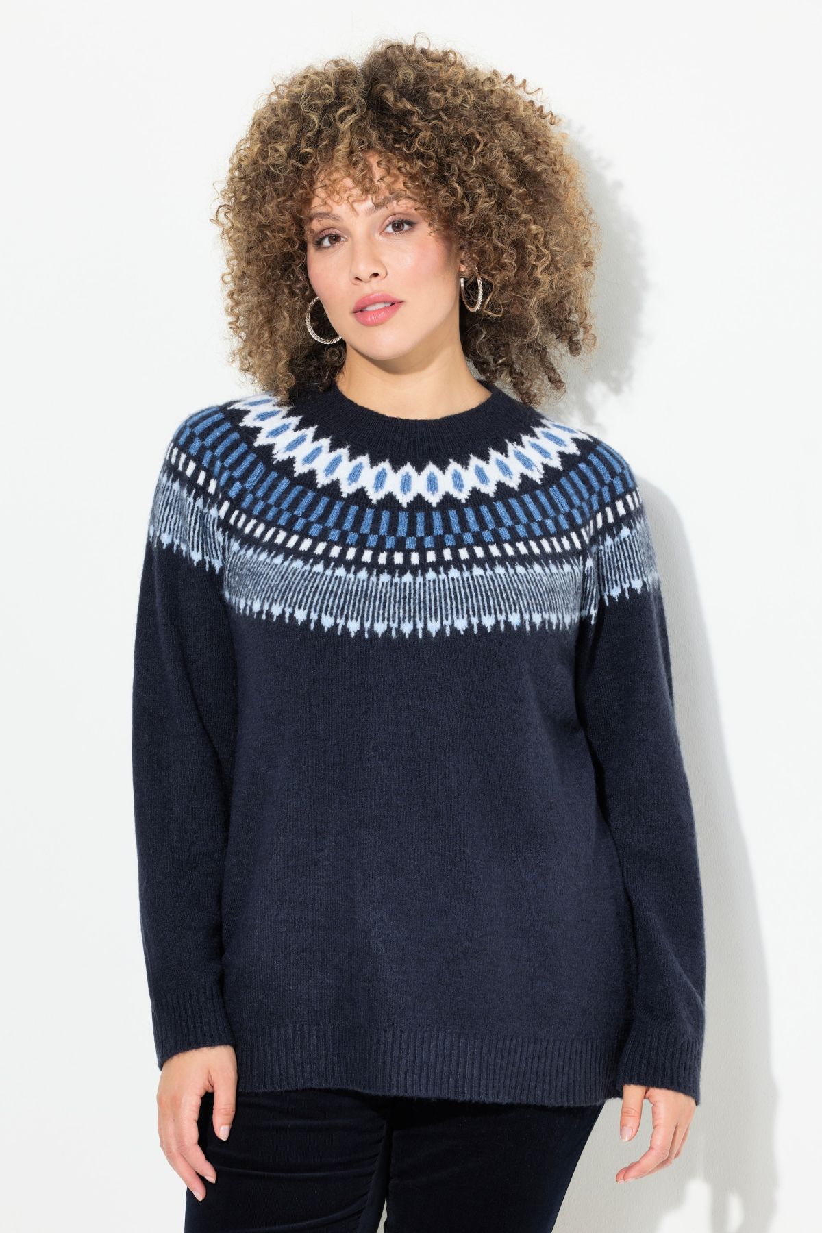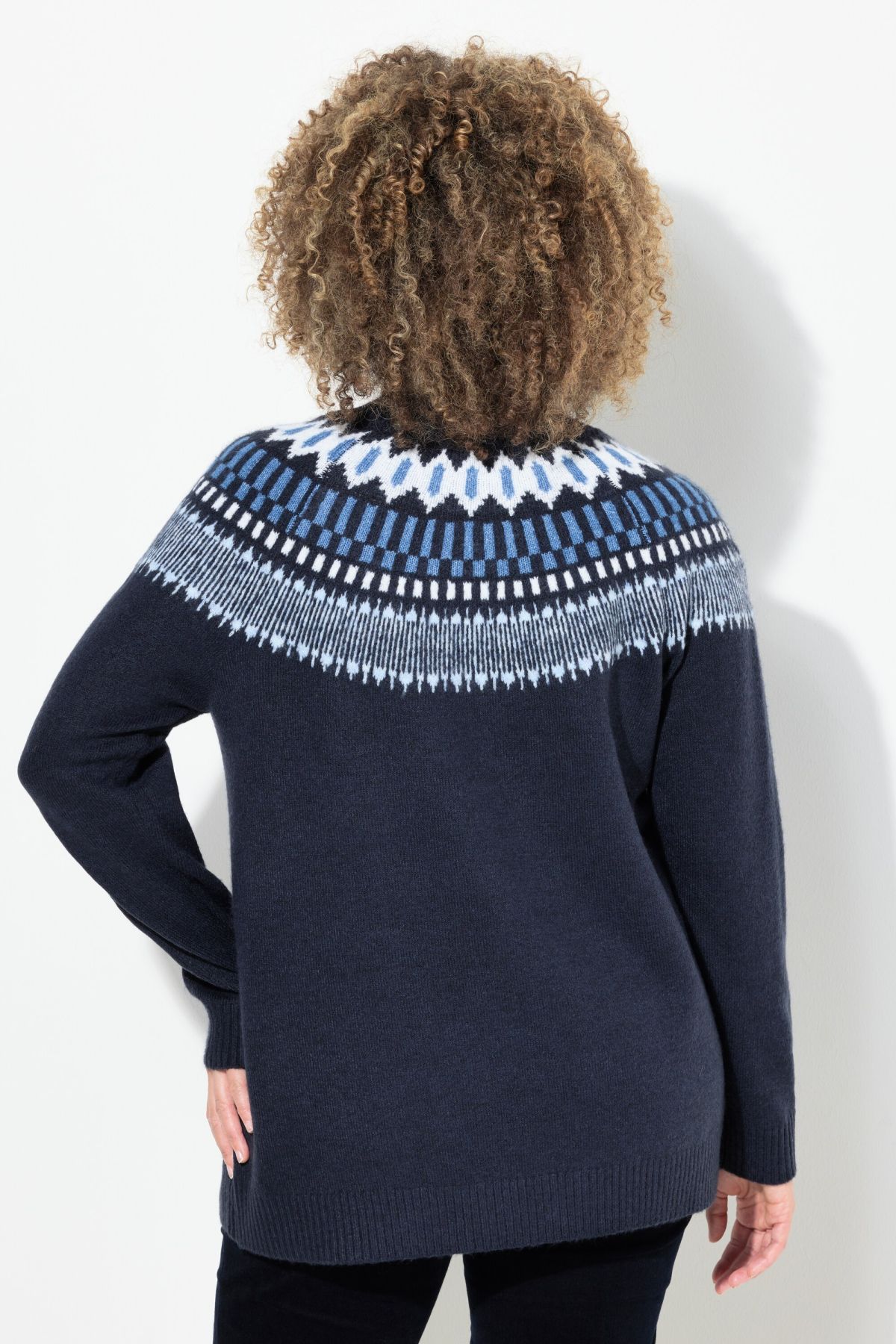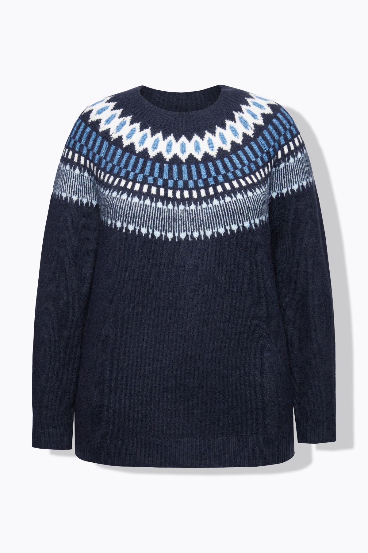 Пуловер с норвежки принт с класически силует, перфектен за студените месеци. С кръгло деколте по врата и дълги ръкави.