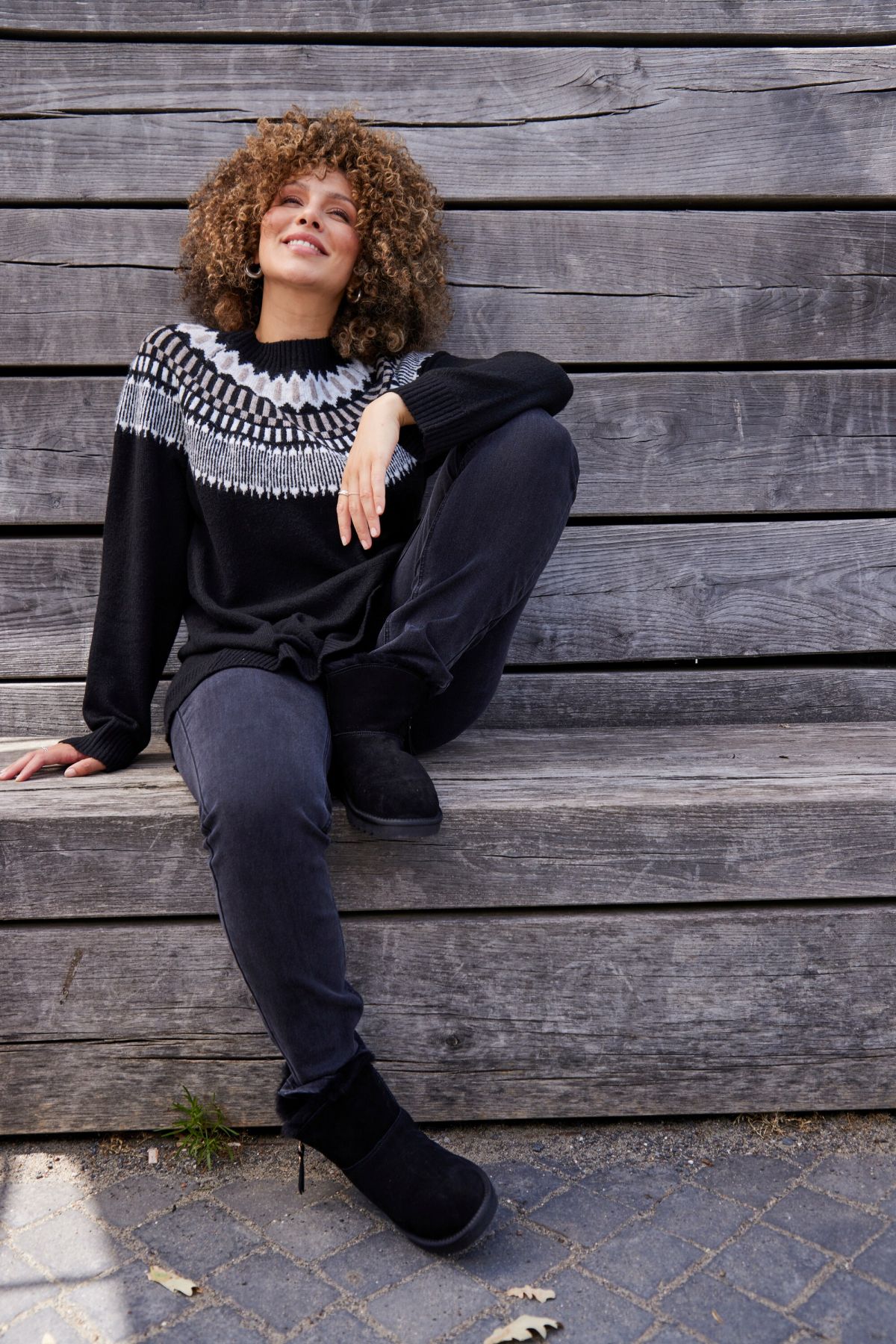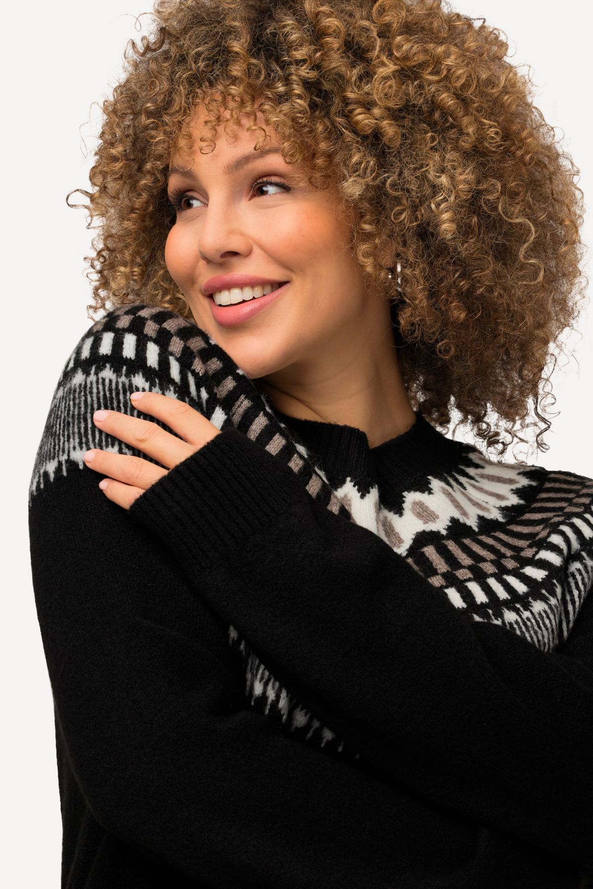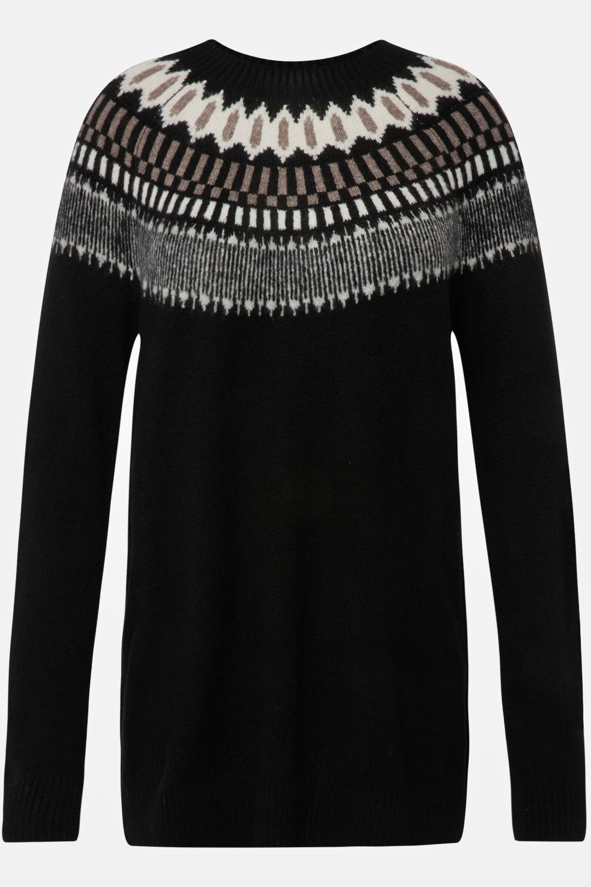 Пуловер с норвежки принт с класически силует, перфектен за студените месеци. С кръгло деколте по врата и дълги ръкави.