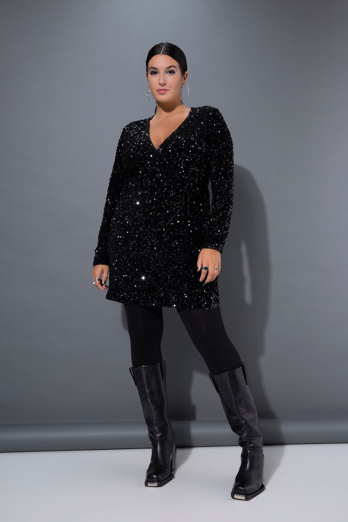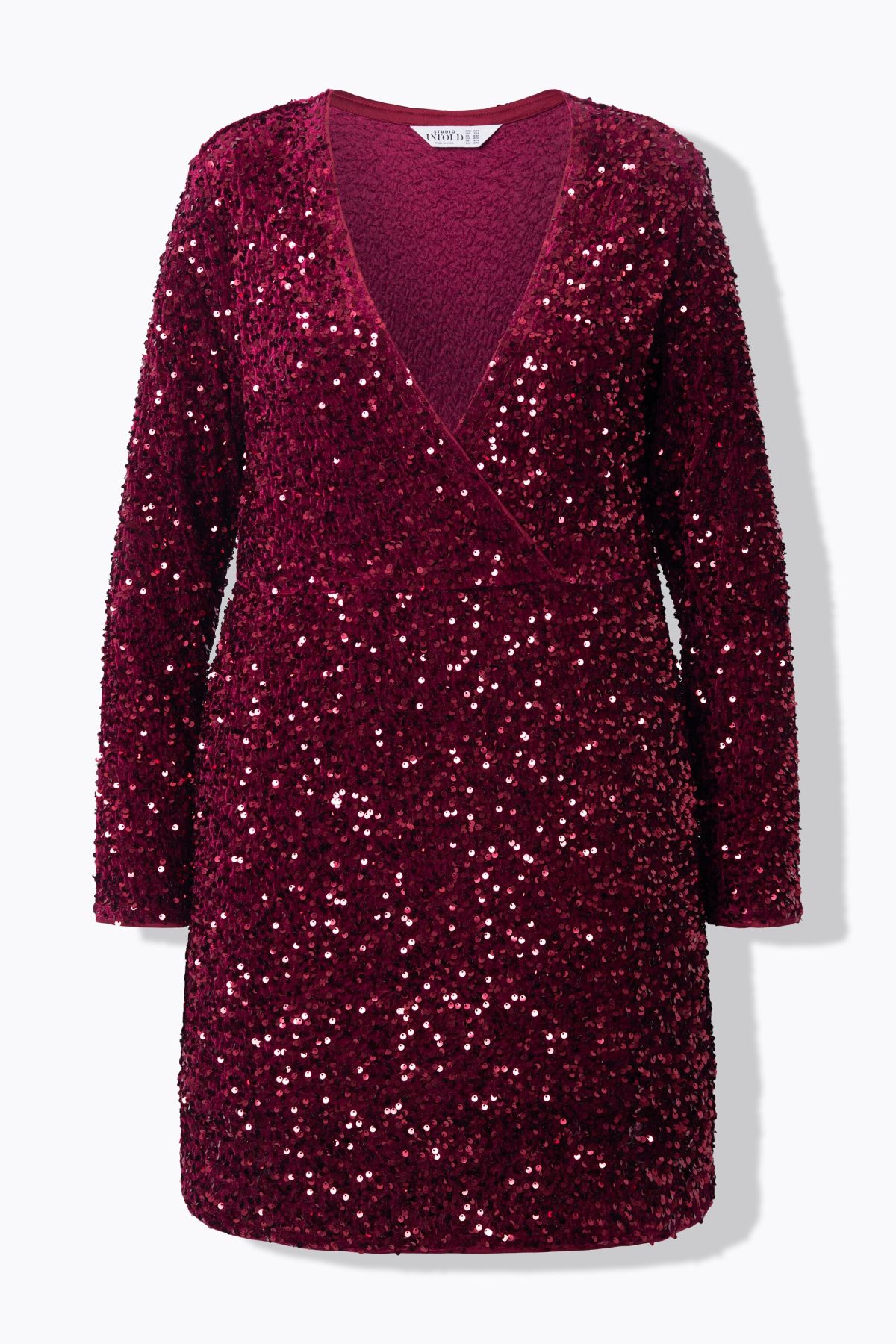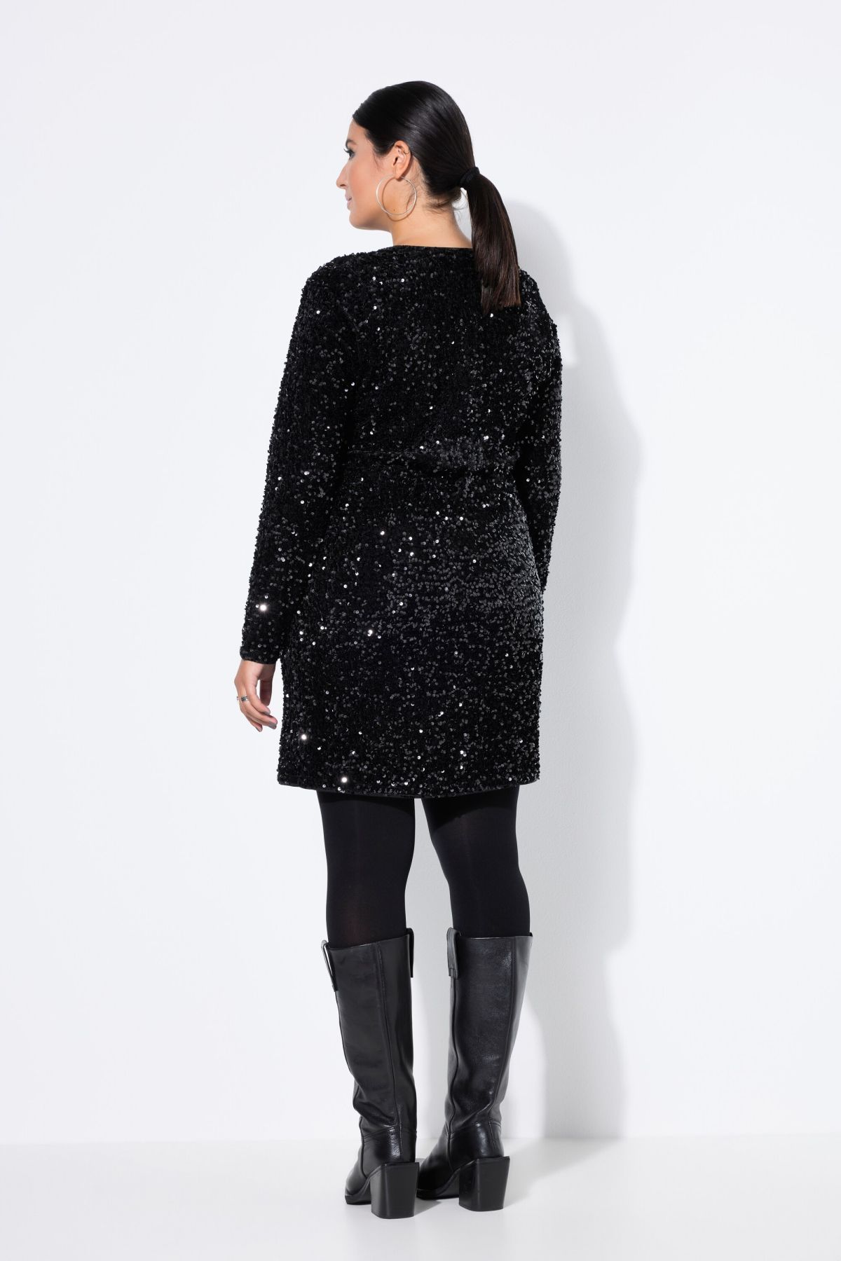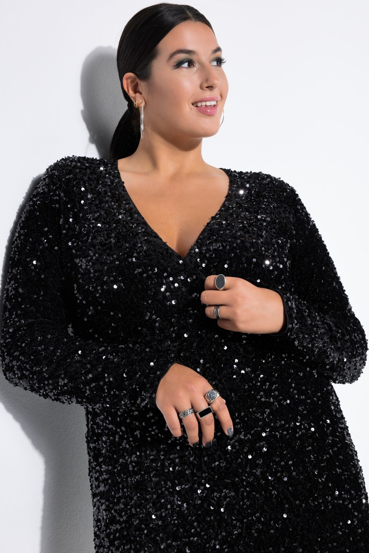 Рокля с пайети с елегантен силует и визия тип прегърни ме. Перфектна за парти или нова година. С V -образно деколте и дълги ръкави.