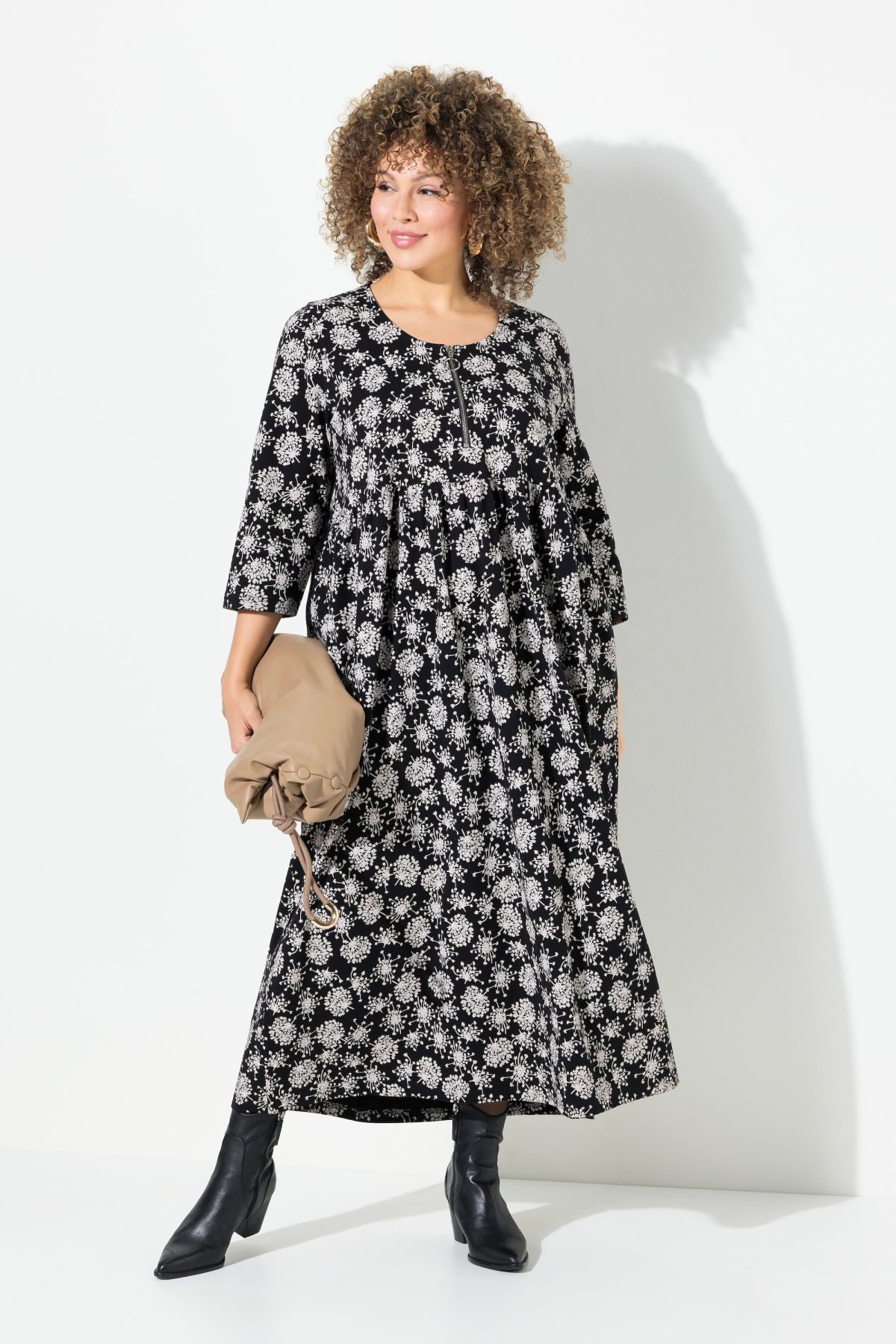 Рокля с принт на глухарчета - добавете частица пролет в зимния си гардероб. С дълбоко кръгло деколте с цип, еластична талия и дълги ръкави.