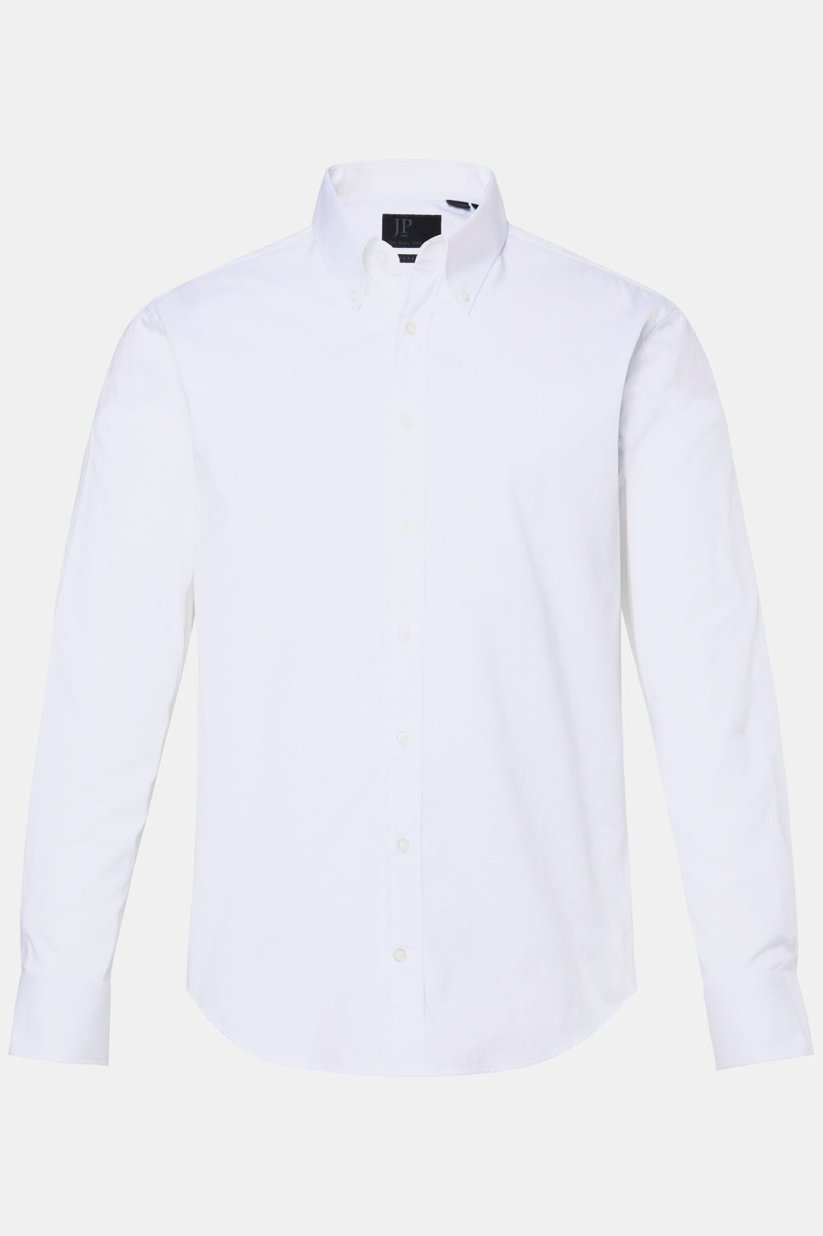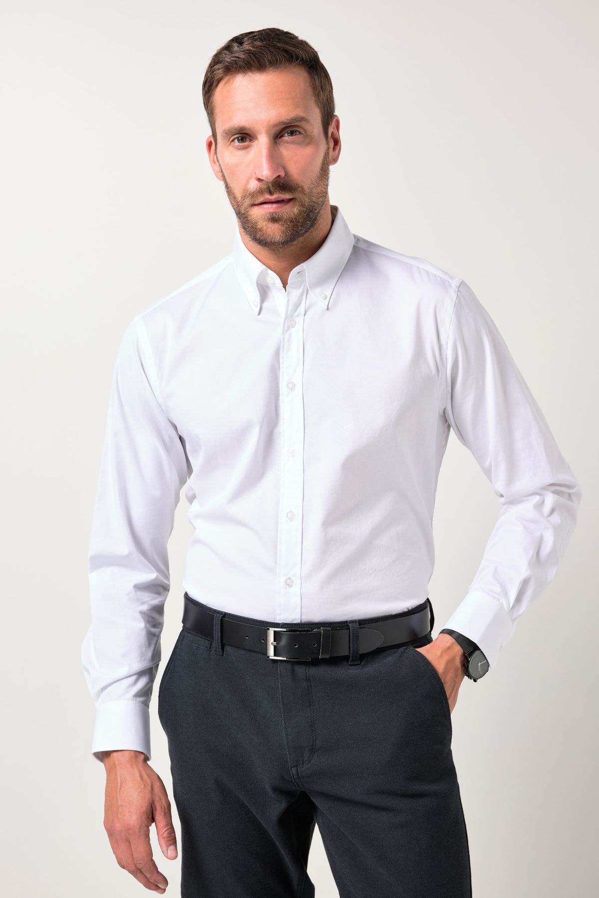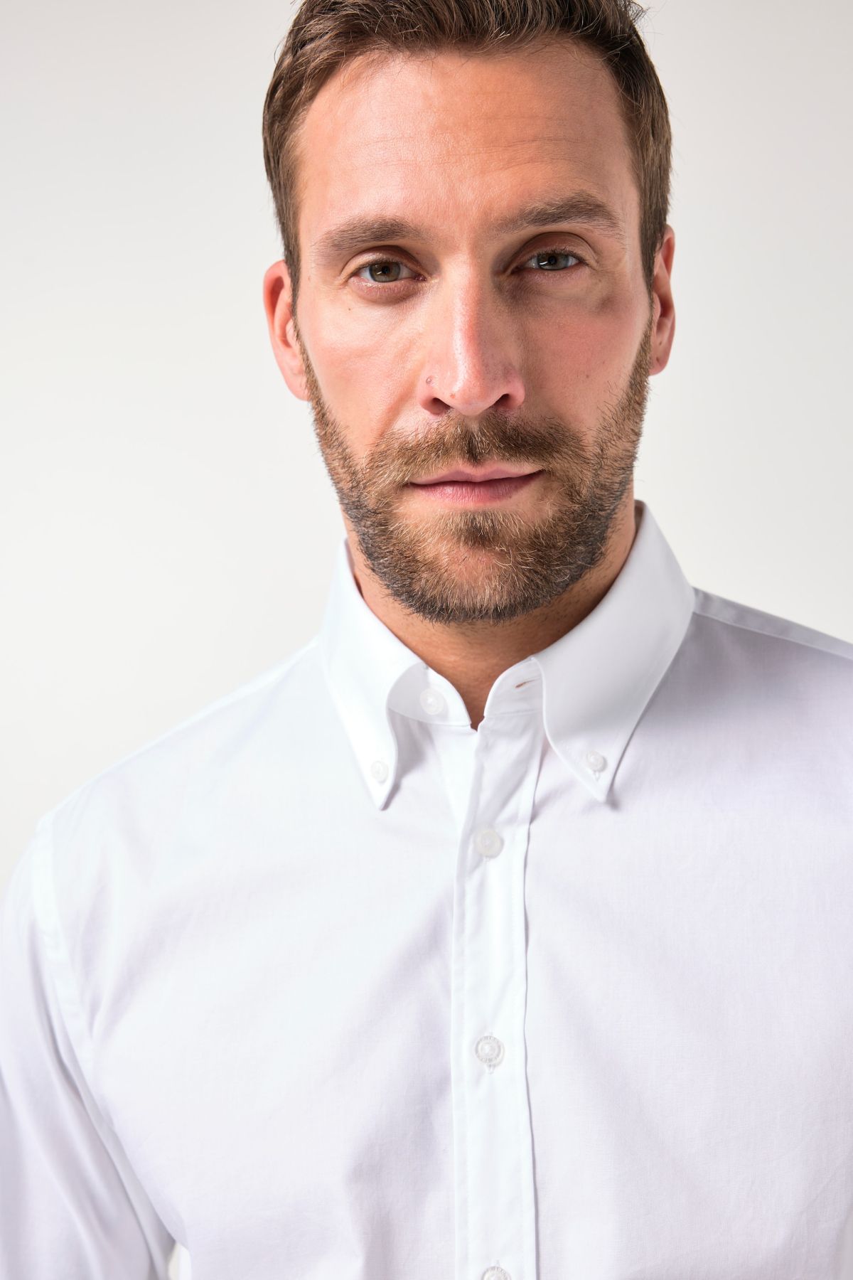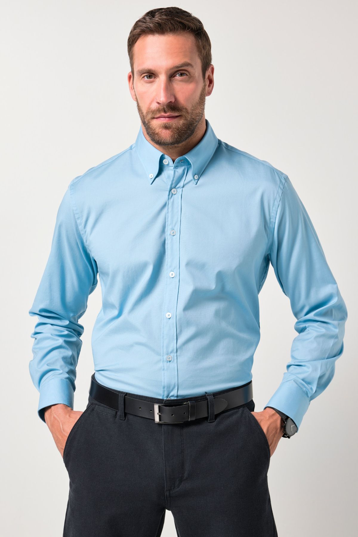 Едноцветна риза с елегантна визия. С дълги ръкави, изправена яка и модерна кройка. С дълги ръкави с маншет с копче.