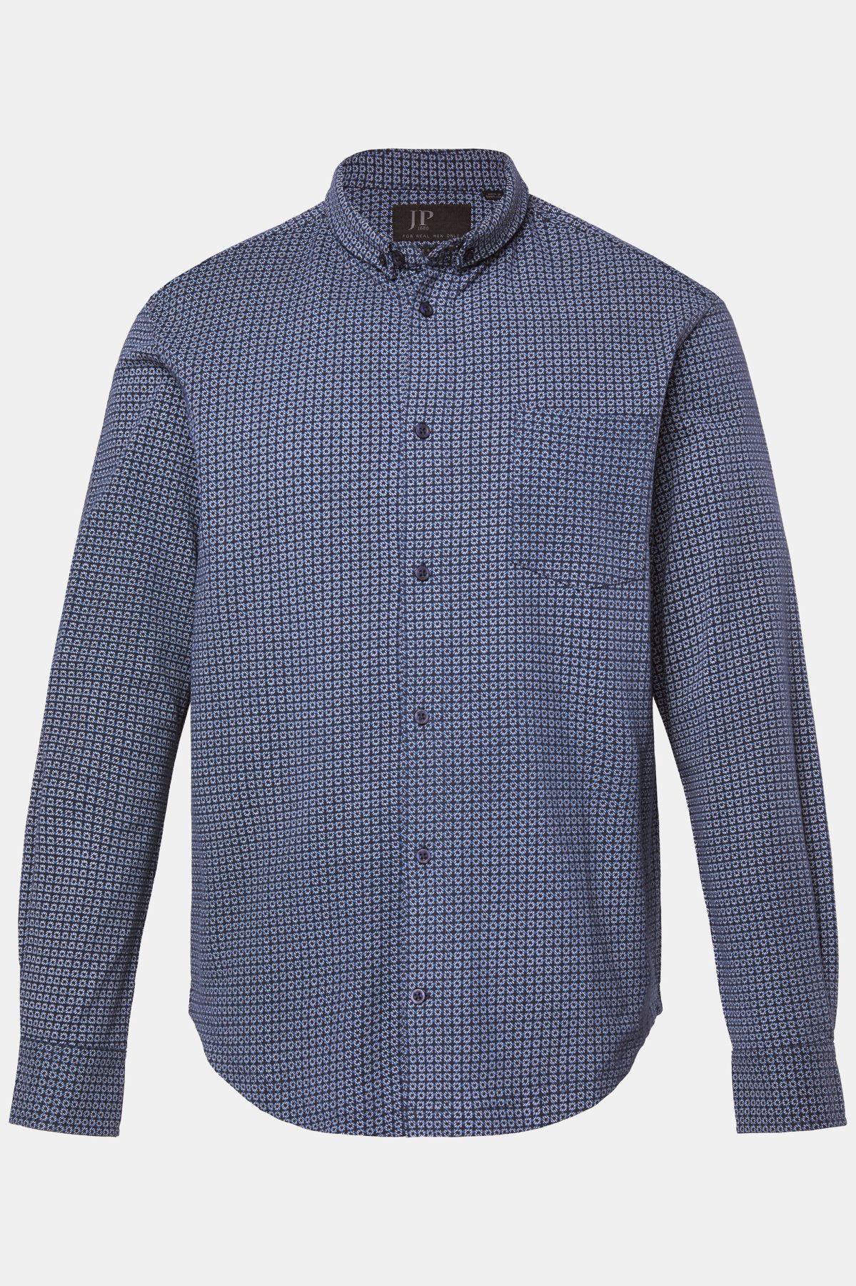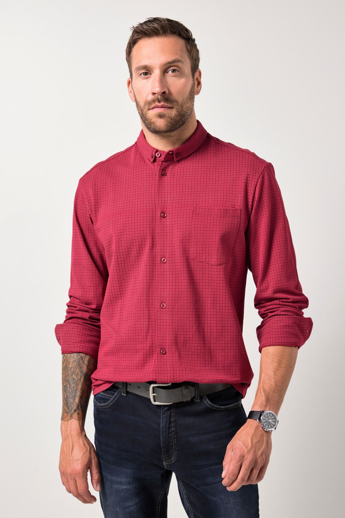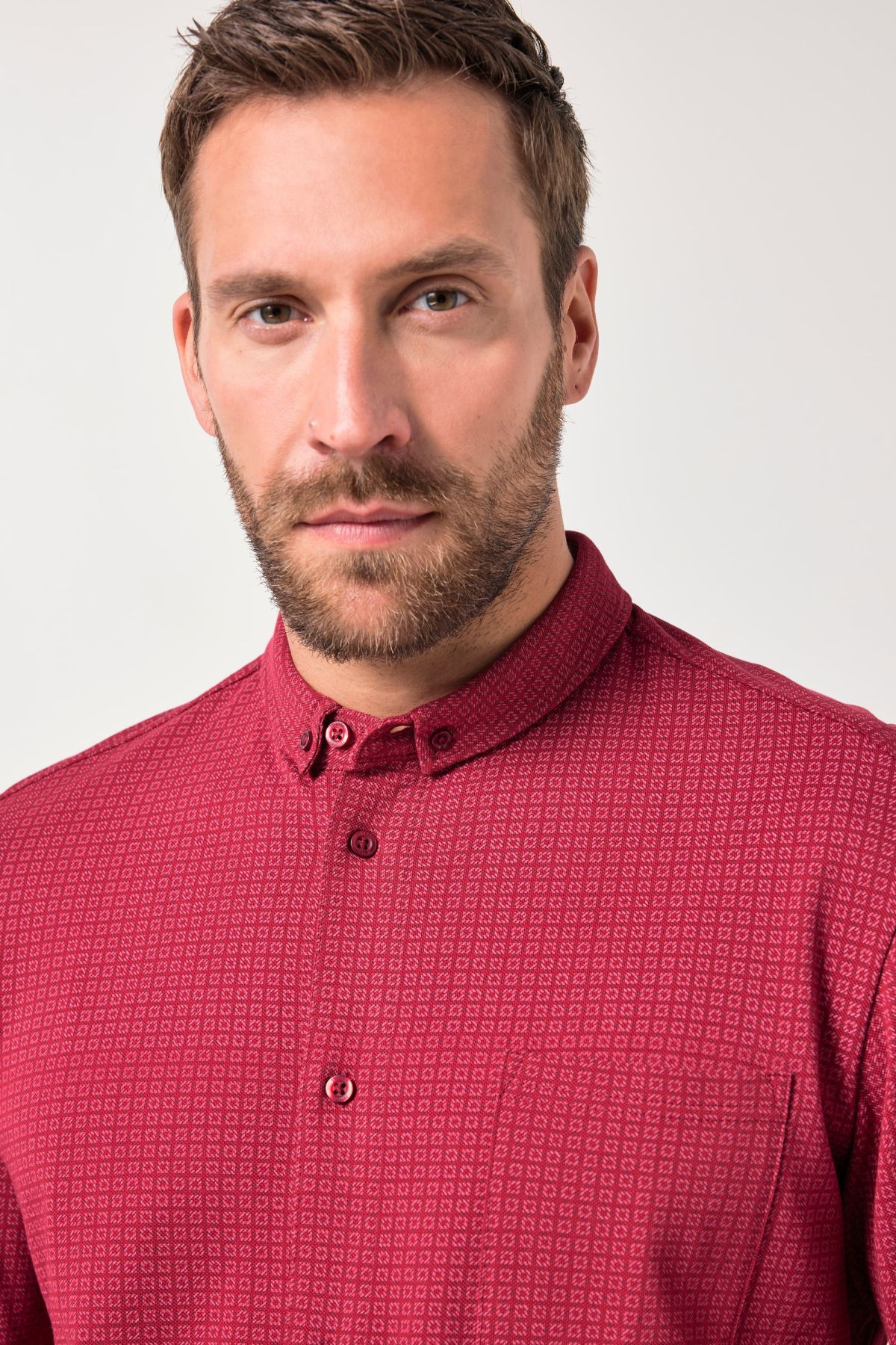 Риза със ситен принт. Дизайн с малка изправена яка с копчета, копчета отпред, дълги ръкави с маншет и мека памучна материя. Стил и комфорт в ежедневието.