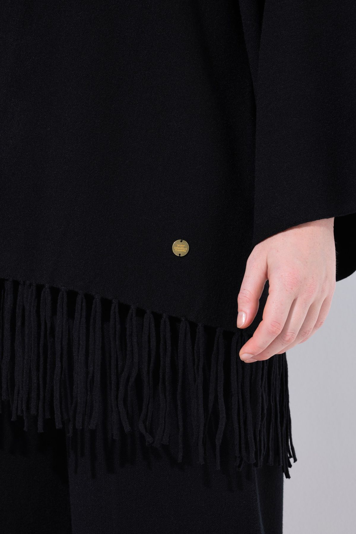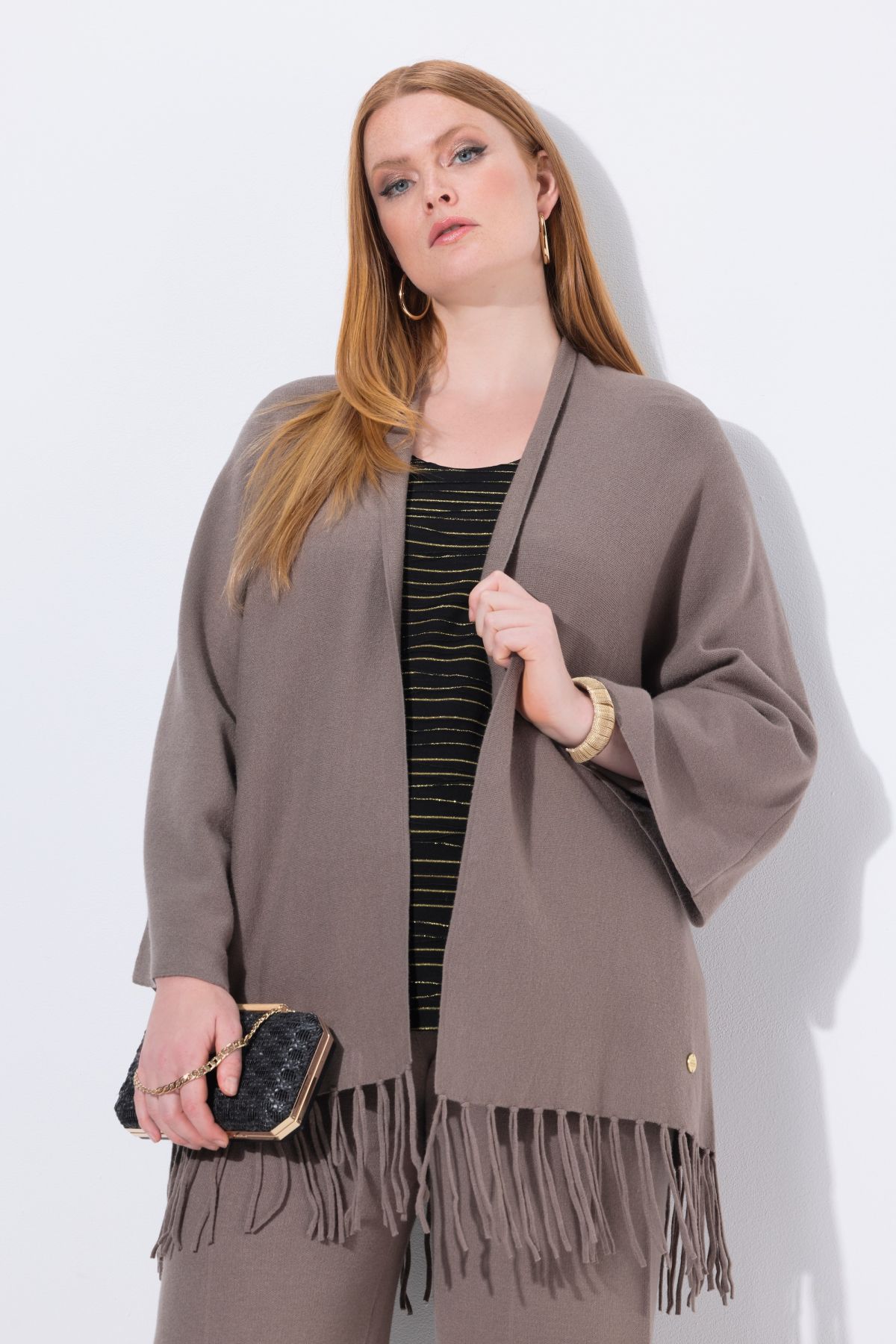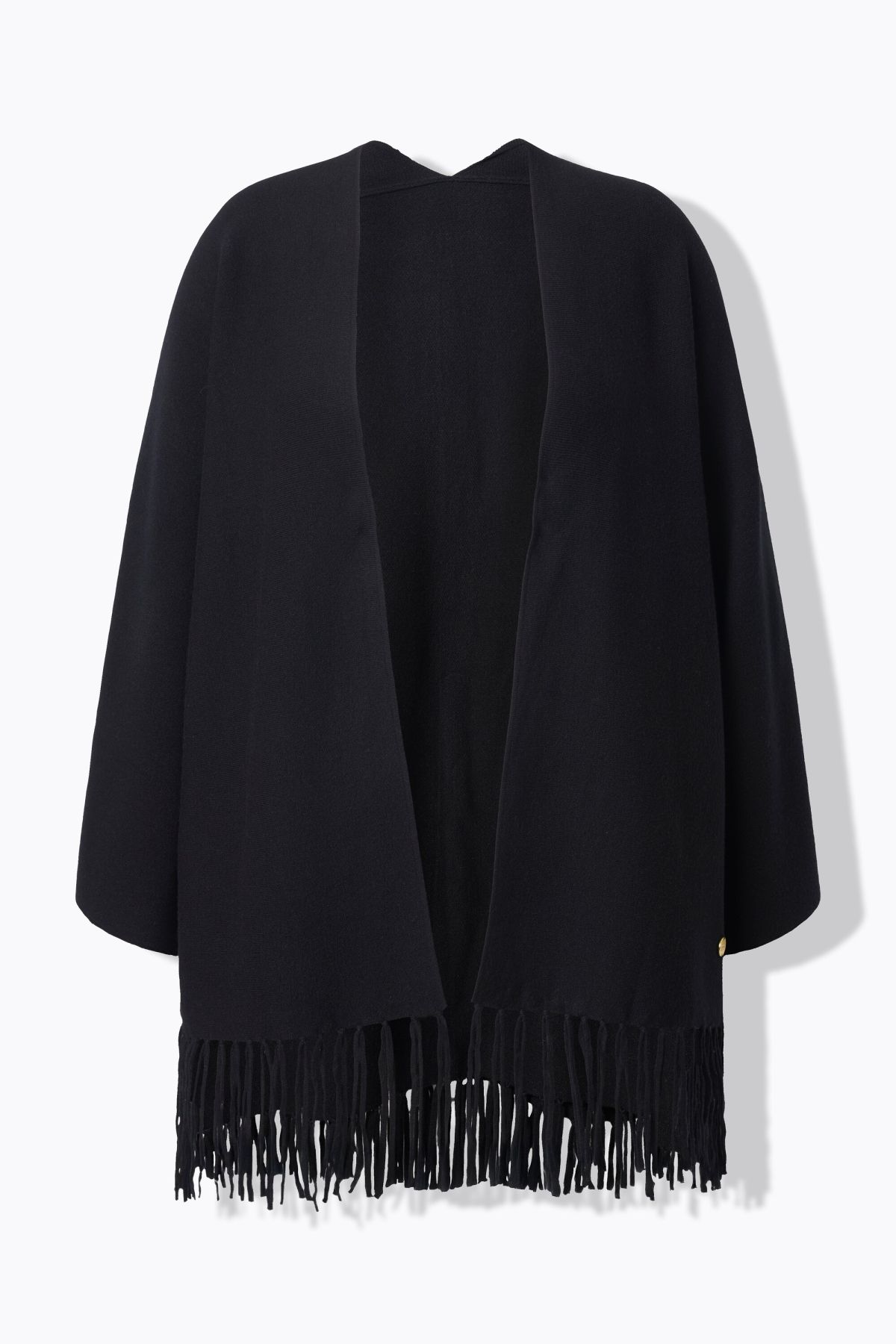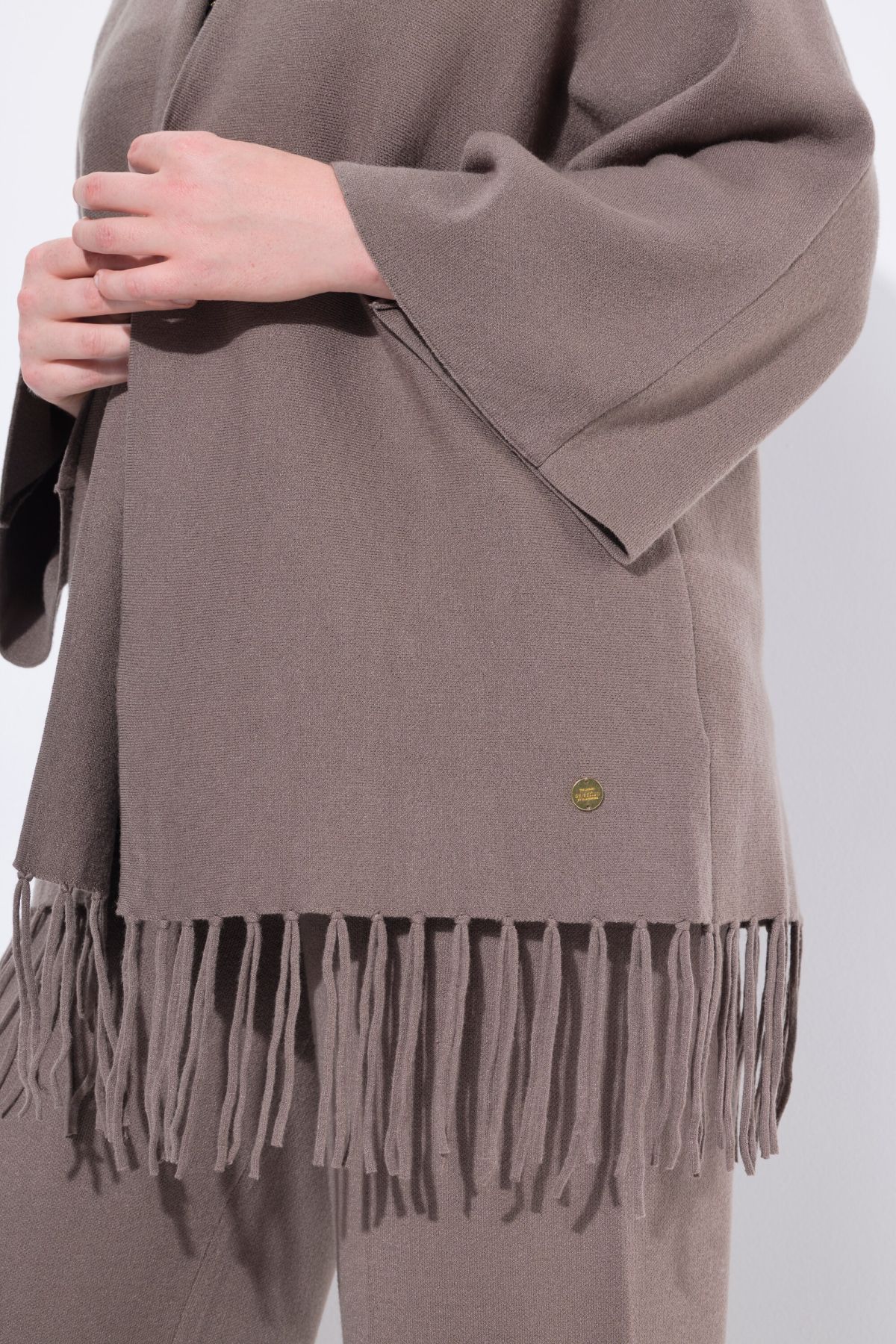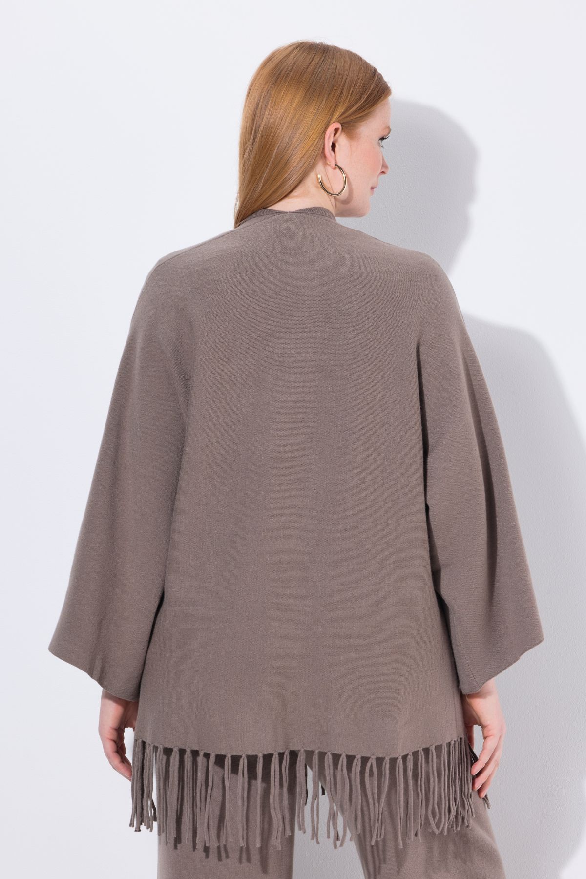 Плетена жилетка с модерни ресни на подгъва в бохо стил. С шал яка, отворена отпред и с дълги, широки ръкави.
