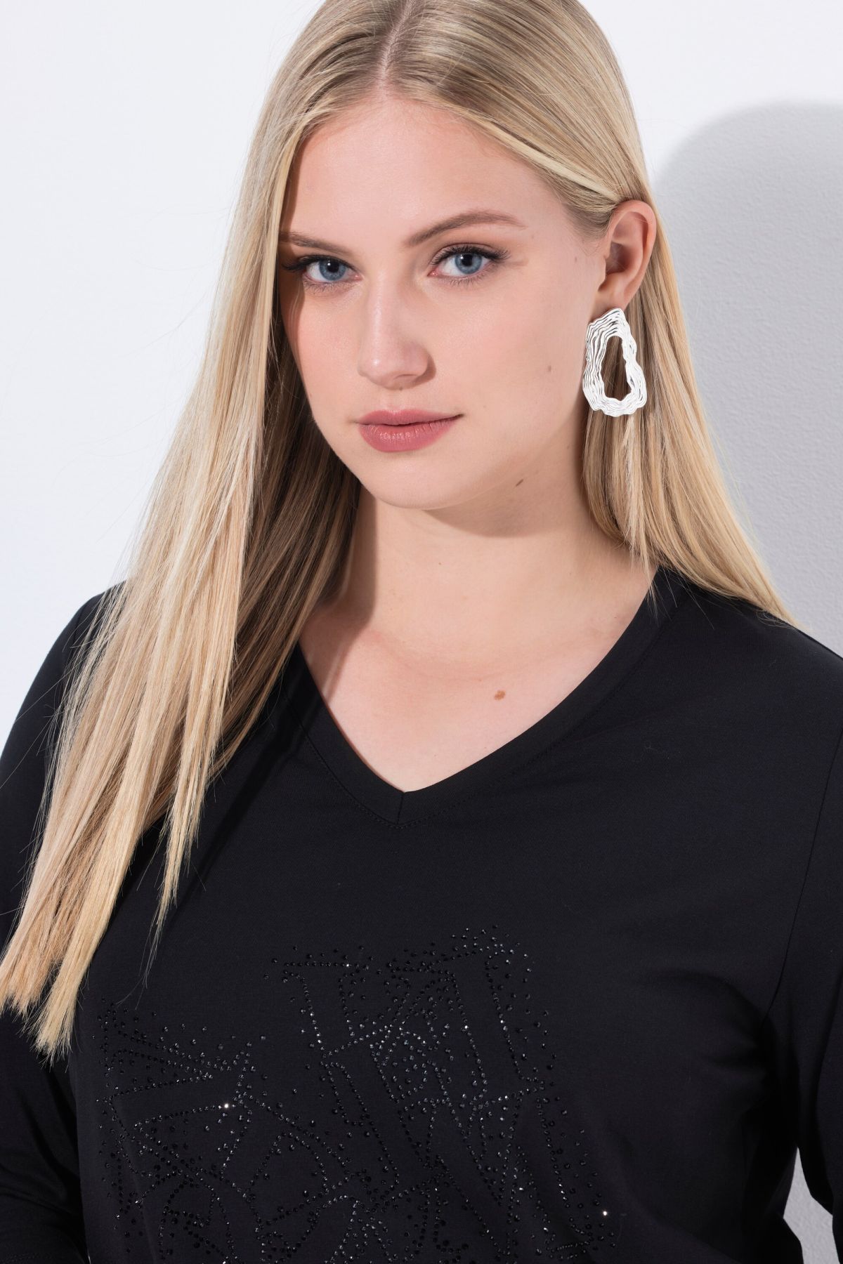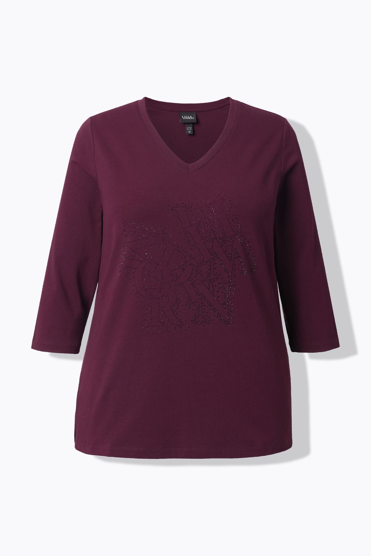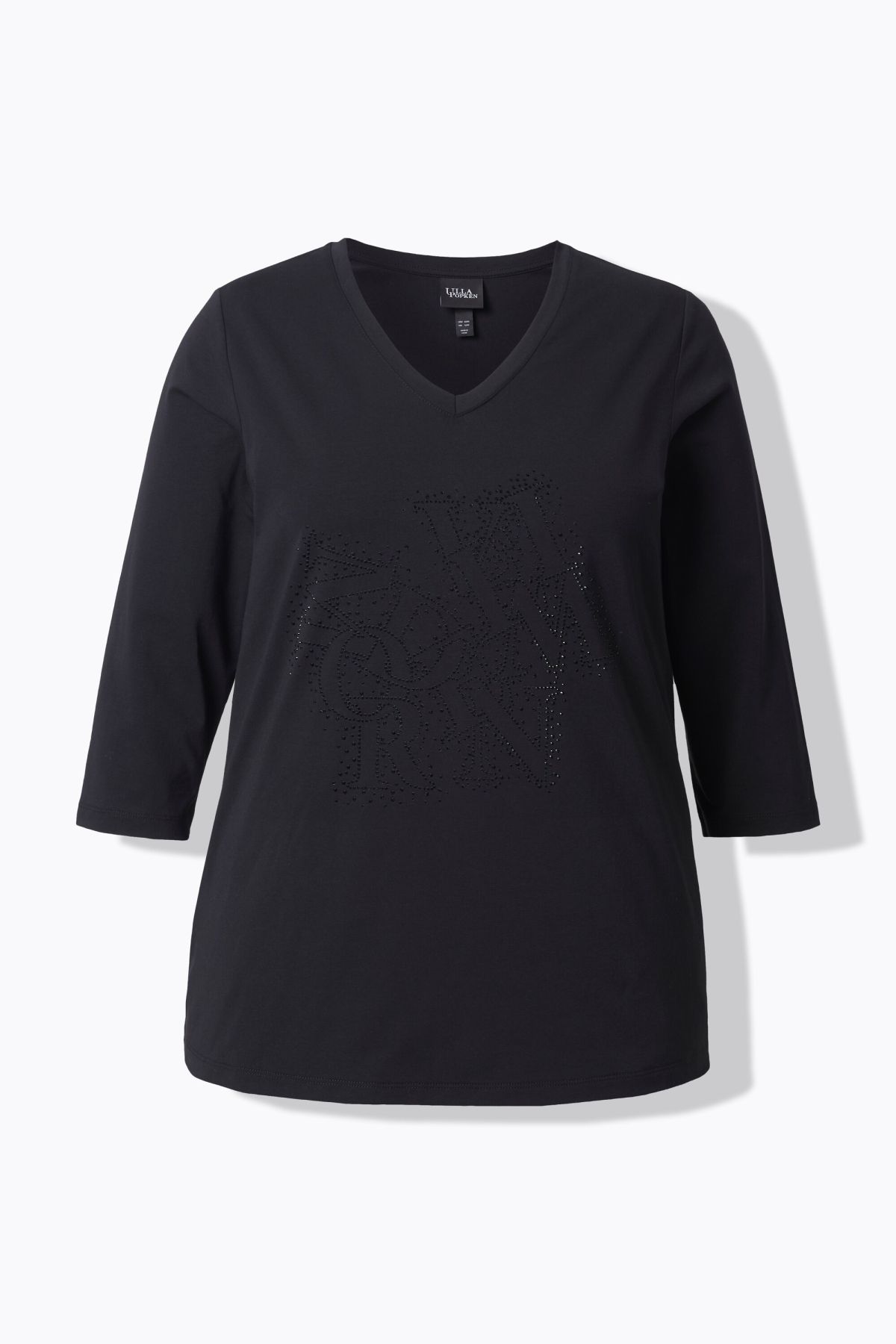Тениска с лого от декоративни, бляскави камъчета. С дълбоко кръгло деколте и 3/4 ръкави. Мека и комфортна за ежедневието.