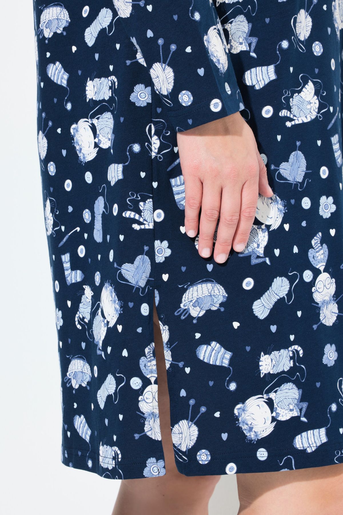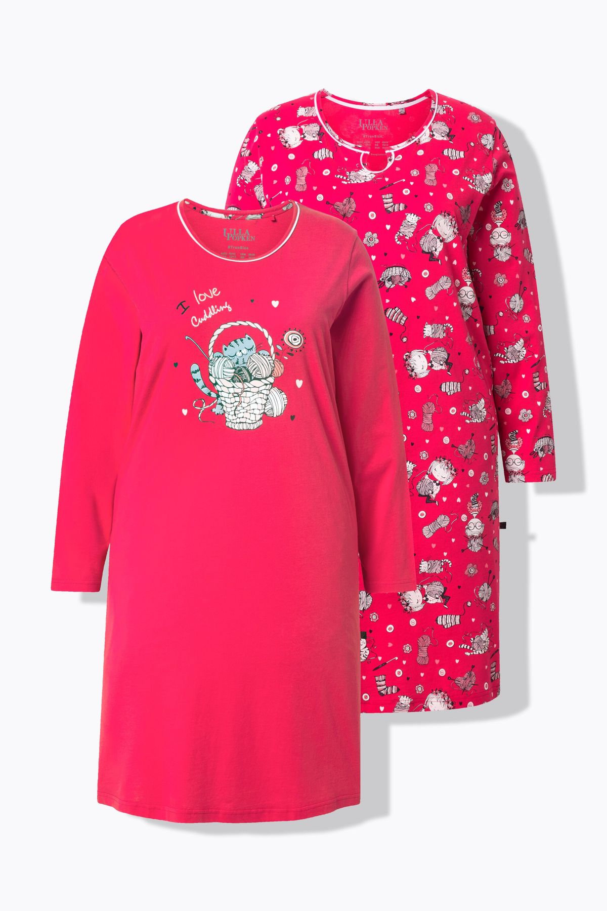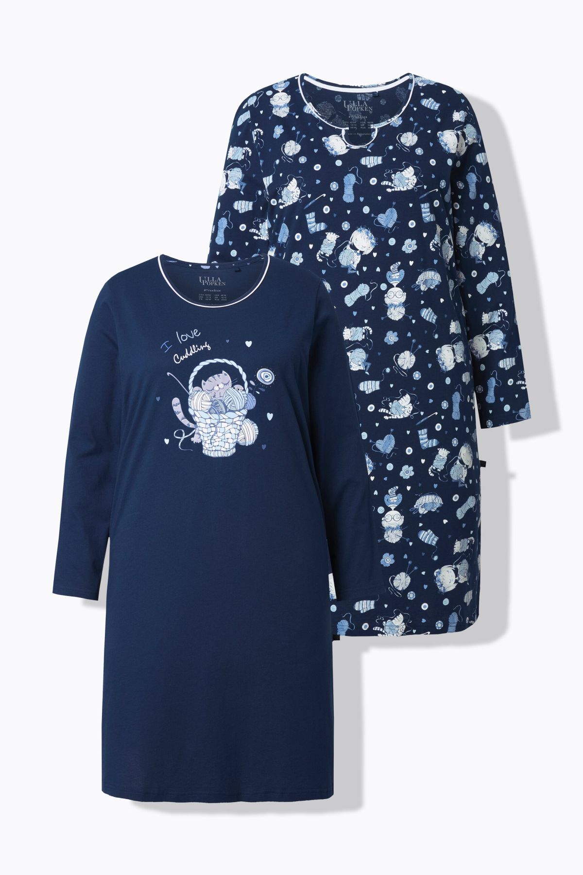 Комплект от 2 броя нощници - едната едноцветна с акцент на котка, а другата изцяло с принт на котки с кръгло деколте с цепка. И двете с 3/4 ръкави и странични цепки на подгъва