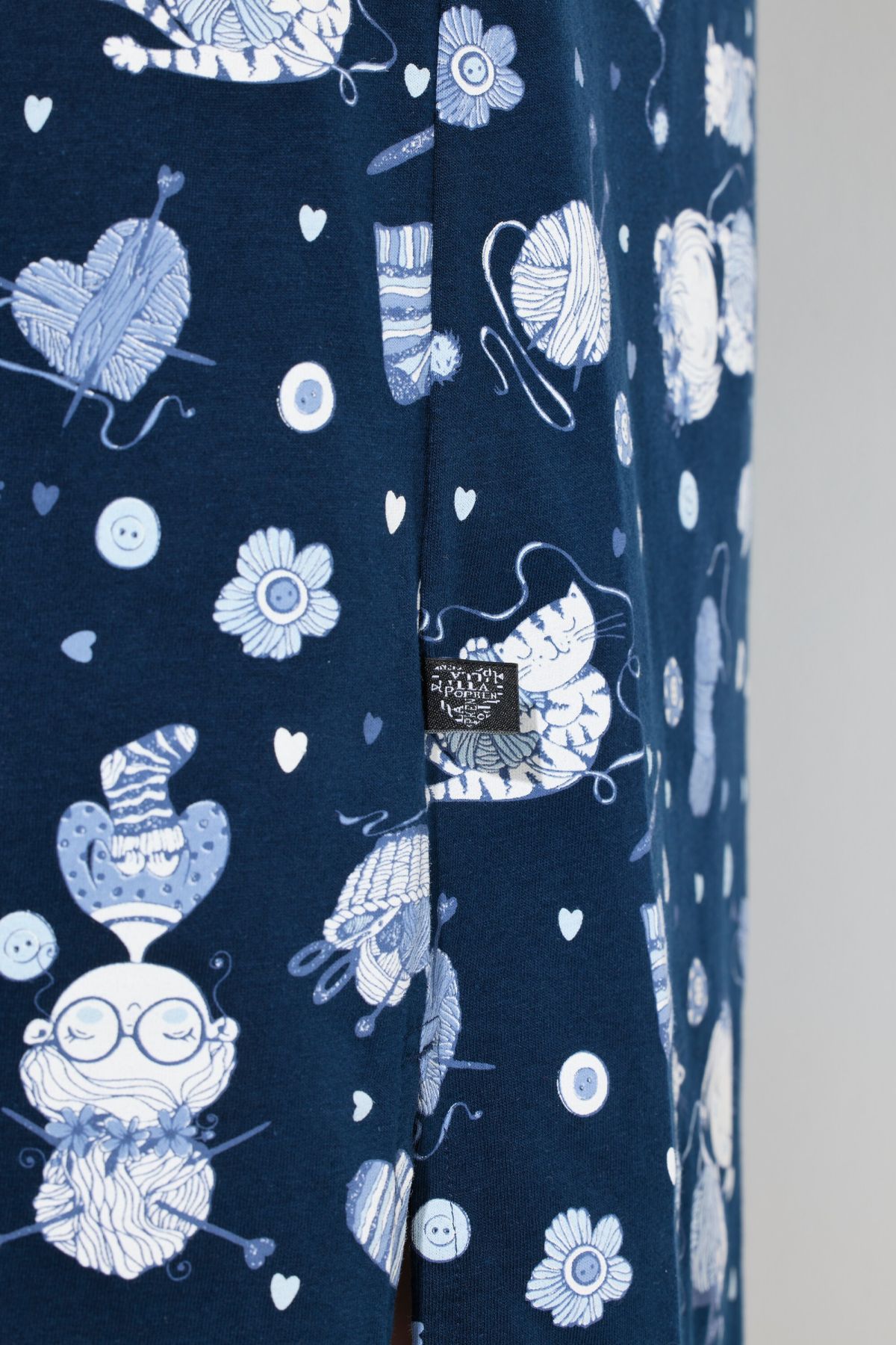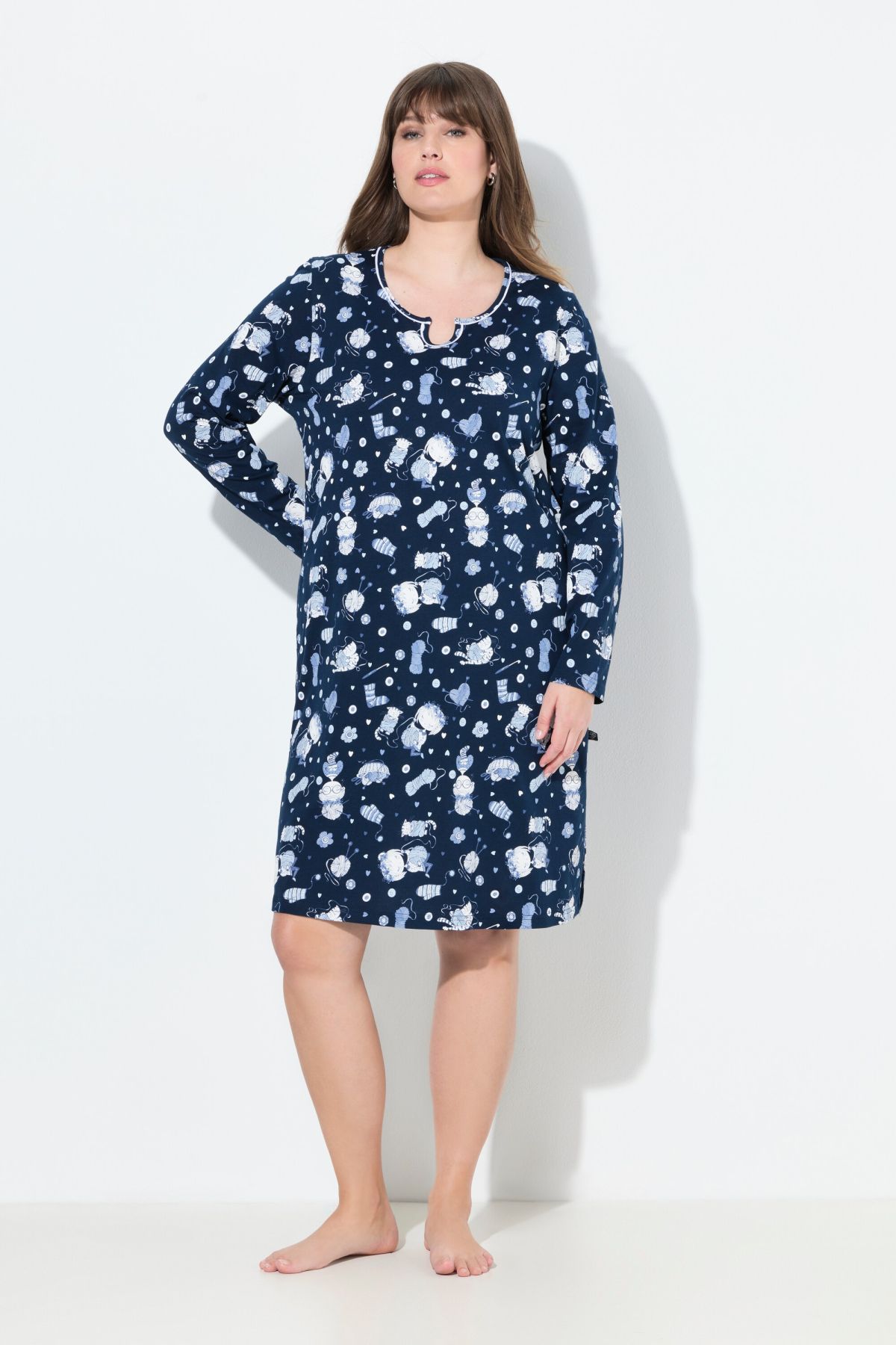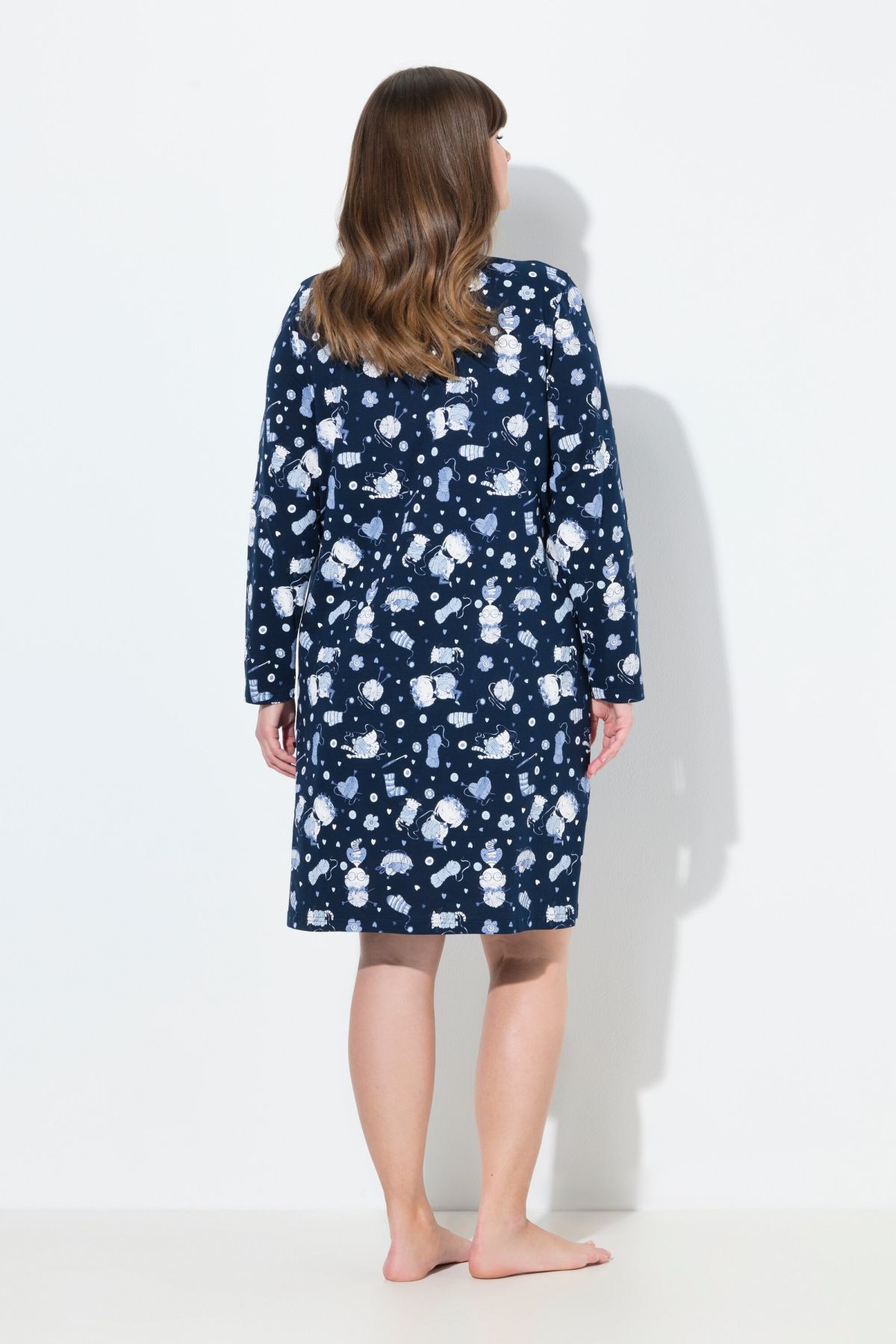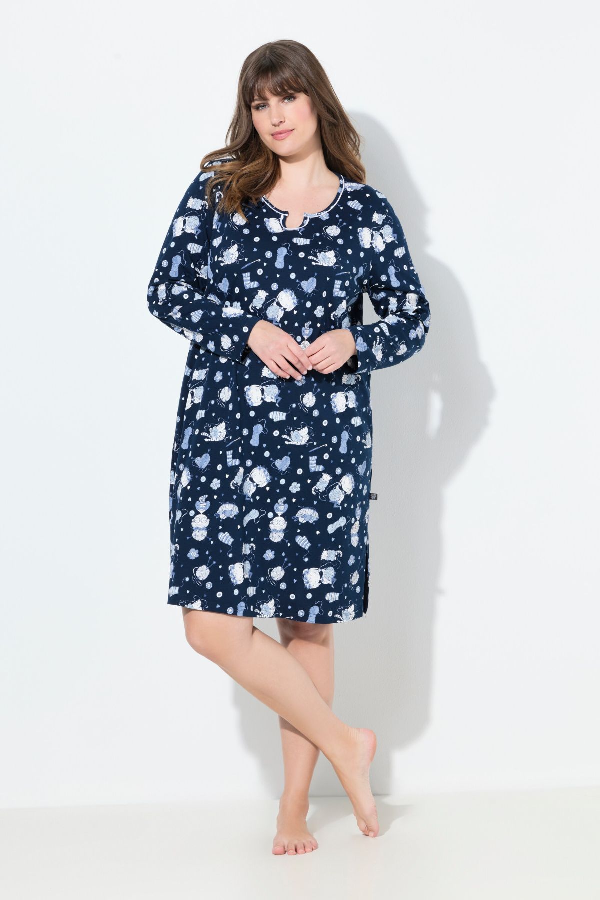 Комплект от 2 броя нощници - едната едноцветна с акцент на котка, а другата изцяло с принт на котки с кръгло деколте с цепка. И двете с 3/4 ръкави и странични цепки на подгъва
