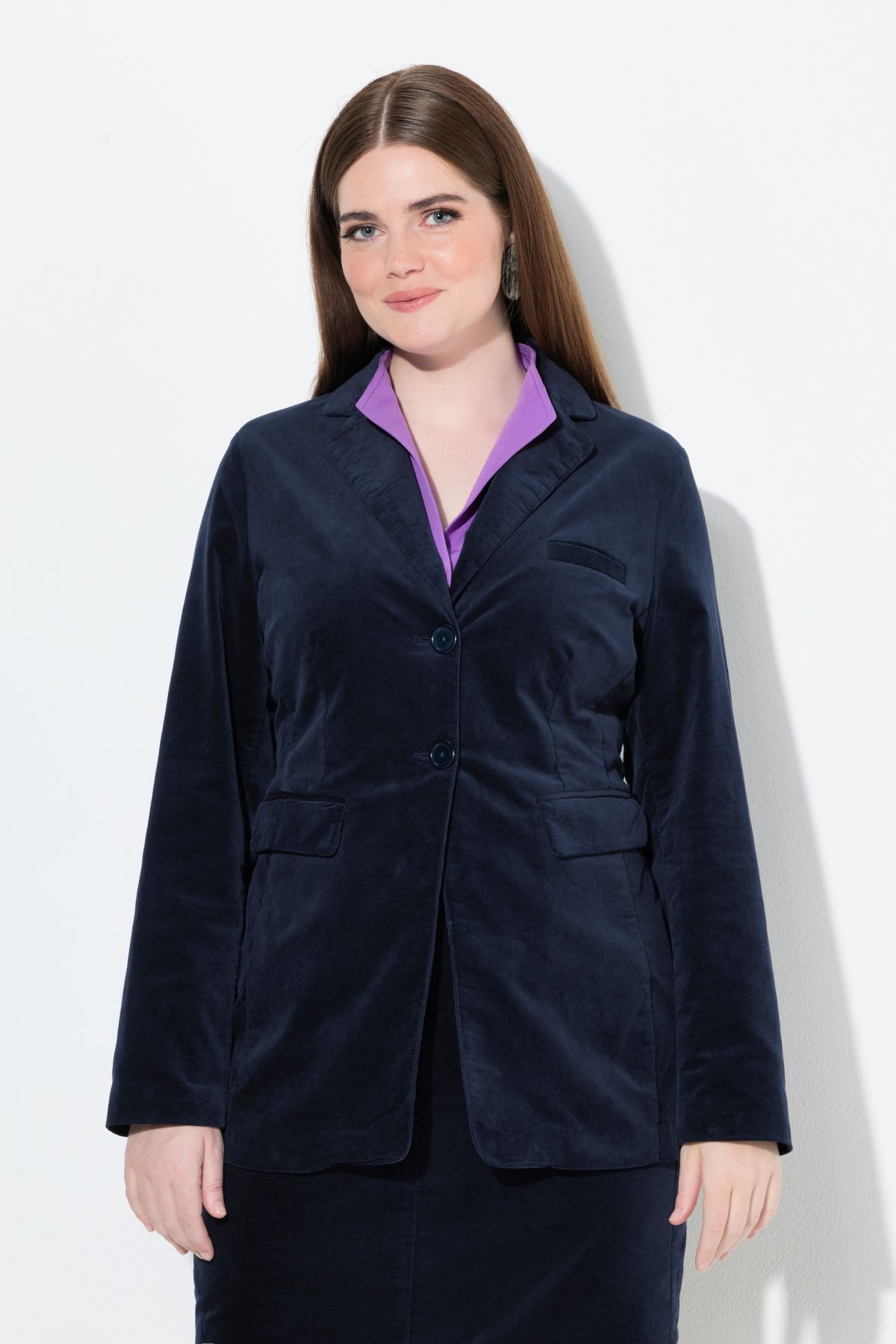 Блейзър от кадифена материя. Луксозен, топъл и стилен. С яка с ревери, копче отпред, странични джобове с капаци и такъв на гърдите. С дълги ръкави.
