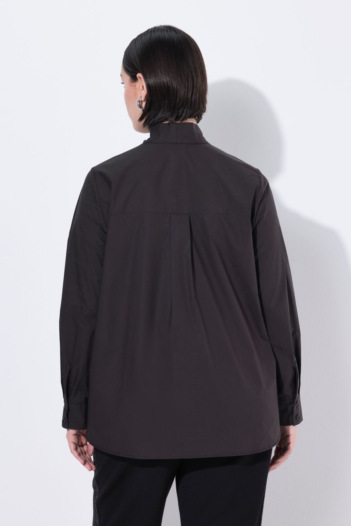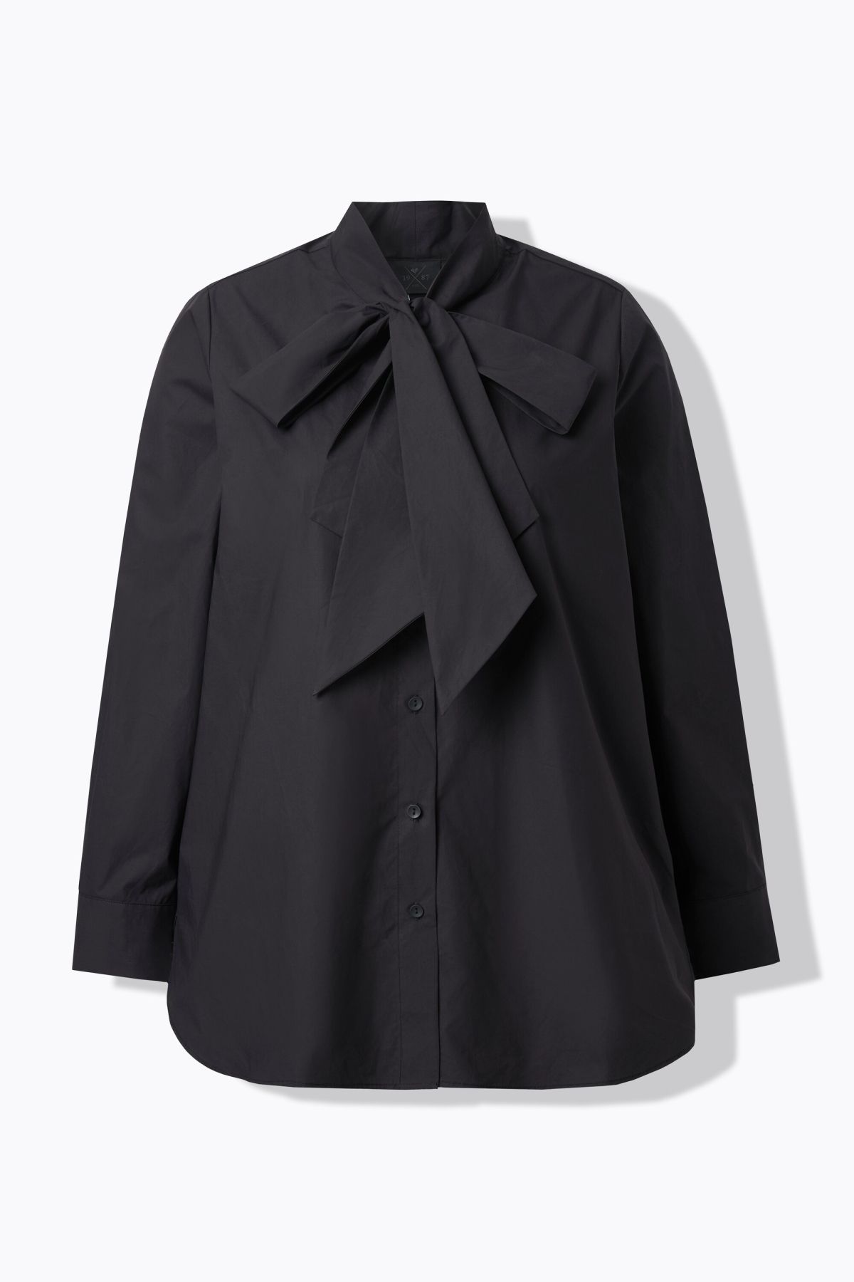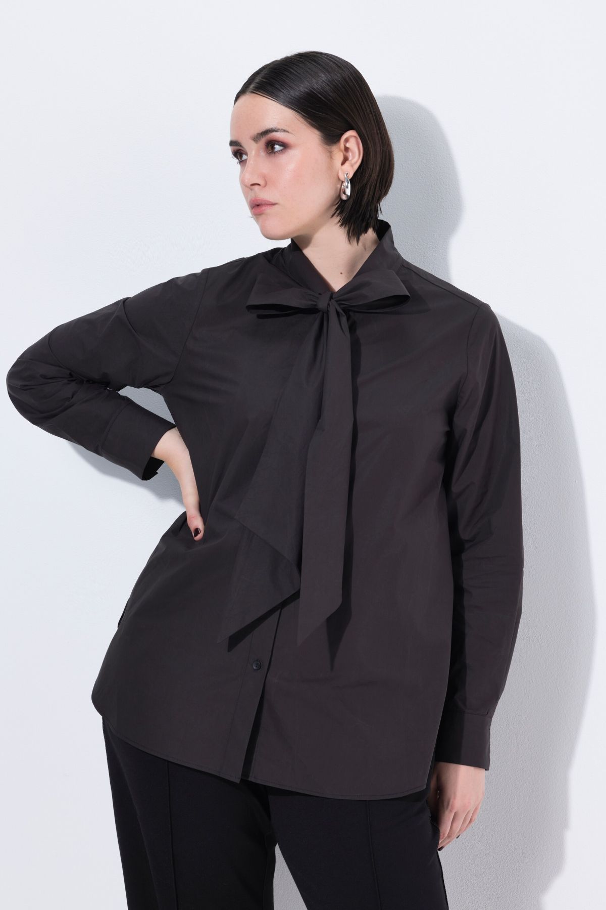 Риза с елегантна визия с дълги ръкави и стилна панделка на деколтето. С копчета отпред и дълги ръкави с маншет с копче.