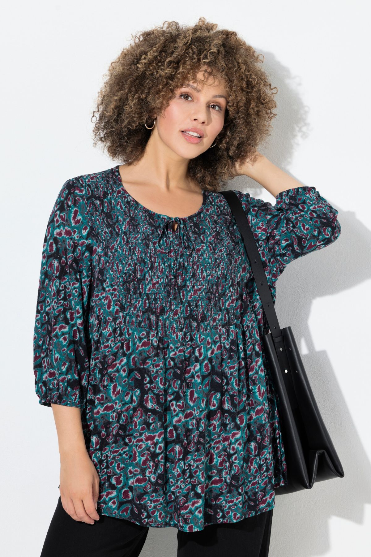 Туника с графичен принт с набран еластичен акцент на бюста. С кръгло деколте и 3/4 ръкави с еластичен маншет.
