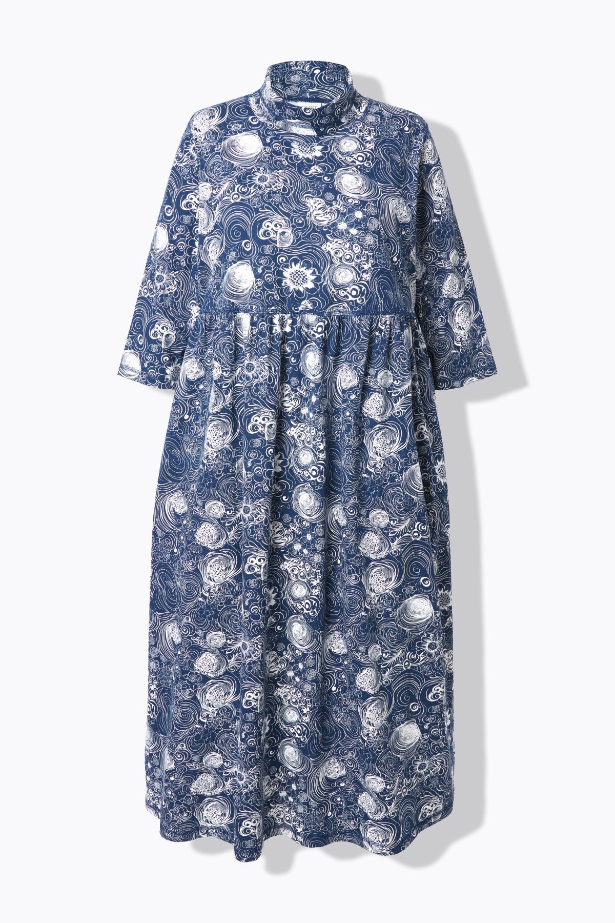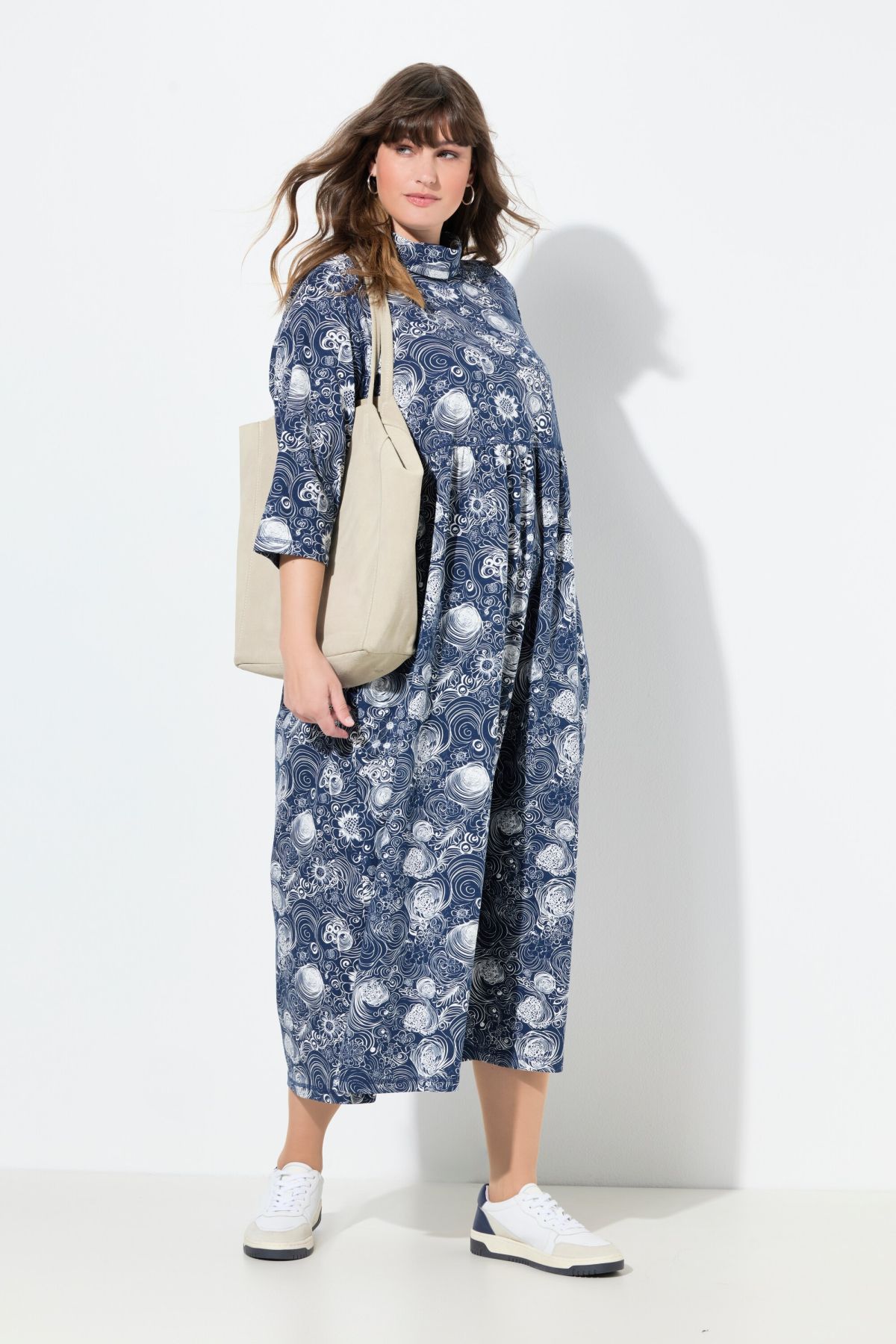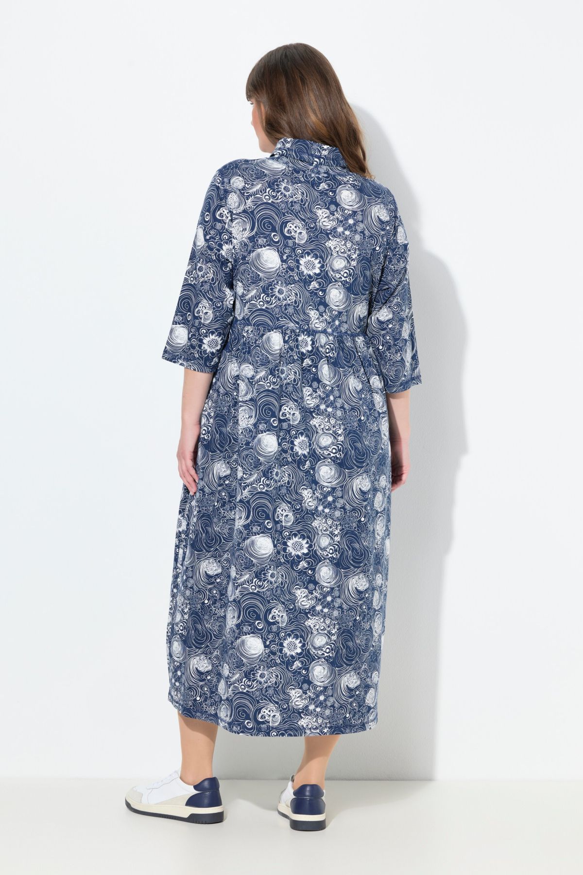 Рокля с принт на рози с широк, разкроен силует. С висока поло яка, 3/4 ръкави и издължена кройка. ОТ мека, памучна материя.