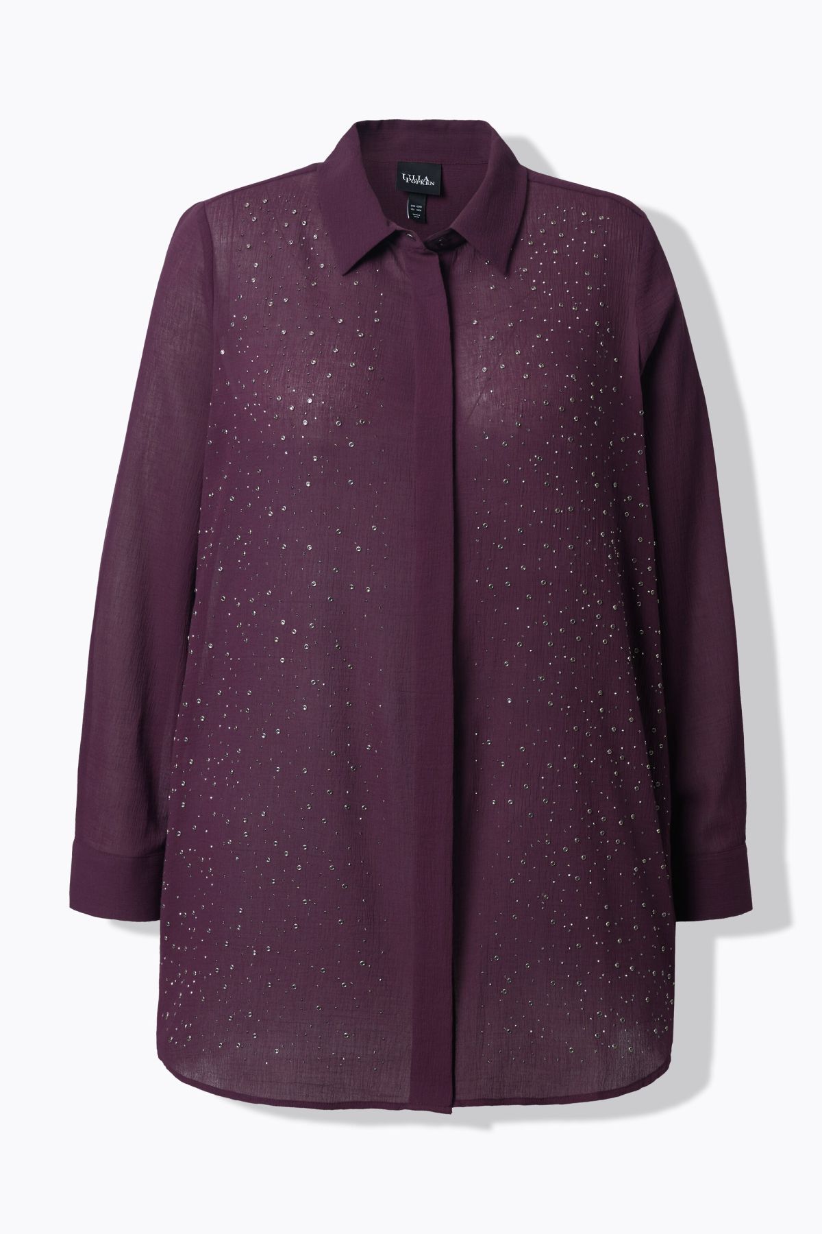 Риза с бляскави камъчета за акценти. С малка изправена яка, копчета отпред и дълги ръкави с маншет с копче. Със заоблен подгъв.
