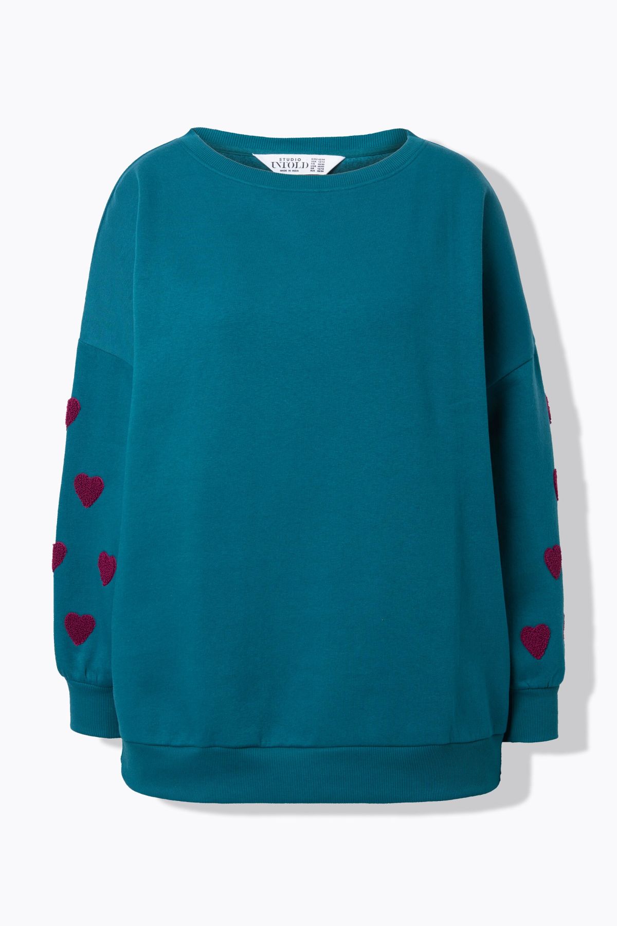 Суитчър с модерен акцент от бродирани сърца от плюшена материя. С кръгло деколте и дълги ръкави. Стил и комфорт в ежедневието.